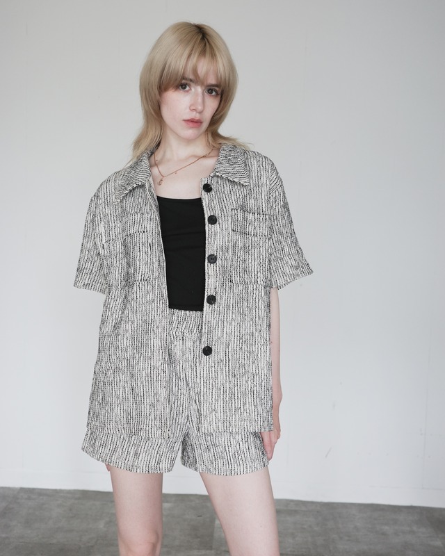 お届け目安:オーダーから約25日 _____________________________________________________________________________ 静かな強さを、軽やかに纏う。 凛としたムードとリラックス感を両立した、ショートジャケット&ショーツのツイードセットアップ。 モノトーンのラインが繊細に交差する表情豊かなツイード素材に、ゆるやかなAラインのシルエットが重なり、きちんと感のなかにやわらかさを宿します。 ブラックタンクなどのインナー合わせで抜け感をプラスすれば、モードと抜けの絶妙なバランスに。セットアップでの着用はもちろん、単品使いでもスタイリングの幅が広がる一着です。 ・ランダムに流れるようなストライプツイード素材を使用 ・ヒップまで隠れる着丈のショートジャケット ・ショートパンツは後ろウエストゴム仕様でストレスフリーな着心地 ・モノトーン配色が甘すぎず、洗練された印象に ・セットアップでも単品でも着回し可能 透け感:なし 裏地:なし 伸縮性:なし 生地の厚さ:厚め -COMPOSITION- COTTON:55% POLYESTER:45% -SIZE- <Jacket> 着丈:68cm 身幅:53cm 肩幅:43cm 袖丈:22cm <Pants> 着丈:38cm ウエスト:31cm(ゴム上がり) 股下:7cm わたり:32cm 着用モデル身長:167cm ※こちらはセレクト商品になります。 海外発送のため、受注時の在庫状況によっては完売の可能性もございます。 国内の検品所にて検品を行っておりますが、細かい糸のほつれなど縫製の粗い部分もございます。予めご了承ください。 ※閲覧環境によって、実際の色味と異なって見える場合がございます。予めご了承ください。 ※布製品の特性上、表記サイズは目安としてご参照ください。 ※画像の商品はサンプルの為、実際の商品と色味、仕様、加工、サイズ、素材等が若干異なる場合がございます。 品番:302250366