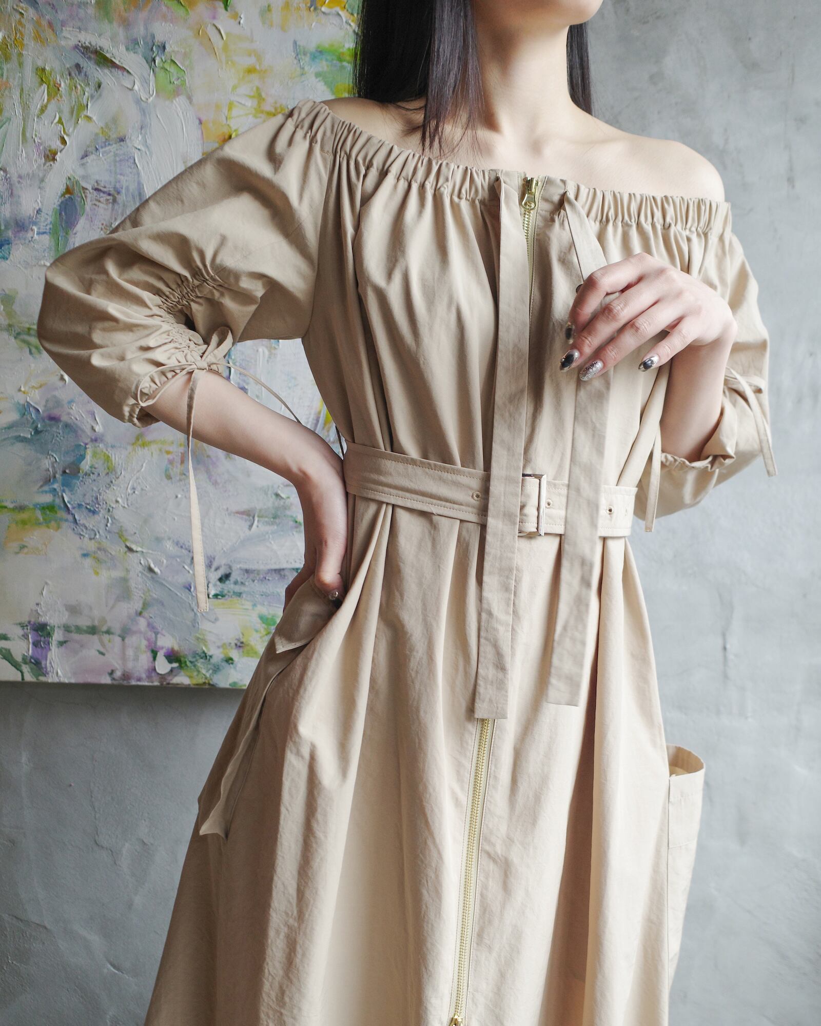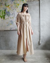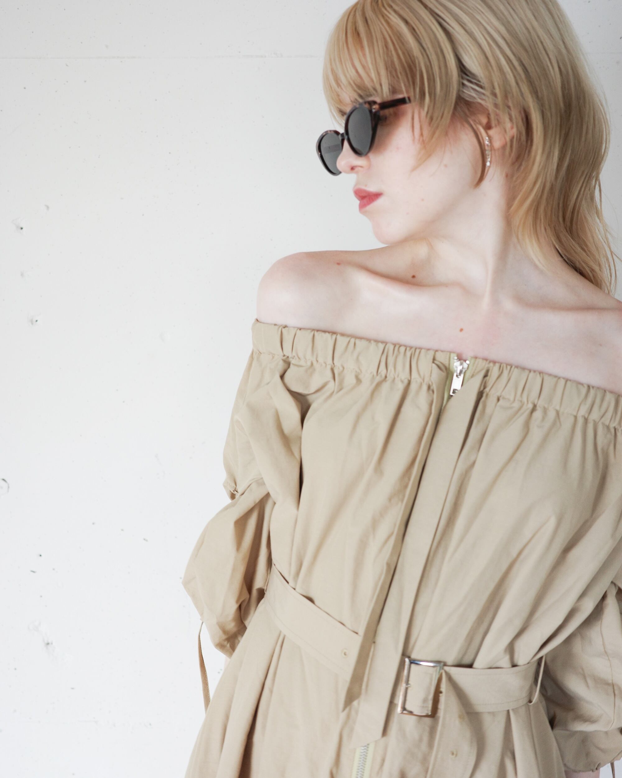 ・肩を美しく見せる、オフショルダーデザイン(胸元にはゴールドのドットボタン)