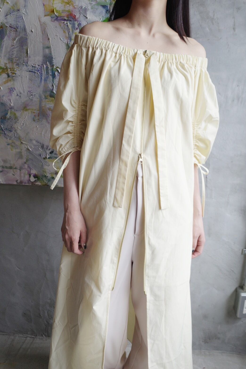 オフショルダーのネックラインと、袖のギャザーデザインが動きに表情を添え、
