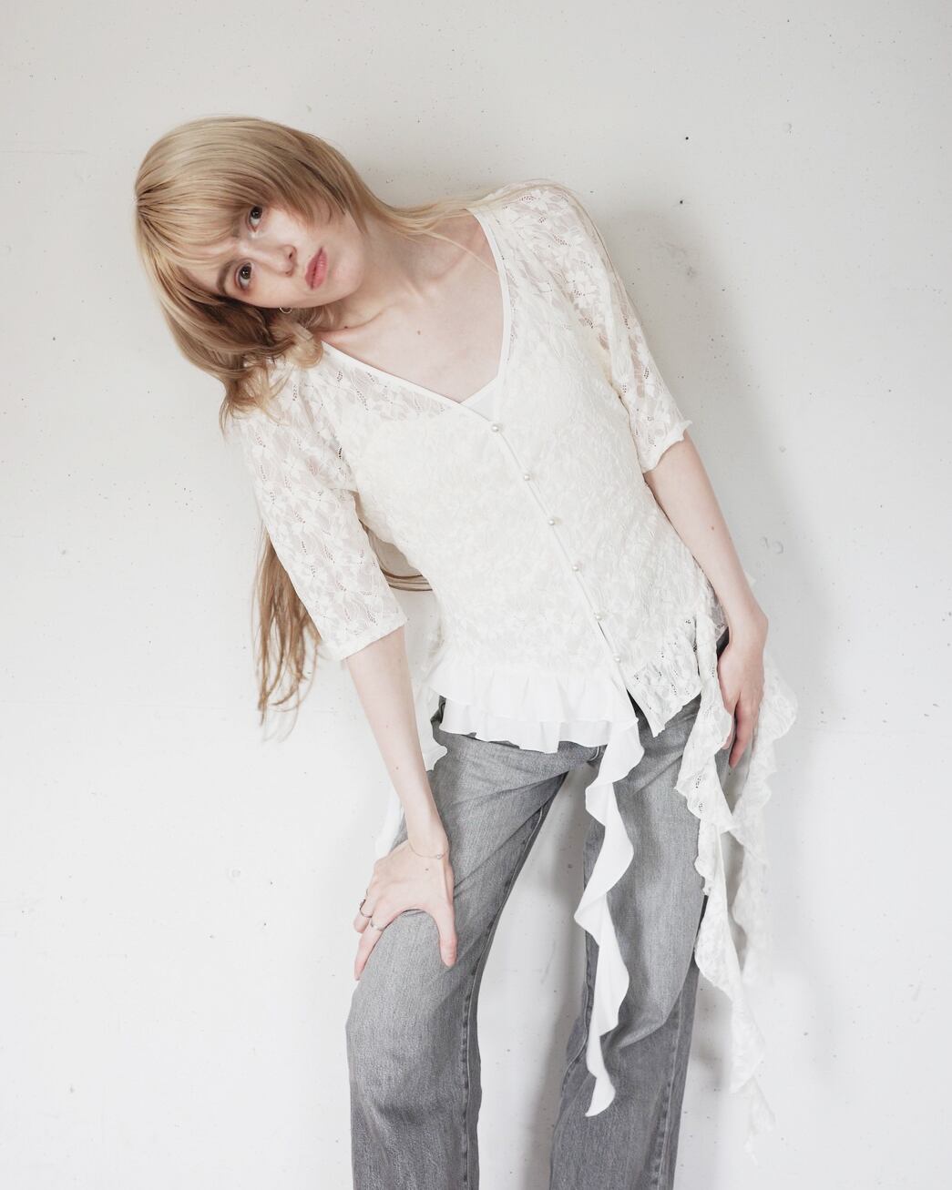 繊細なレースの上を、波のようにフリルが踊る。