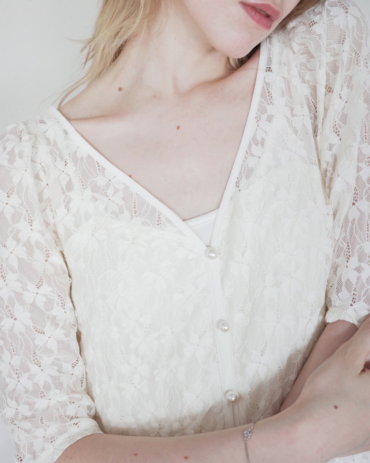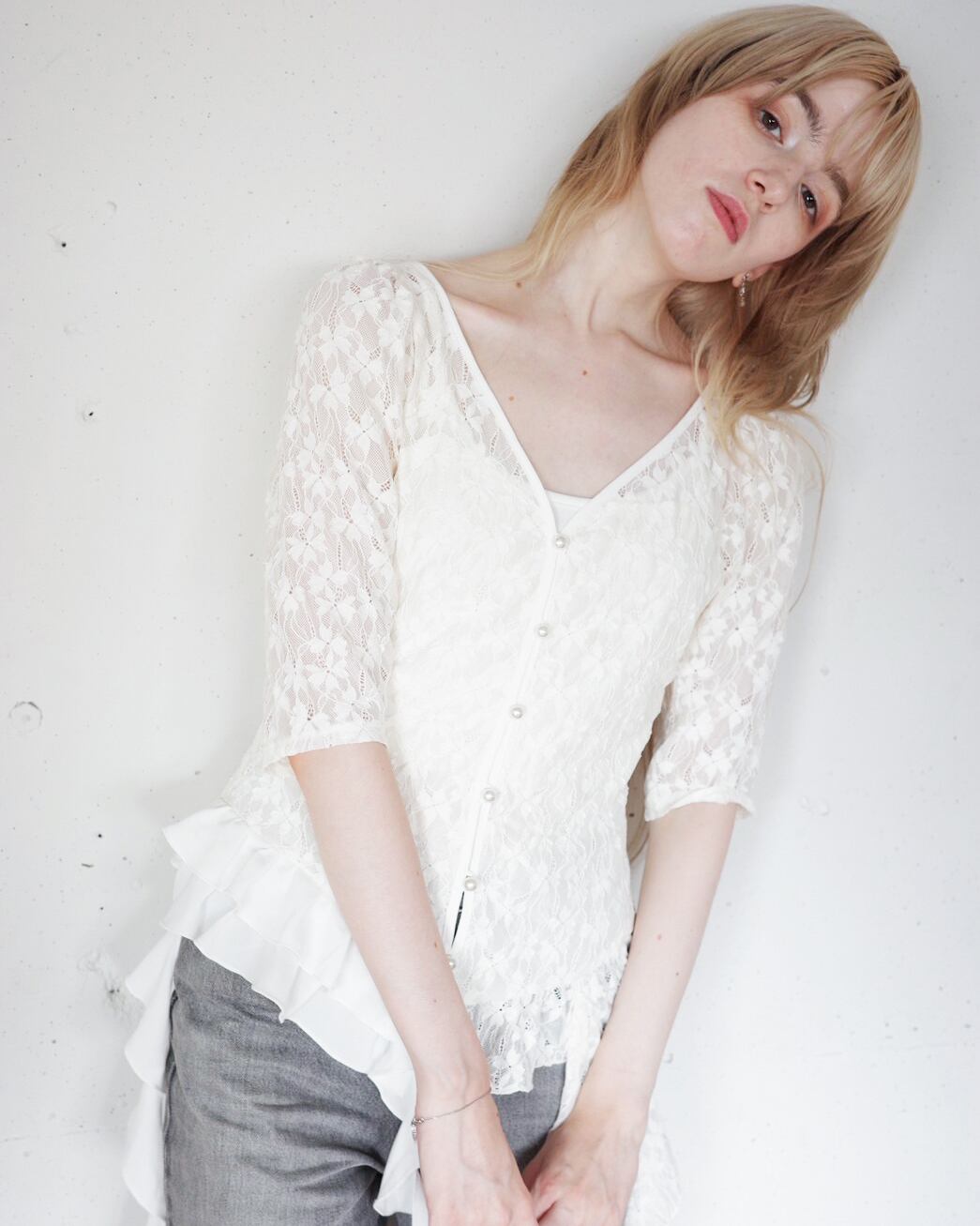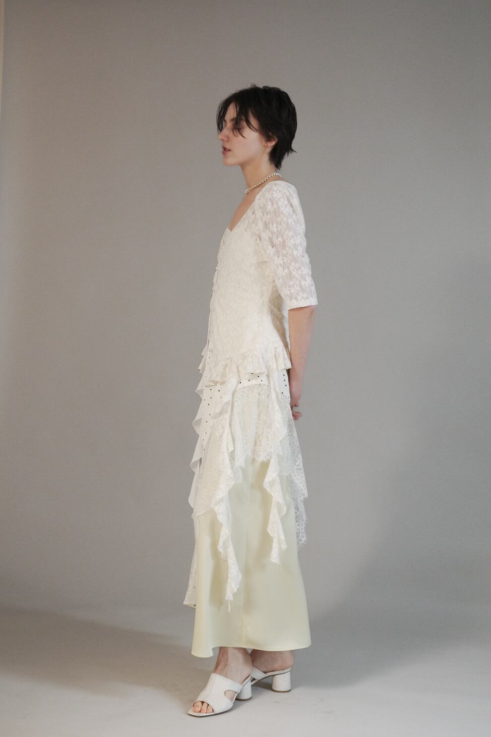 カットレースの柔らかさと、シフォンフリルの揺らぎが重なって、