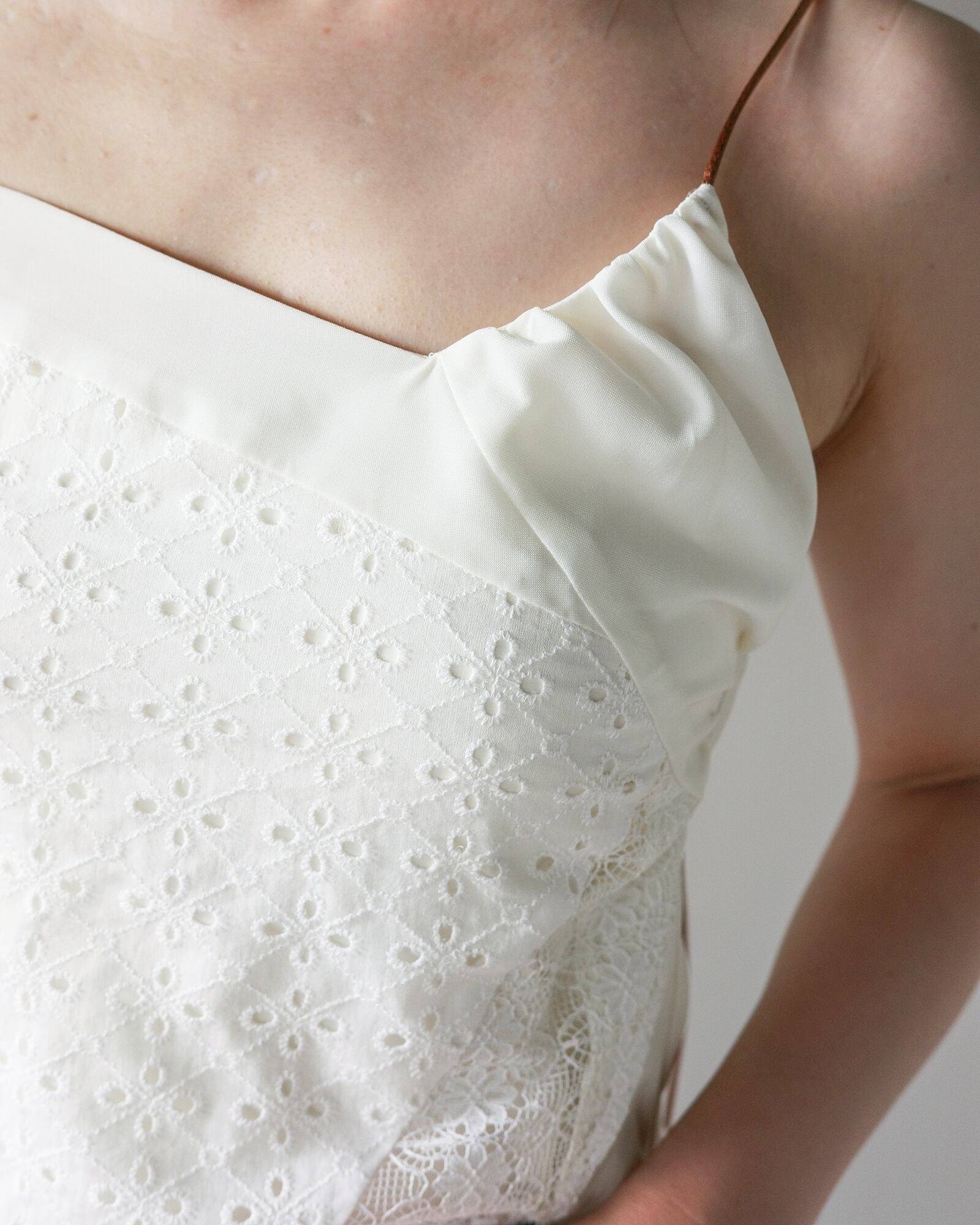 異なる柄のレースを組み合わせ、アシンメトリーな構成に仕上げることで、甘さに一筋の芯を通しました。