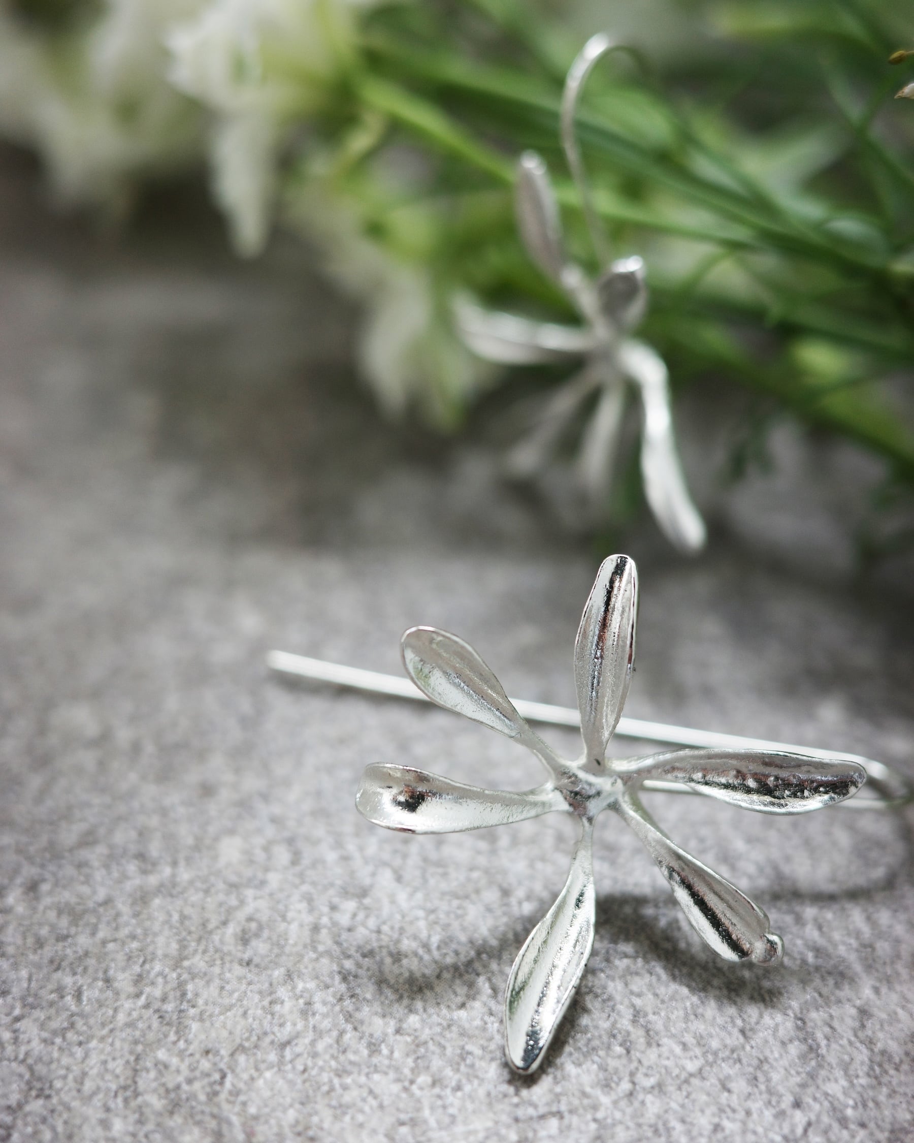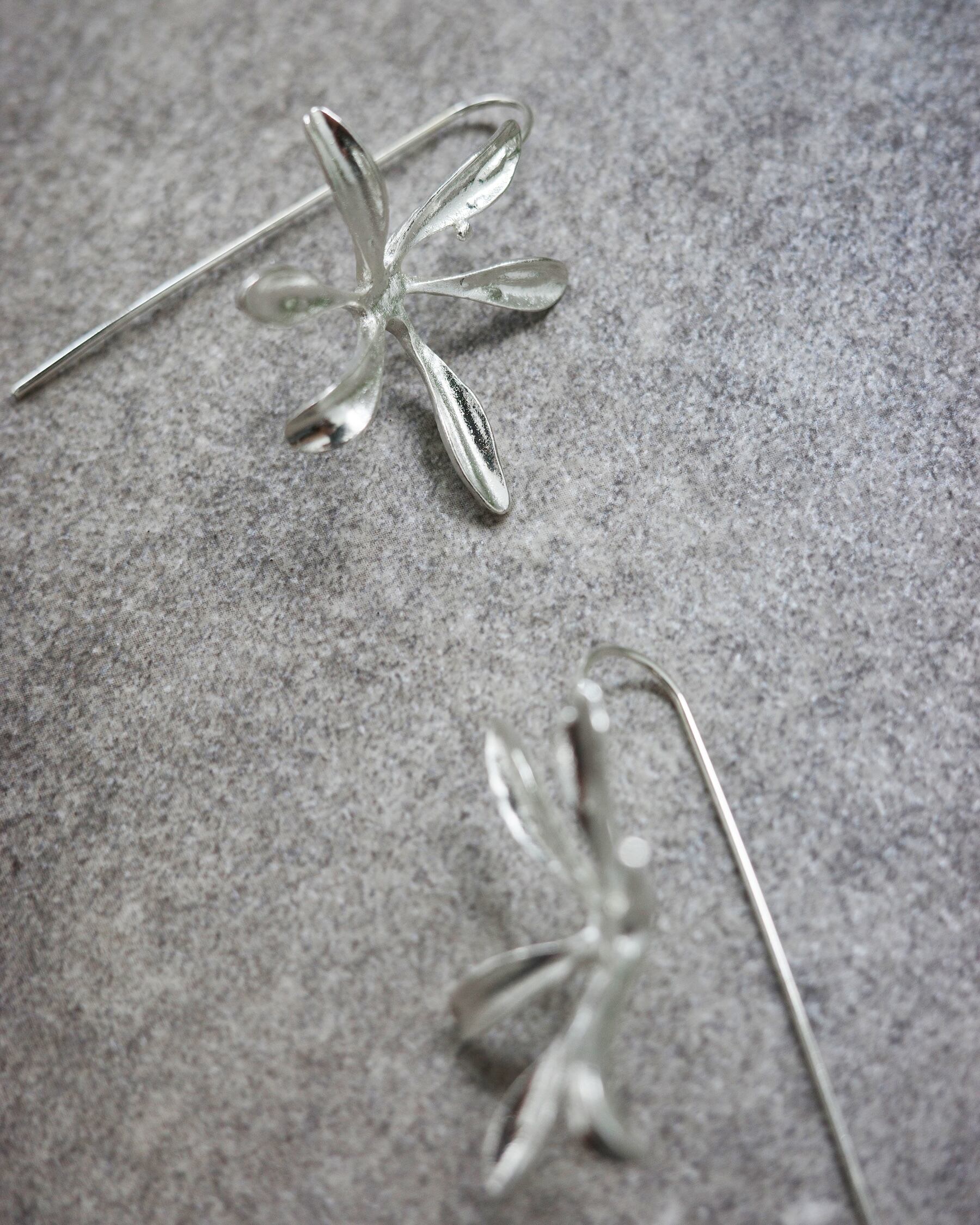 花びら一枚一枚をやわらかな表情で象った、シルバーカラーのフラワーモチーフピアス。