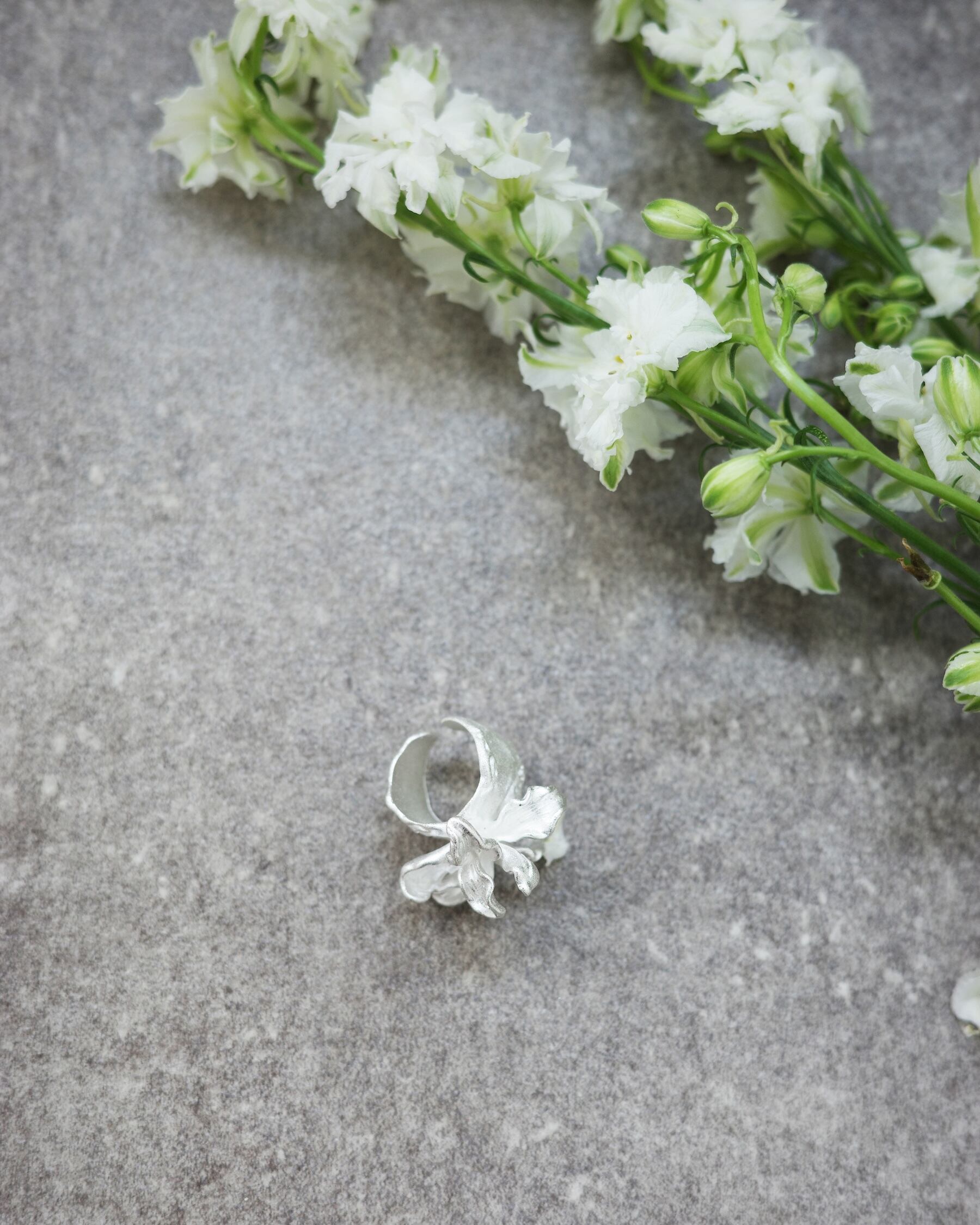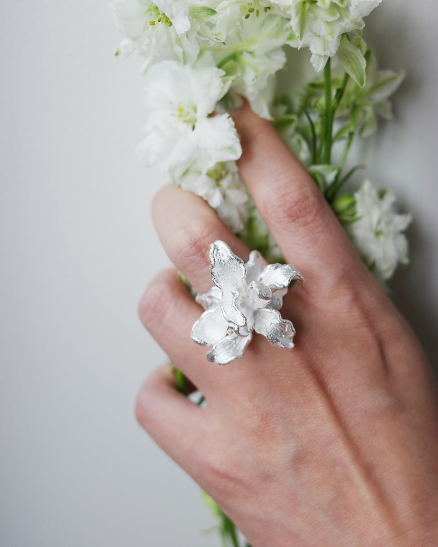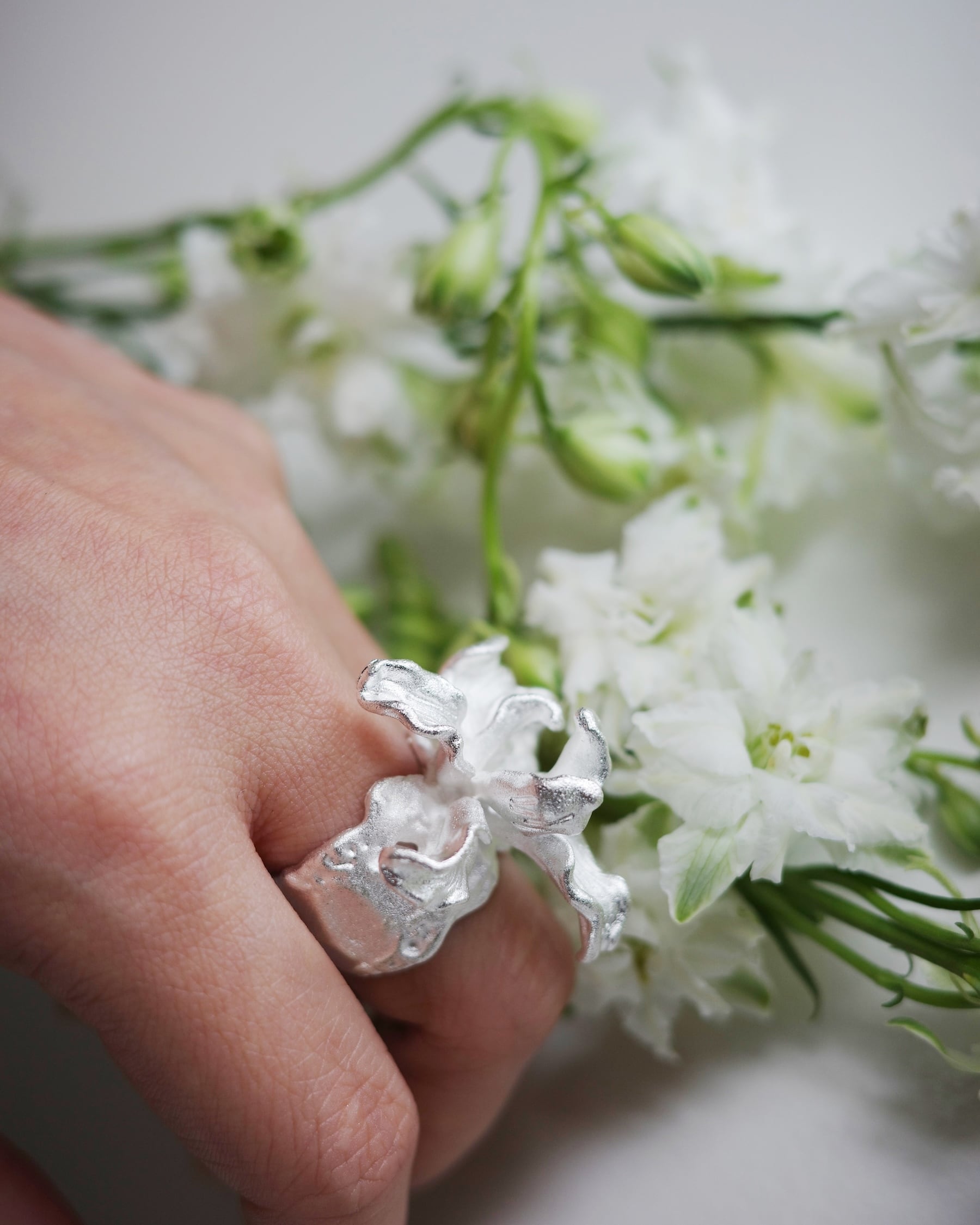 まるで霜に覆われたアマリリスがそのまま指先に咲いたような、凛とした存在感を放つリング。