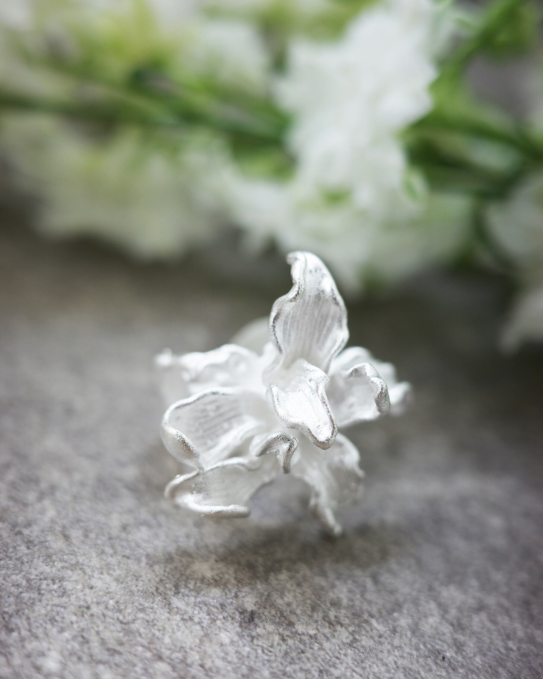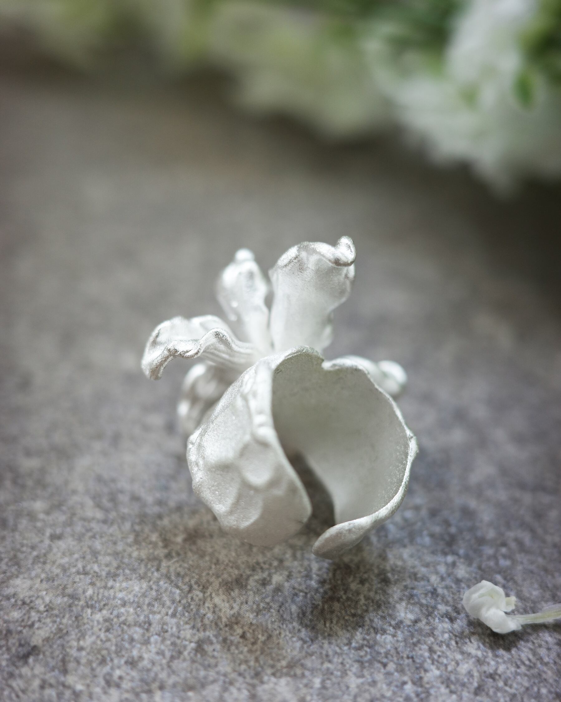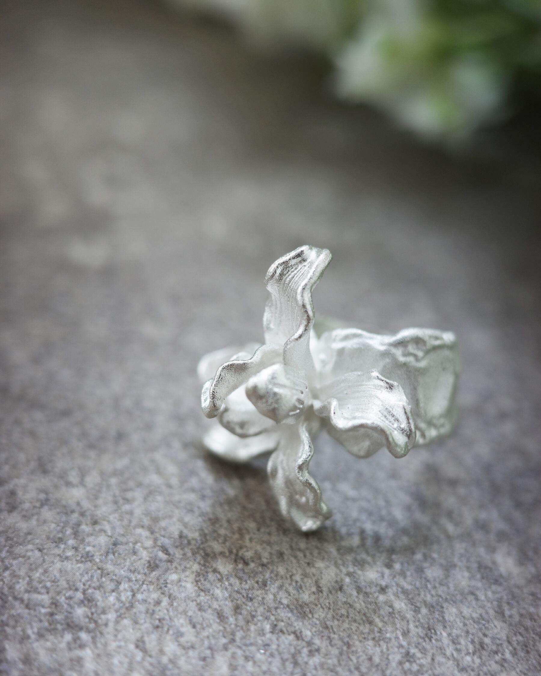 波打つ花びらの立体感や、マットな質感のシルバーが、手元に静かな強さを宿します。