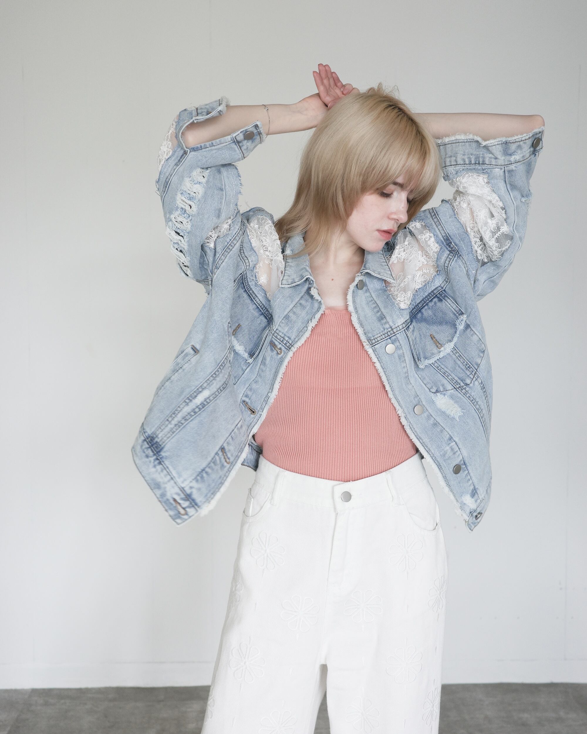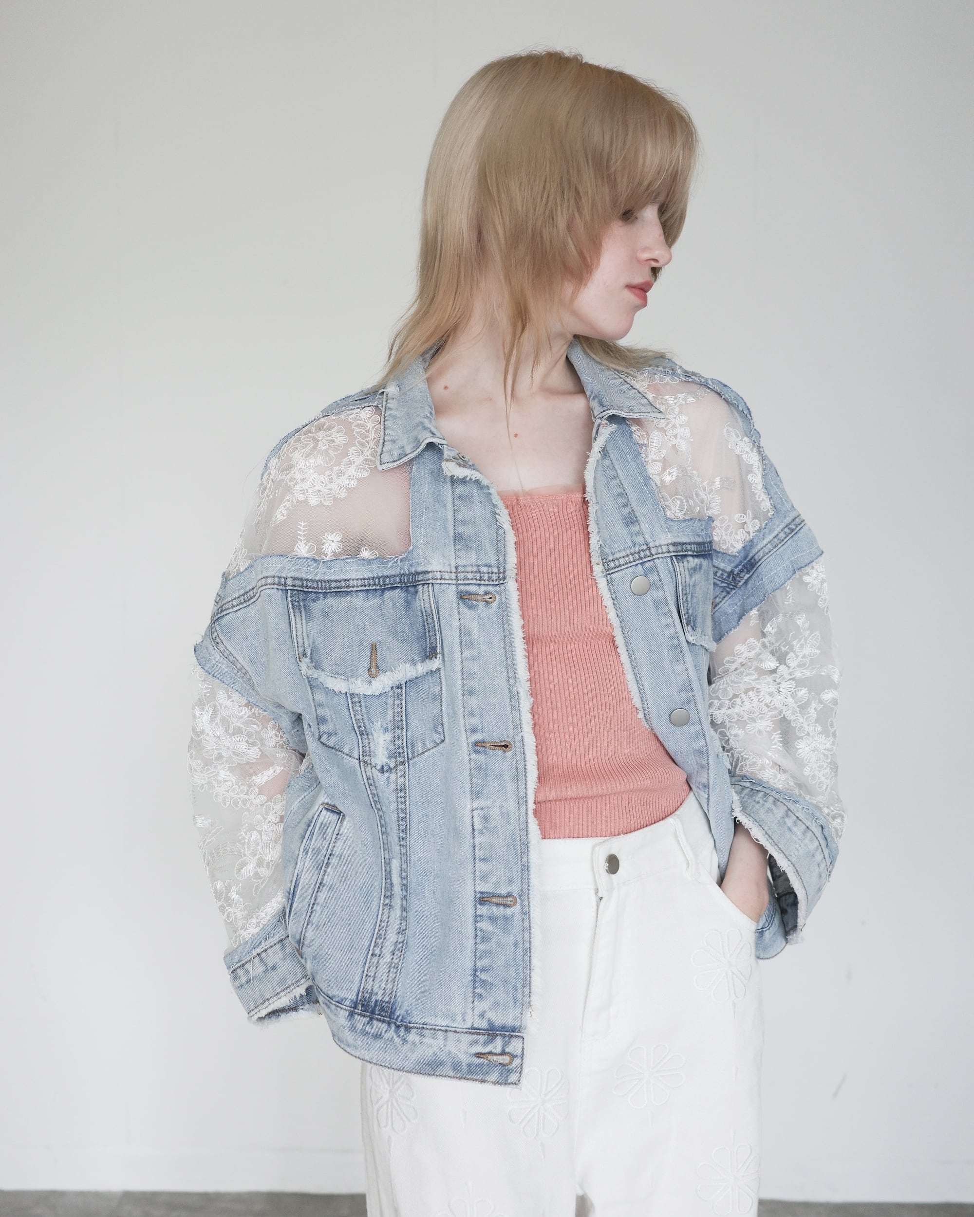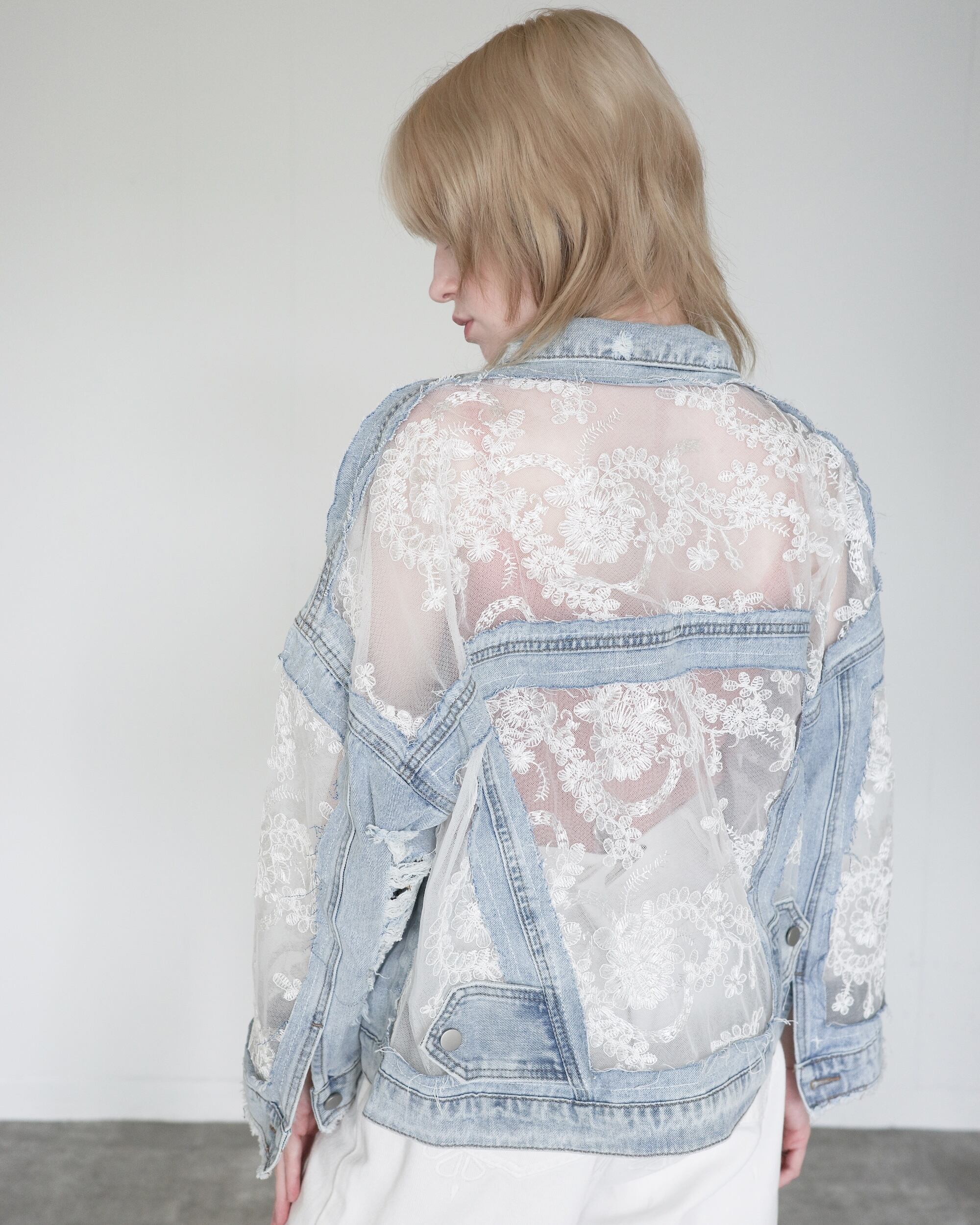 レースの繊細さとデニムのタフさが、静かにぶつかり合いながら調和する一着。透け感のある刺繍チュールを背面と袖に大胆にあしらい、ラフにカットオフされたデニムとのコントラストが視覚に残るジャケットです。春先から秋口まで、Tシャツやニットの上に羽織るだけで、主役級の存在感を放ちます。