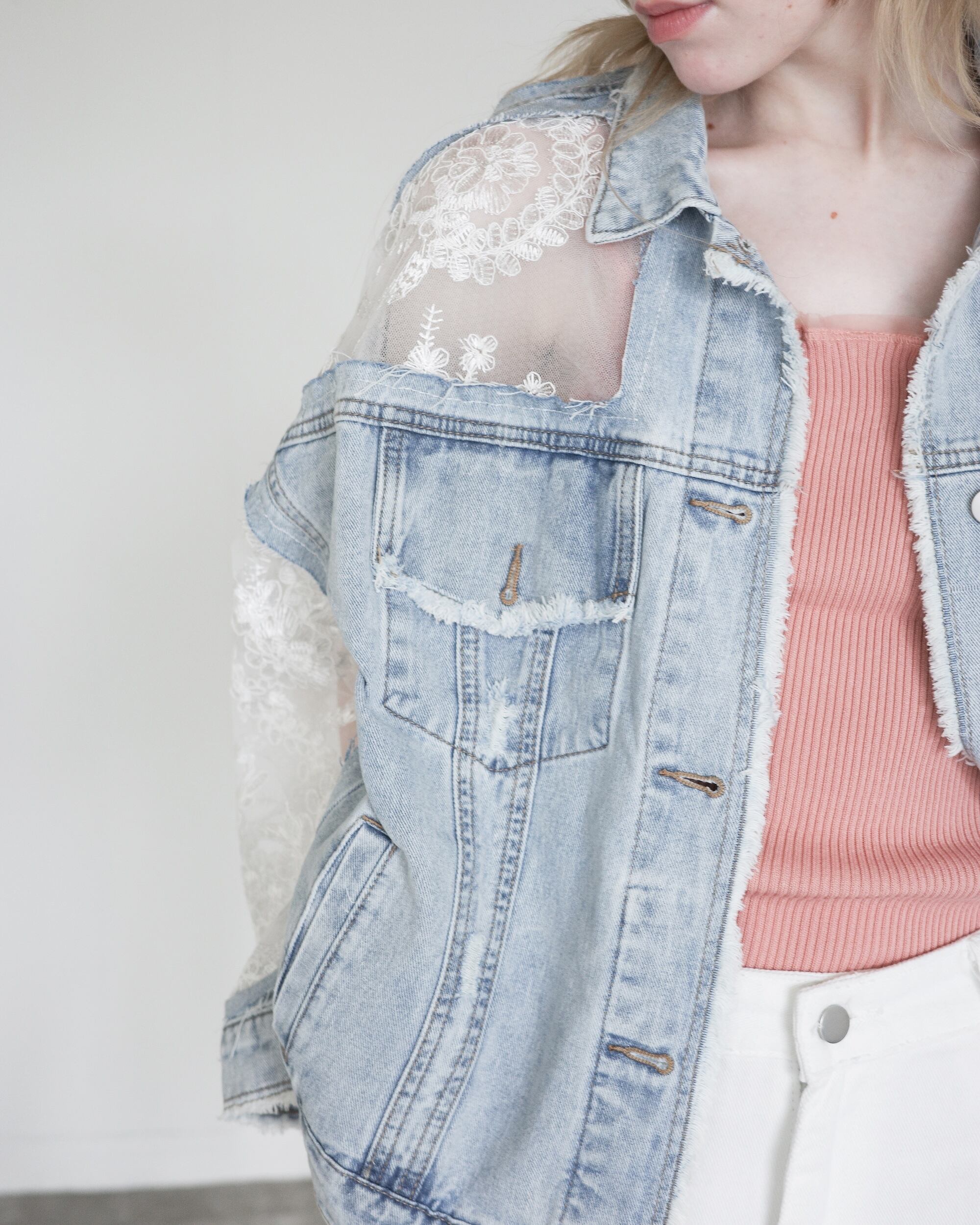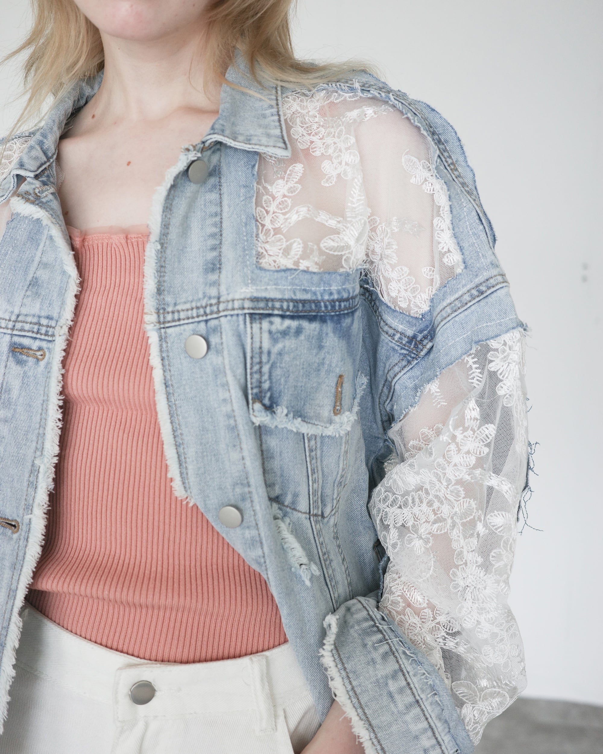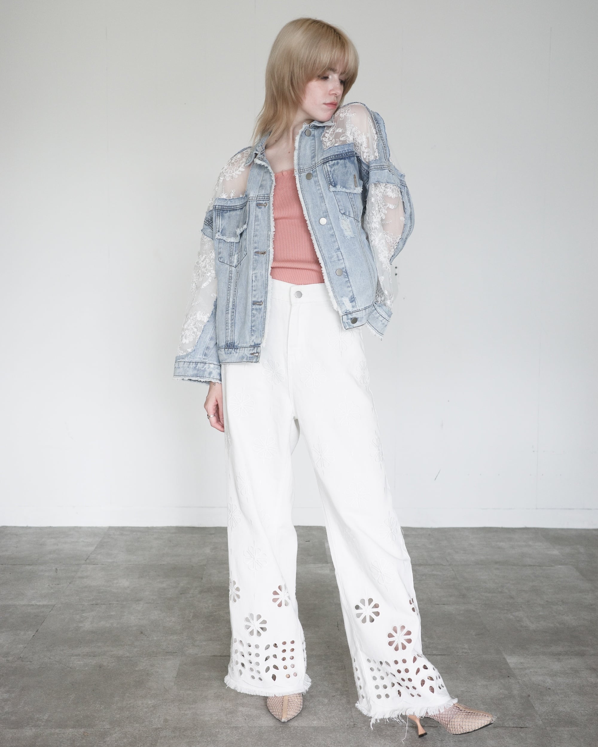 レースの繊細さとデニムのタフさが、静かにぶつかり合いながら調和する一着。透け感のある刺繍チュールを背面と袖に大胆にあしらい、ラフにカットオフされたデニムとのコントラストが視覚に残るジャケットです。春先から秋口まで、Tシャツやニットの上に羽織るだけで、主役級の存在感を放ちます。