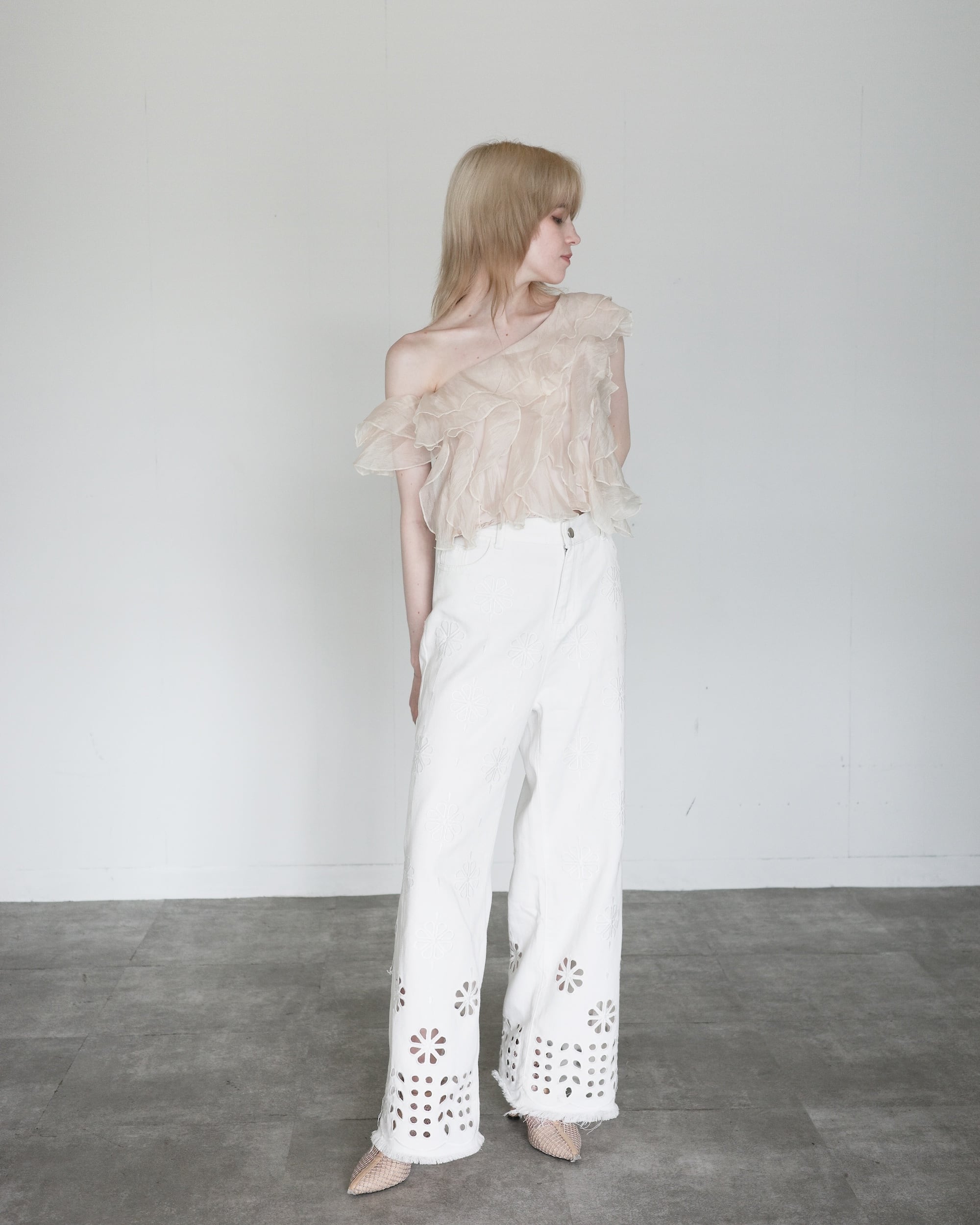 繊細な透け感を持つオーガン素材を、アシンメトリーに重ねたワンショルダーのフリルトップ。