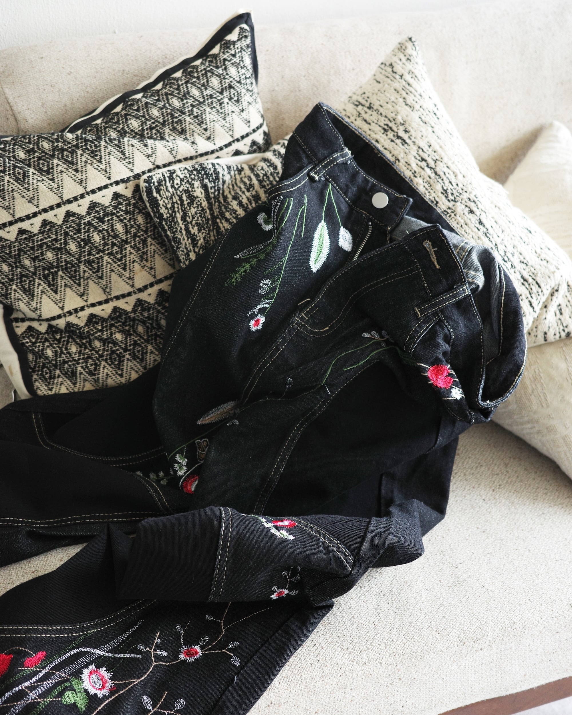 ・ブラックデニムをベースに、オリジナル刺繍を全体に配置