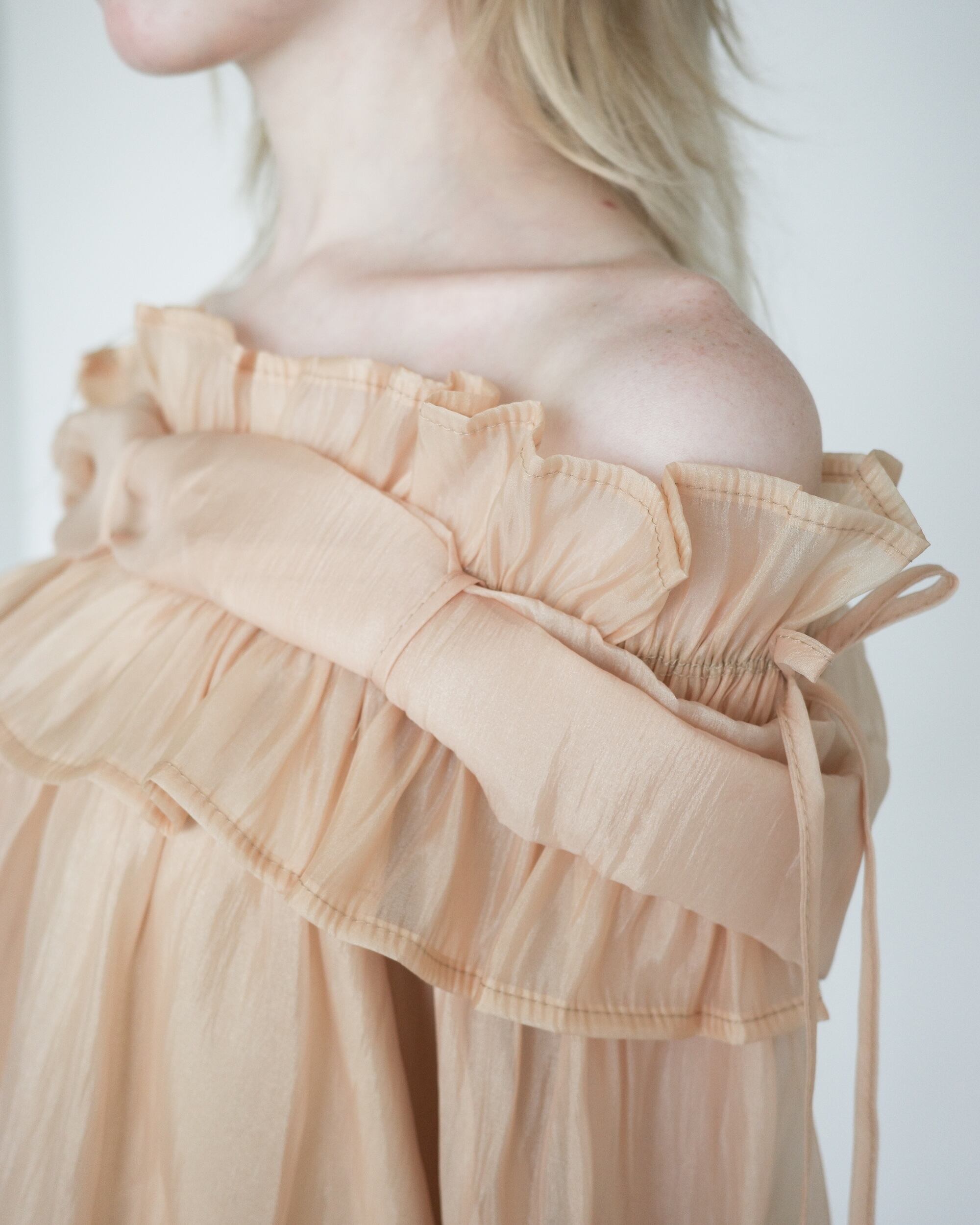 透け感のある軽やかな素材をたっぷりと使用した、オフショルダーブラウス。