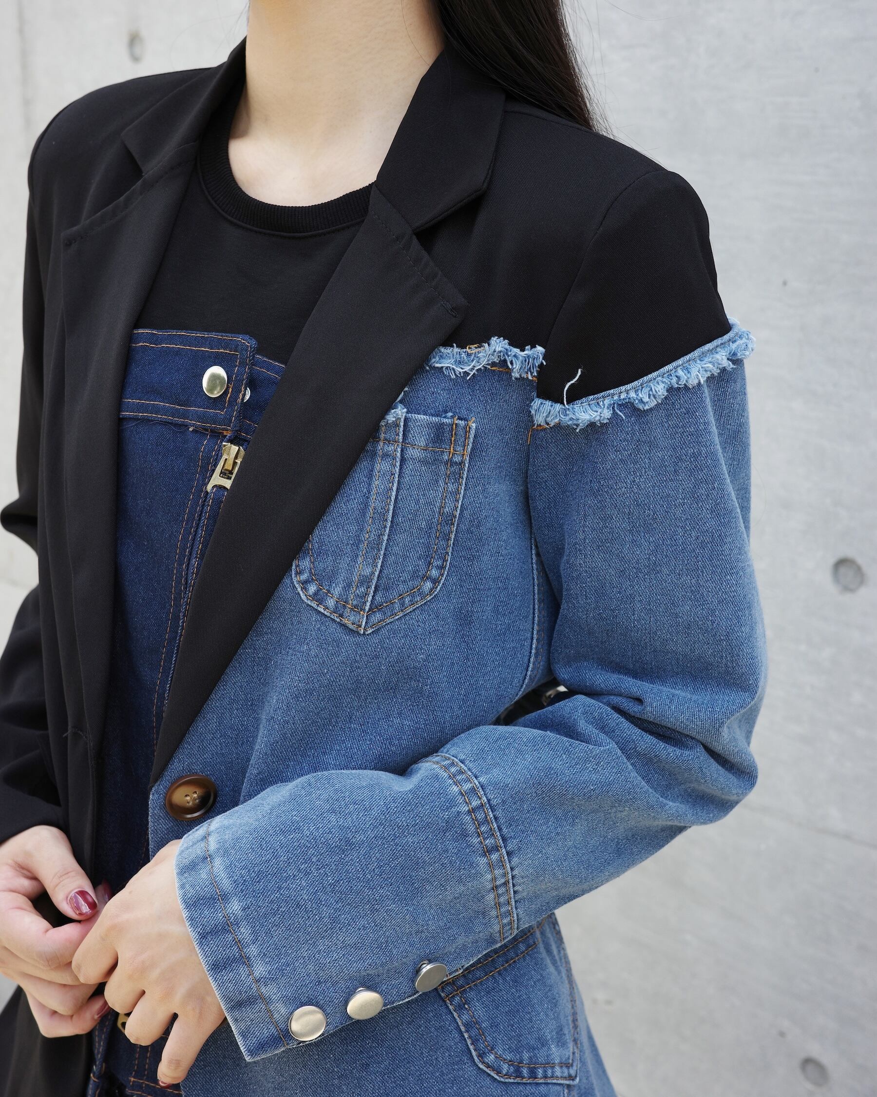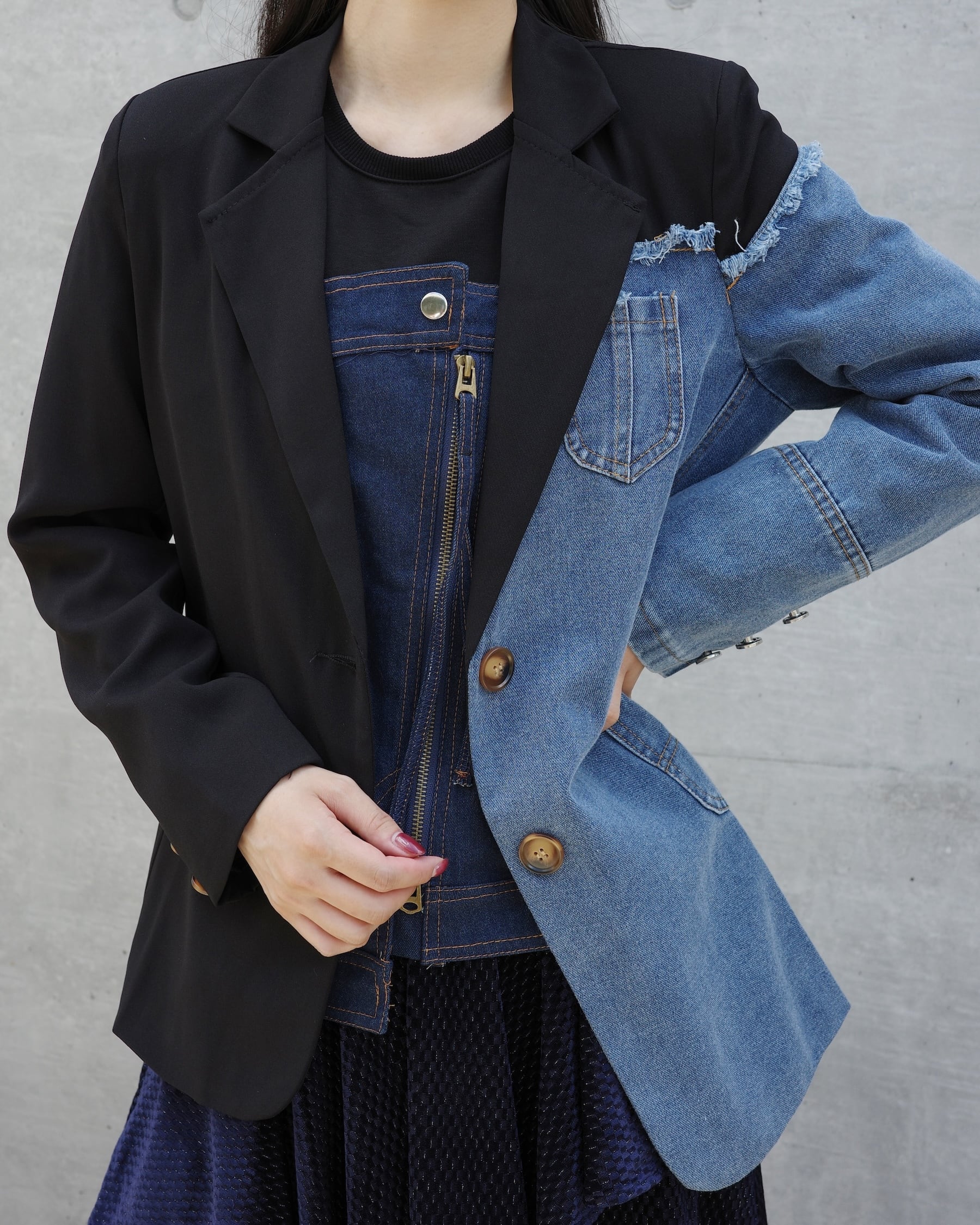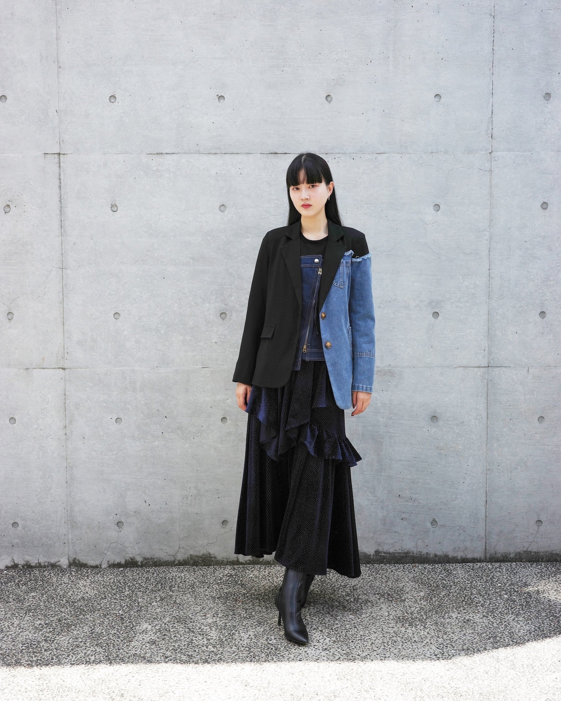 ・右側はブラックのテーラード、左側はデニムジャケットを再構築したようなディテー