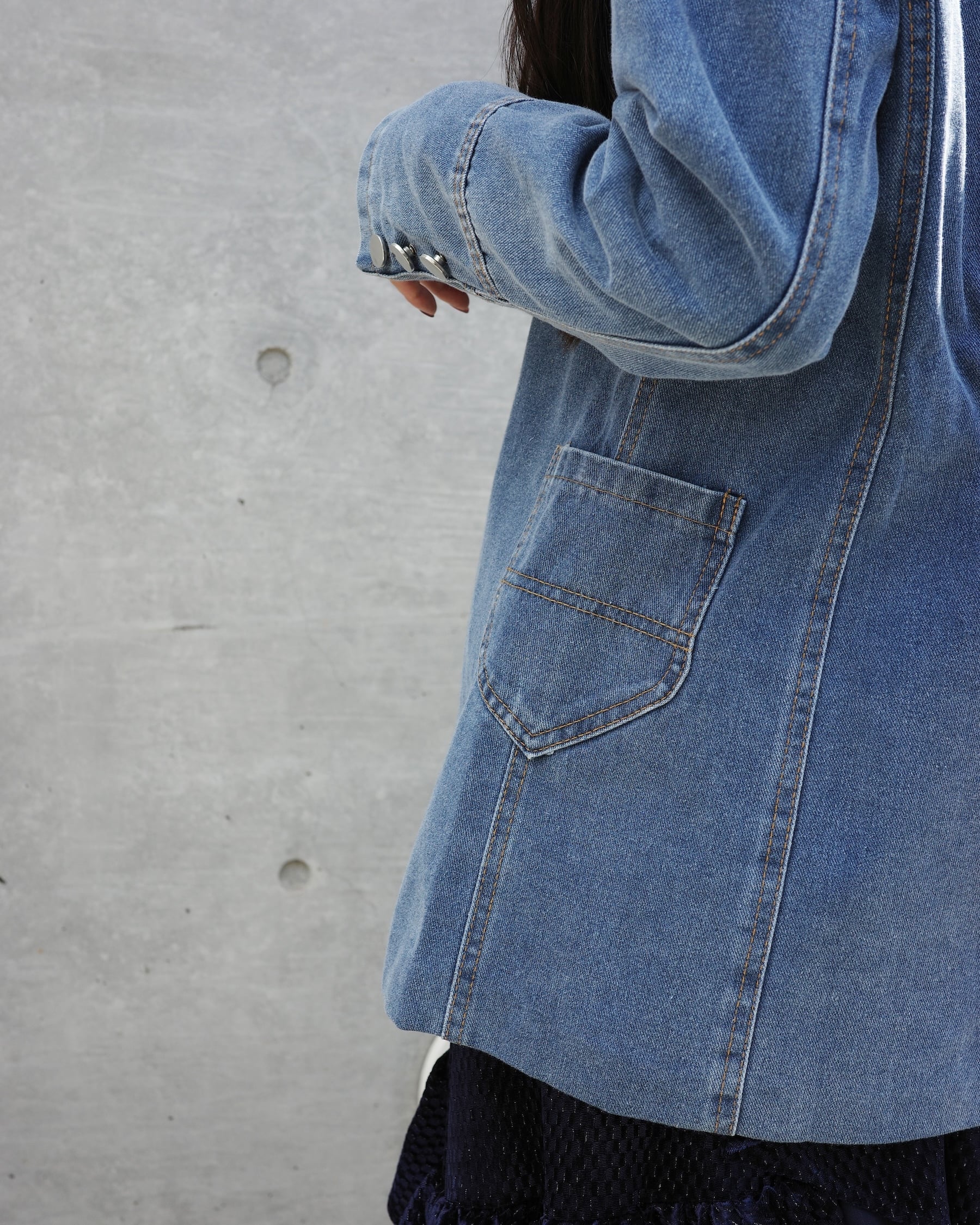 端正なテーラードとラフなデニムを大胆に切り替えた、コントラストの効いたジャケッ