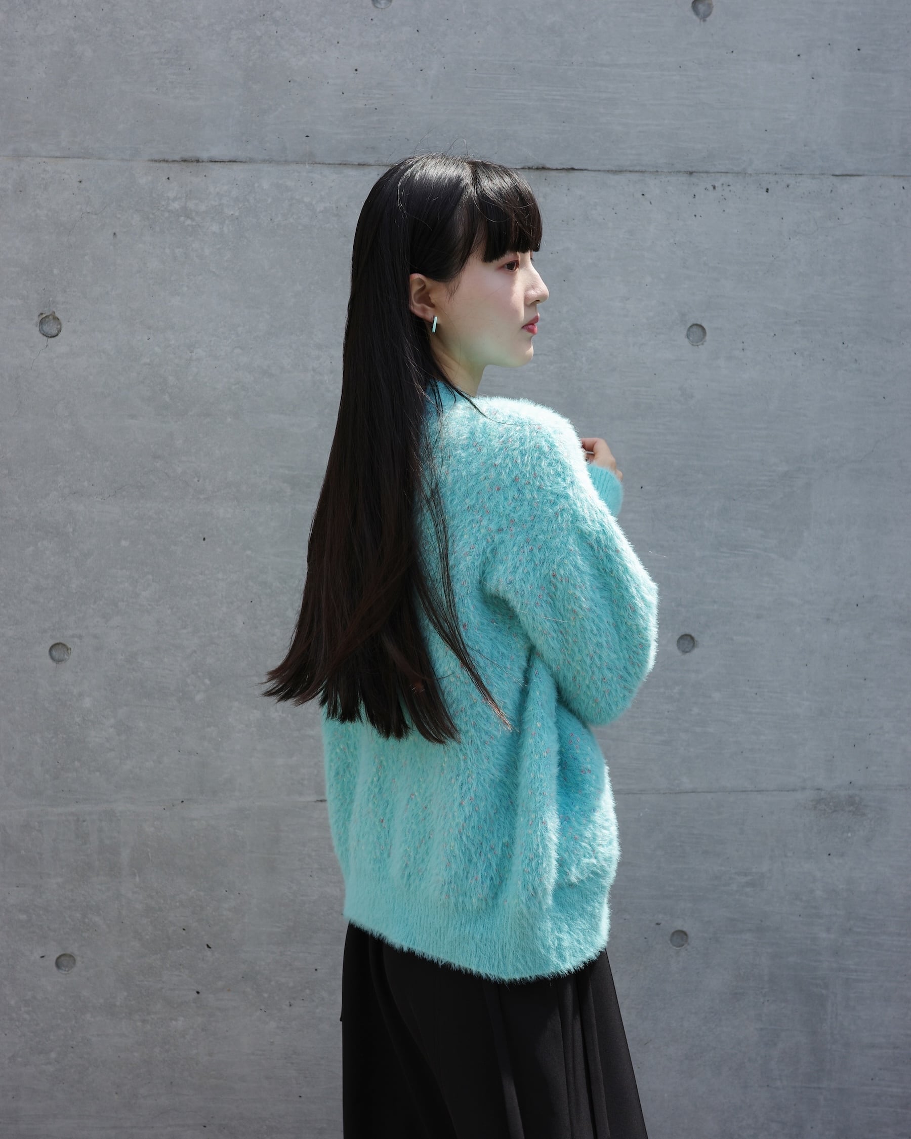 目を惹くアイシーなブルーに、さりげない多色のネップ糸を織り交ぜ、甘さの中に透明感