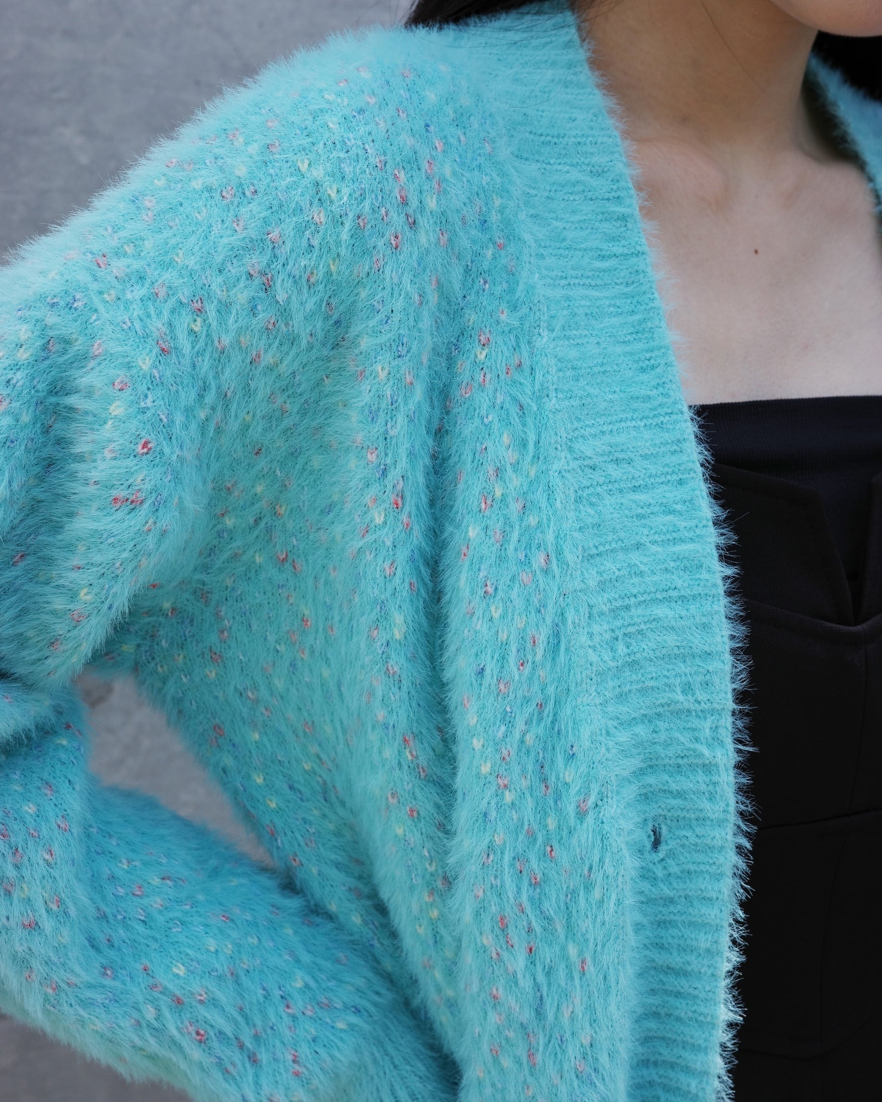 毛足の長いフェザーヤーンを使用した、ふんわりと柔らかなタッチが魅力のニットカーデ