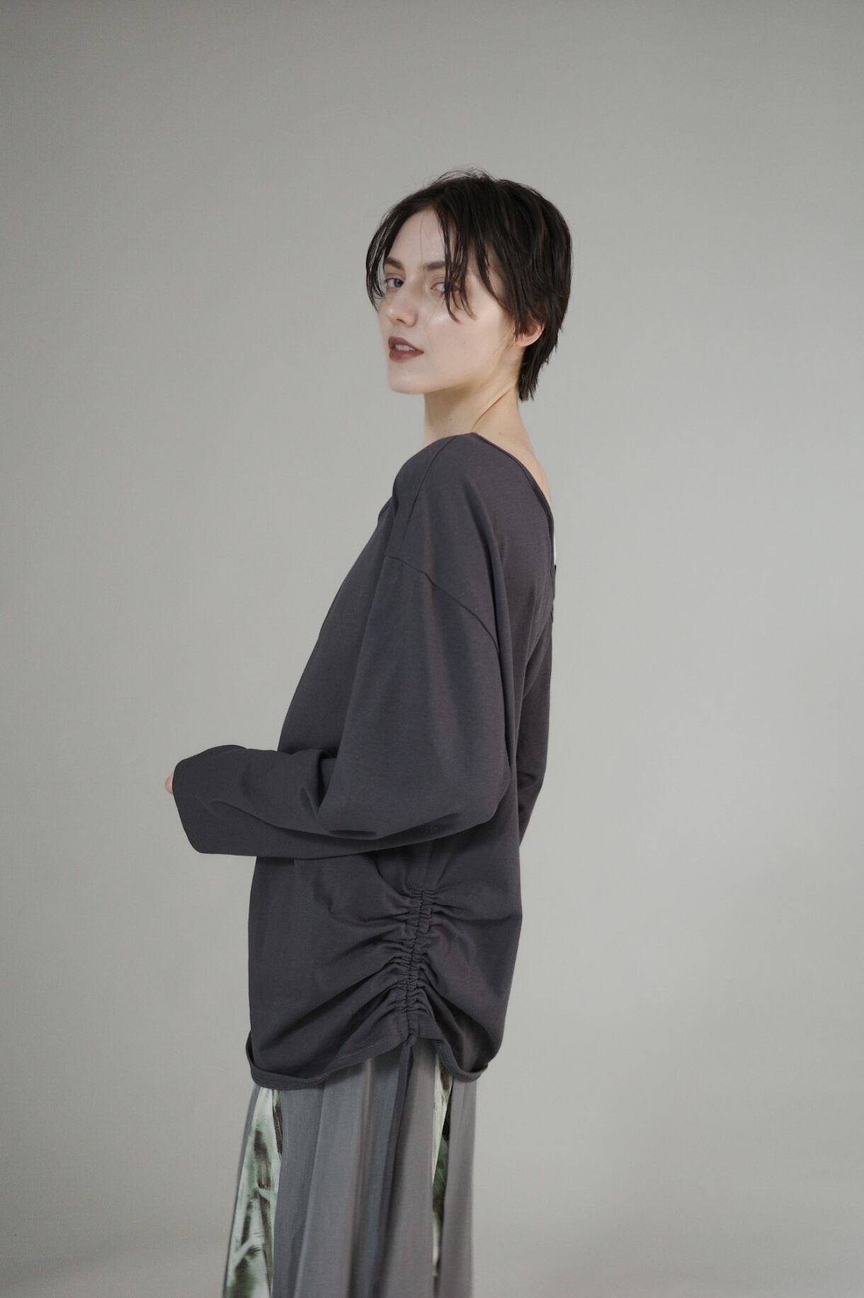 サイドに寄せたドローストリングでシルエットを自在に調整でき、纏うだけでニュアンスのある表情に。
