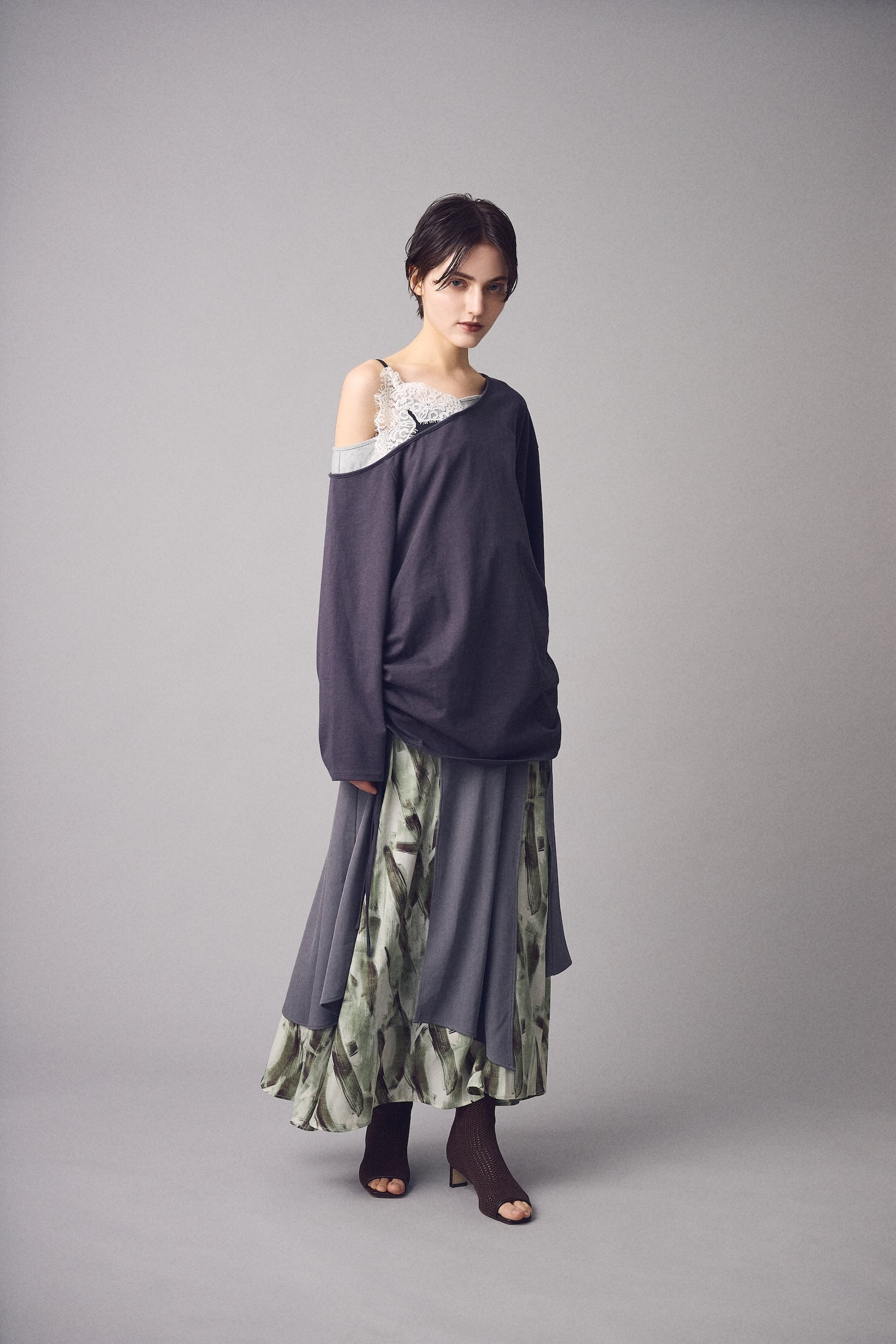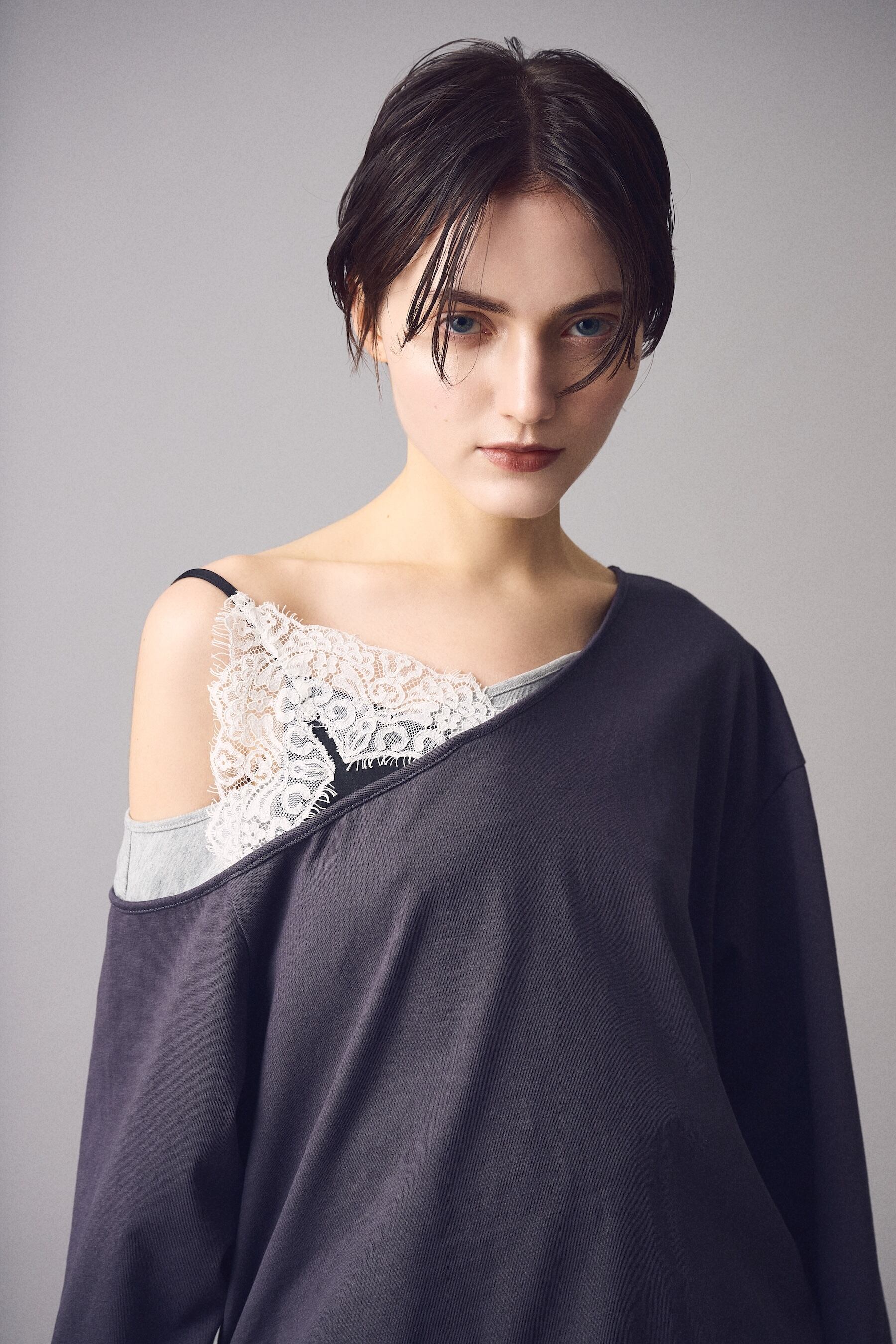 肩線をずらしたカッティングが静かな色気をつくり、素肌に落ちるレースが視線を引き寄せます。