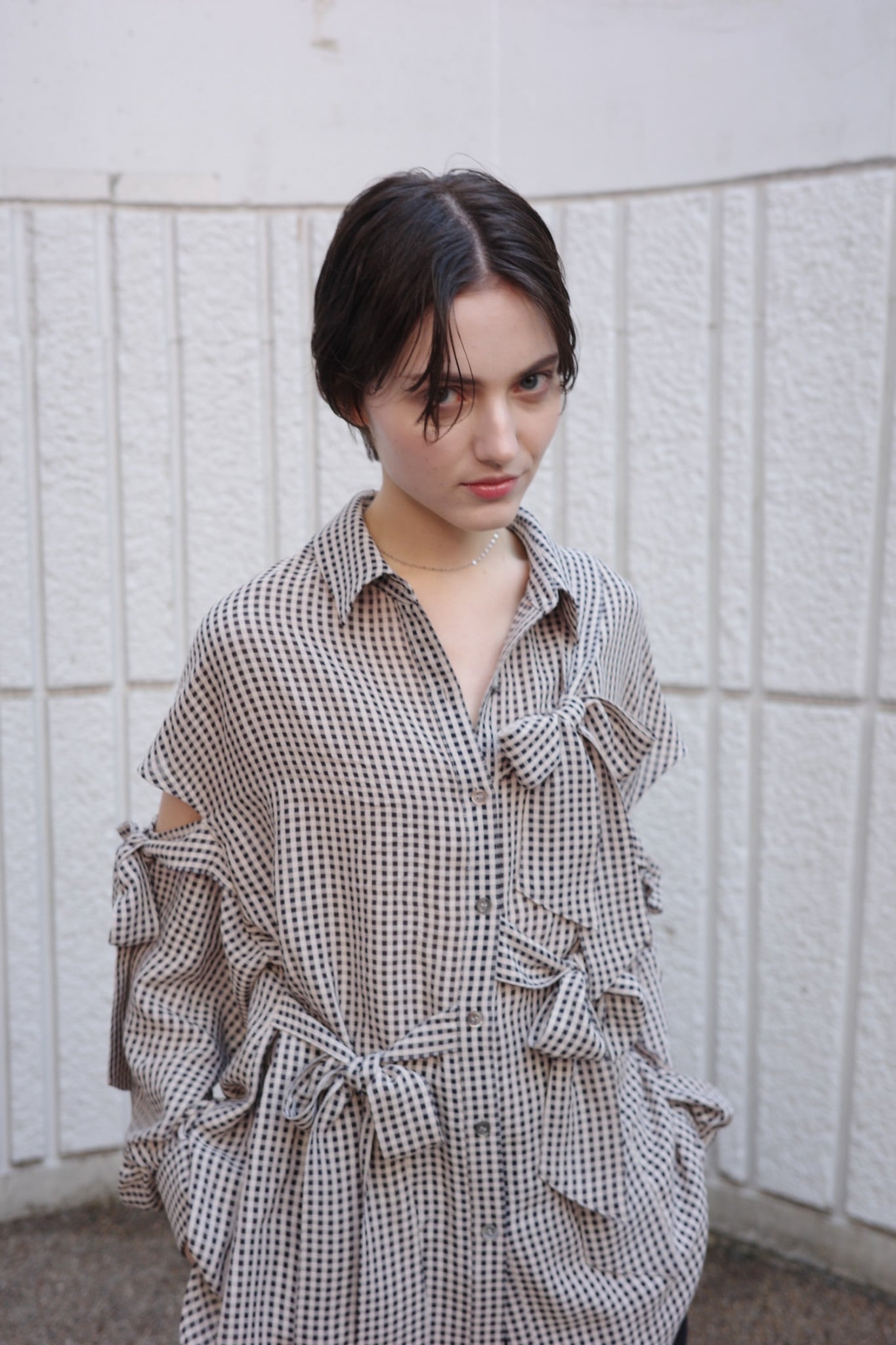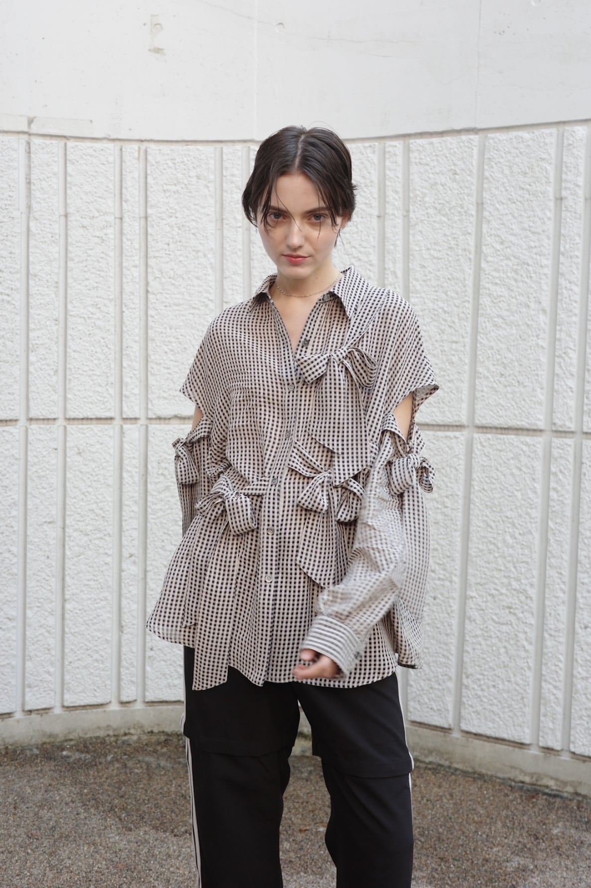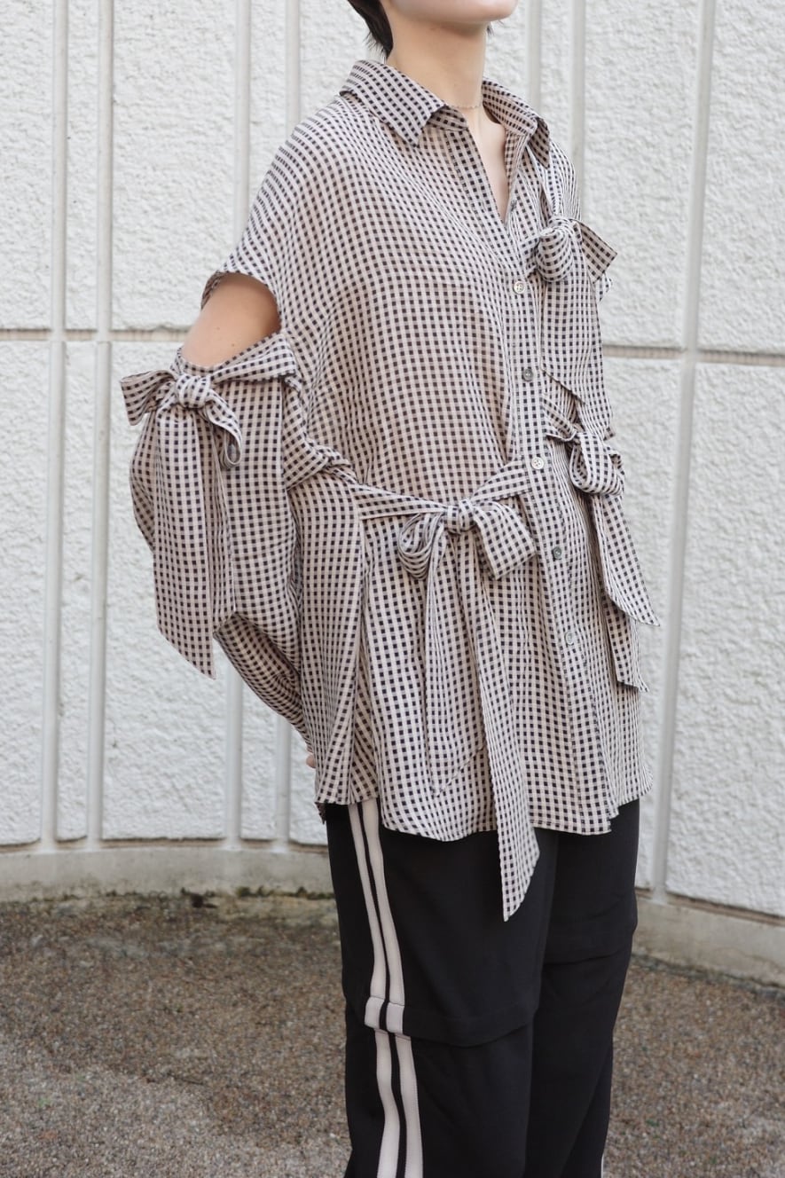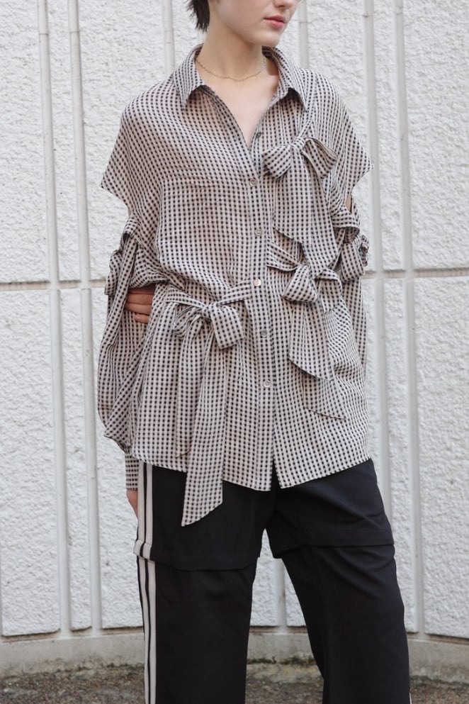 ほんのりと透けるギンガムチェックに、構築的で大ぶりなリボンを全面にあしらったシャツ。