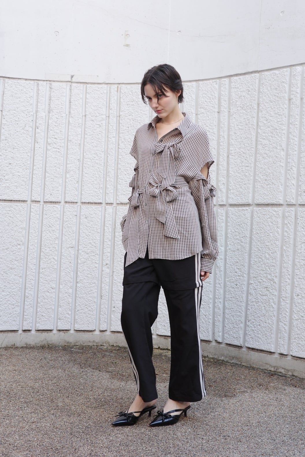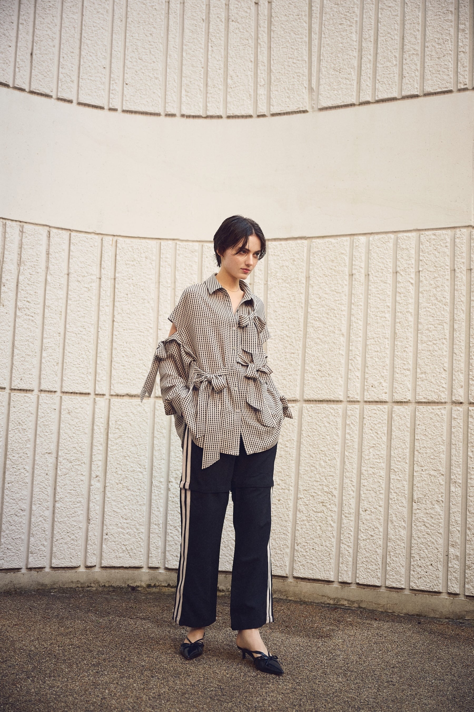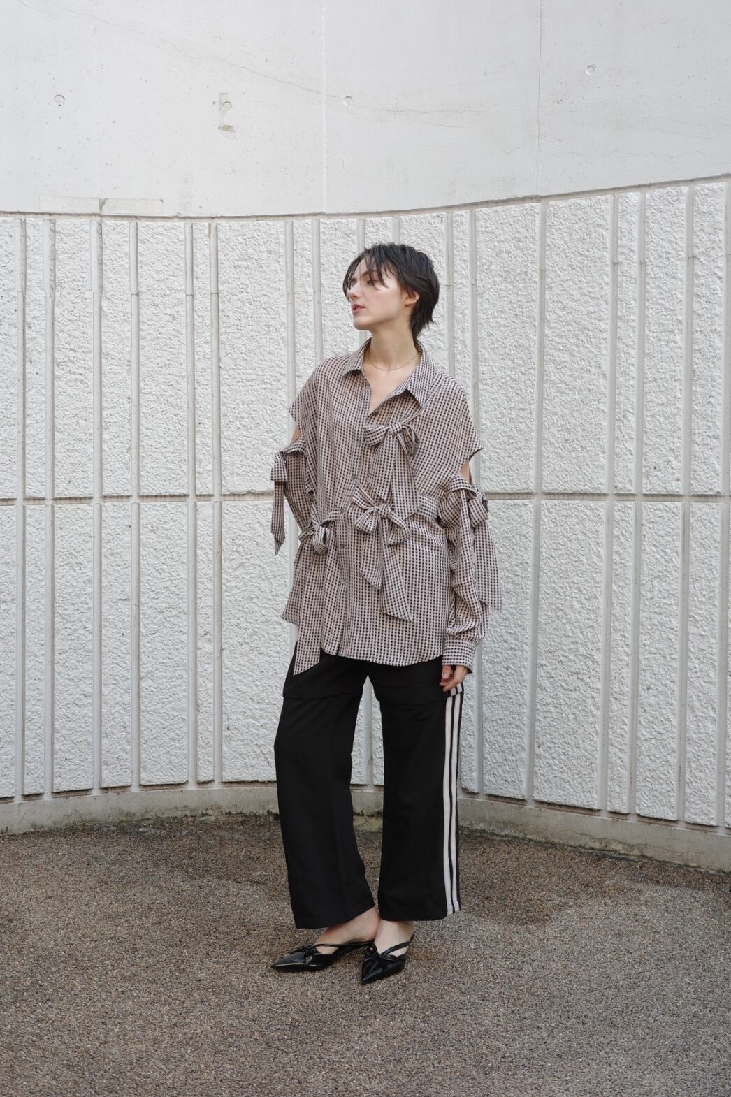 ほんのりと透けるギンガムチェックに、構築的で大ぶりなリボンを全面にあしらったシャツ。