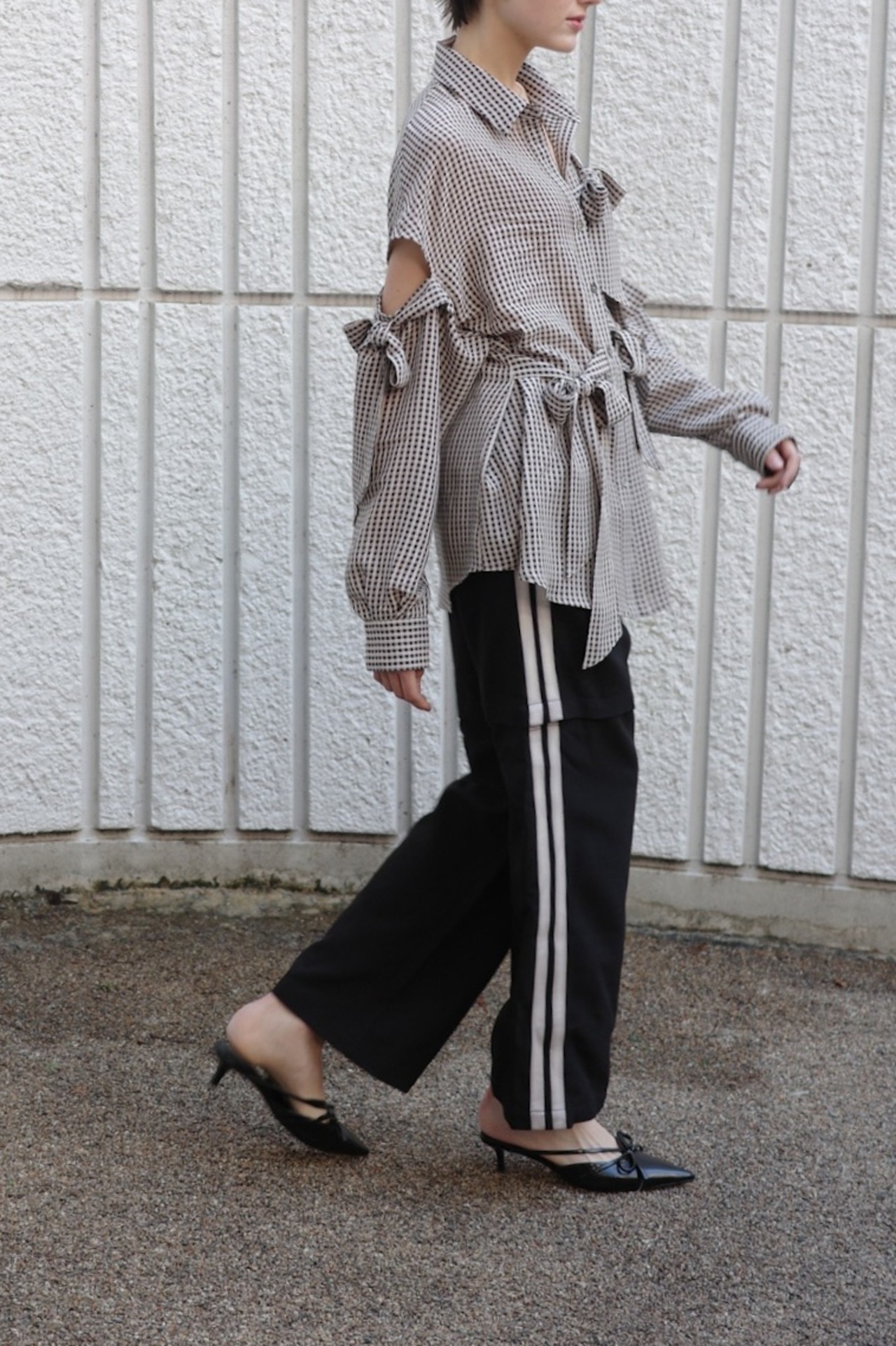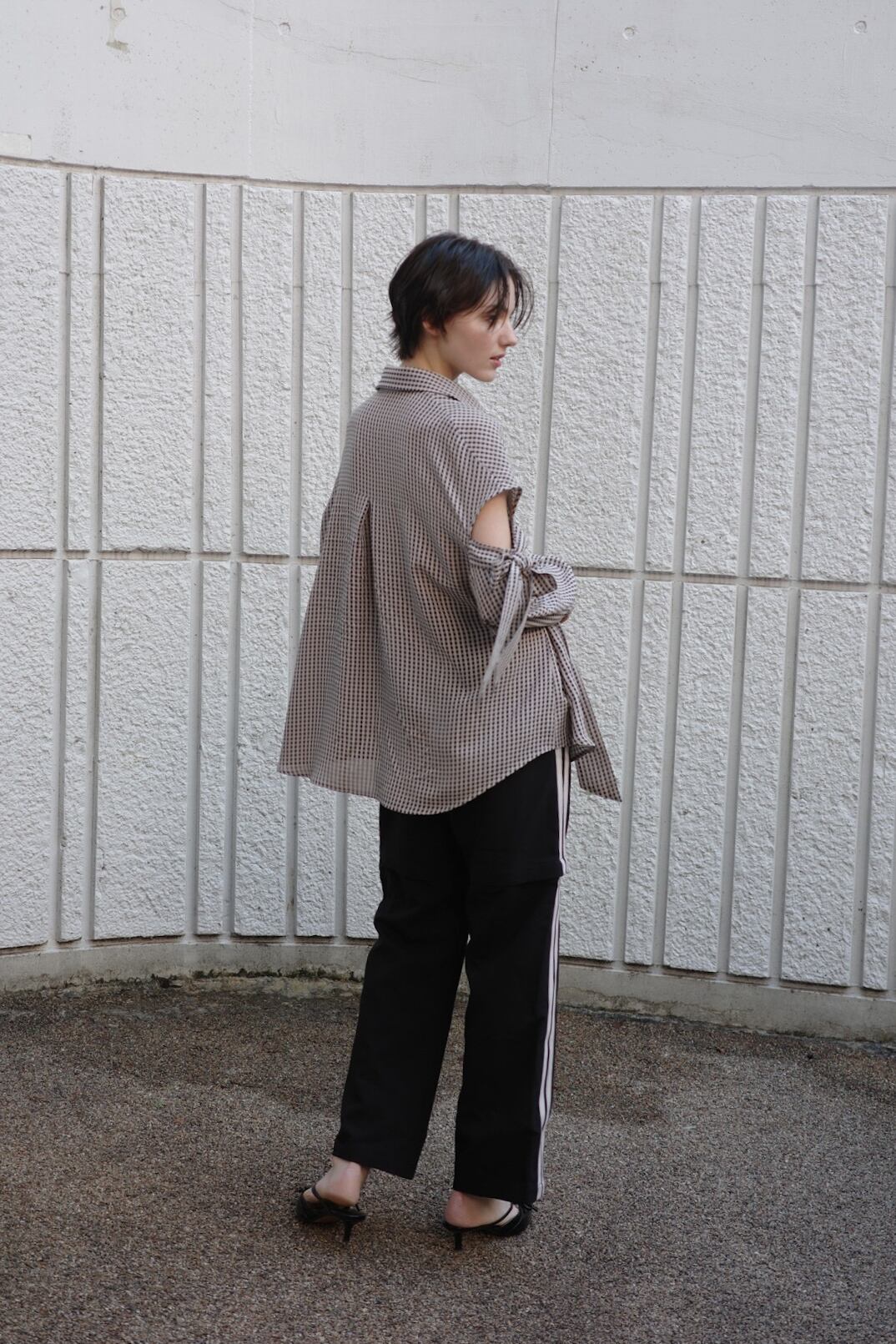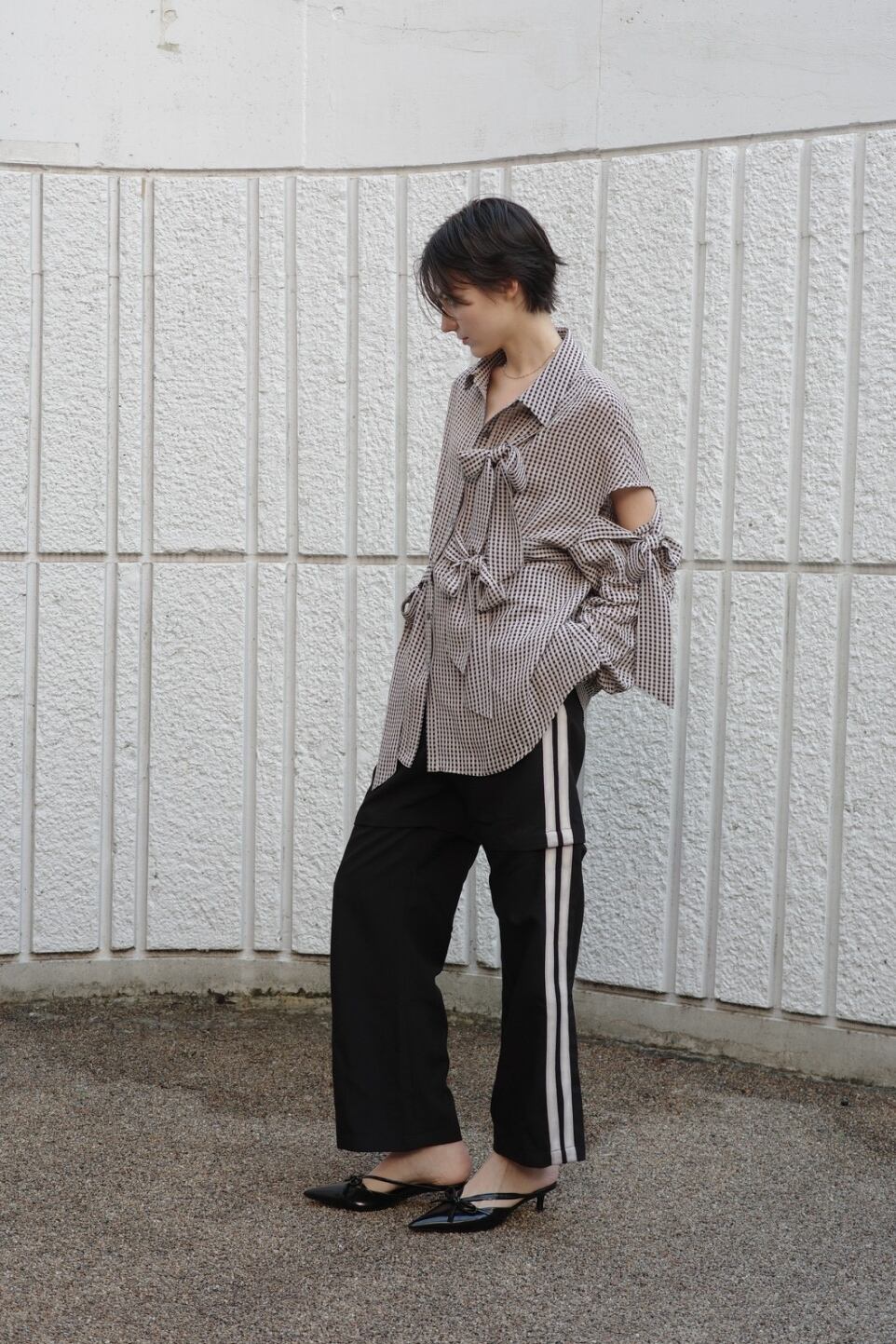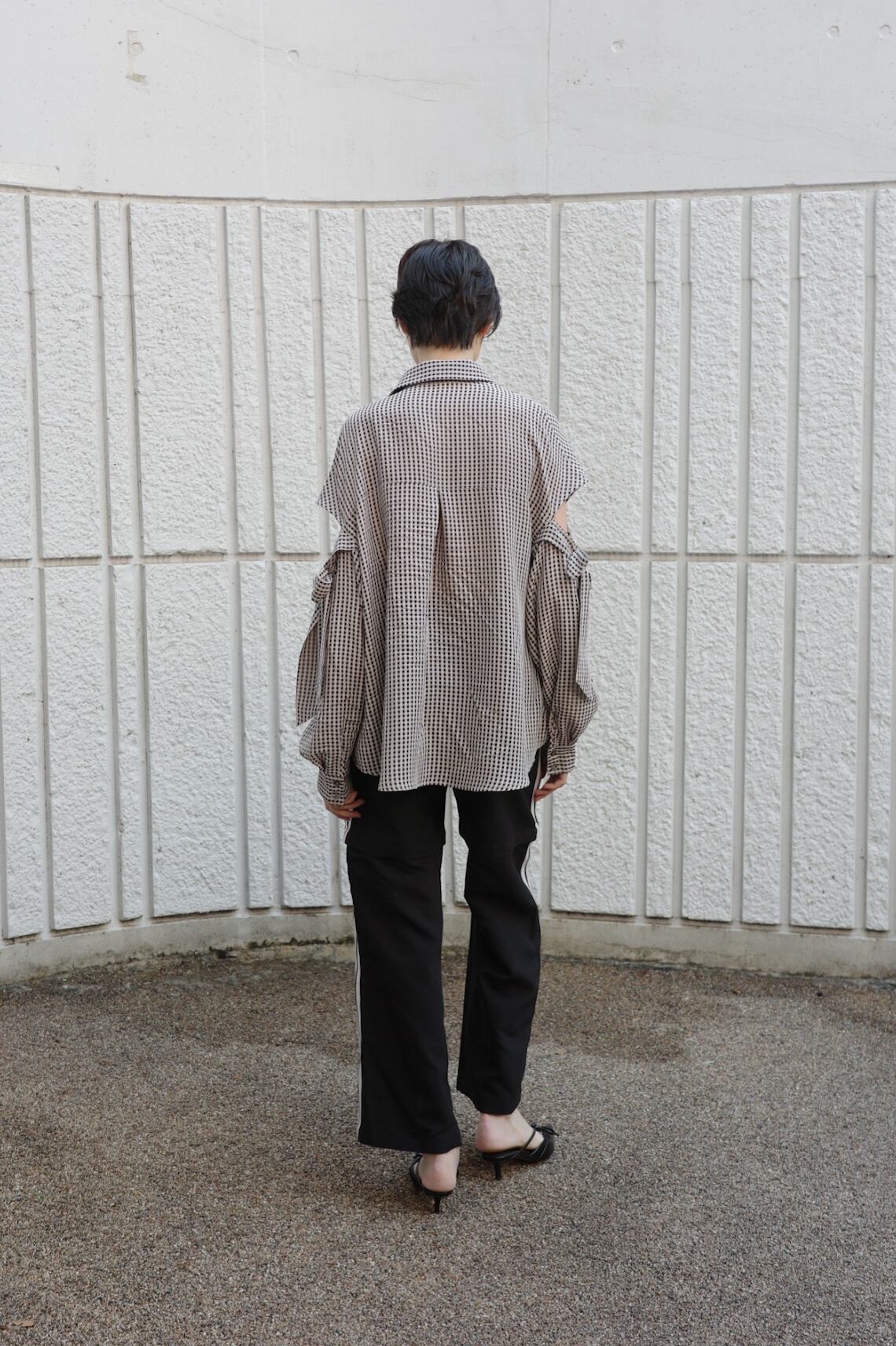 ほんのりと透けるギンガムチェックに、構築的で大ぶりなリボンを全面にあしらったシャツ。