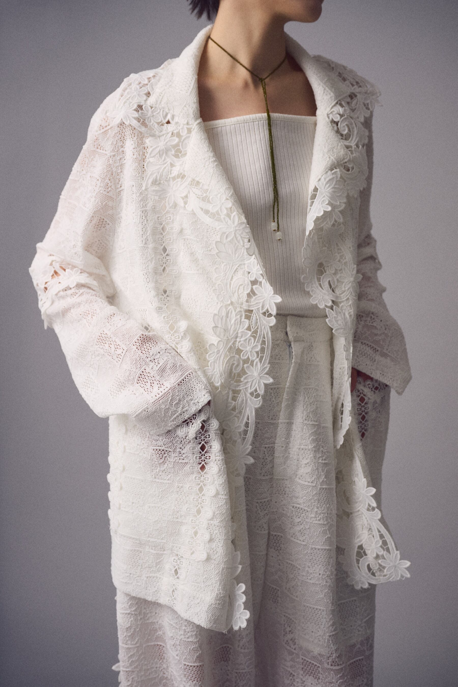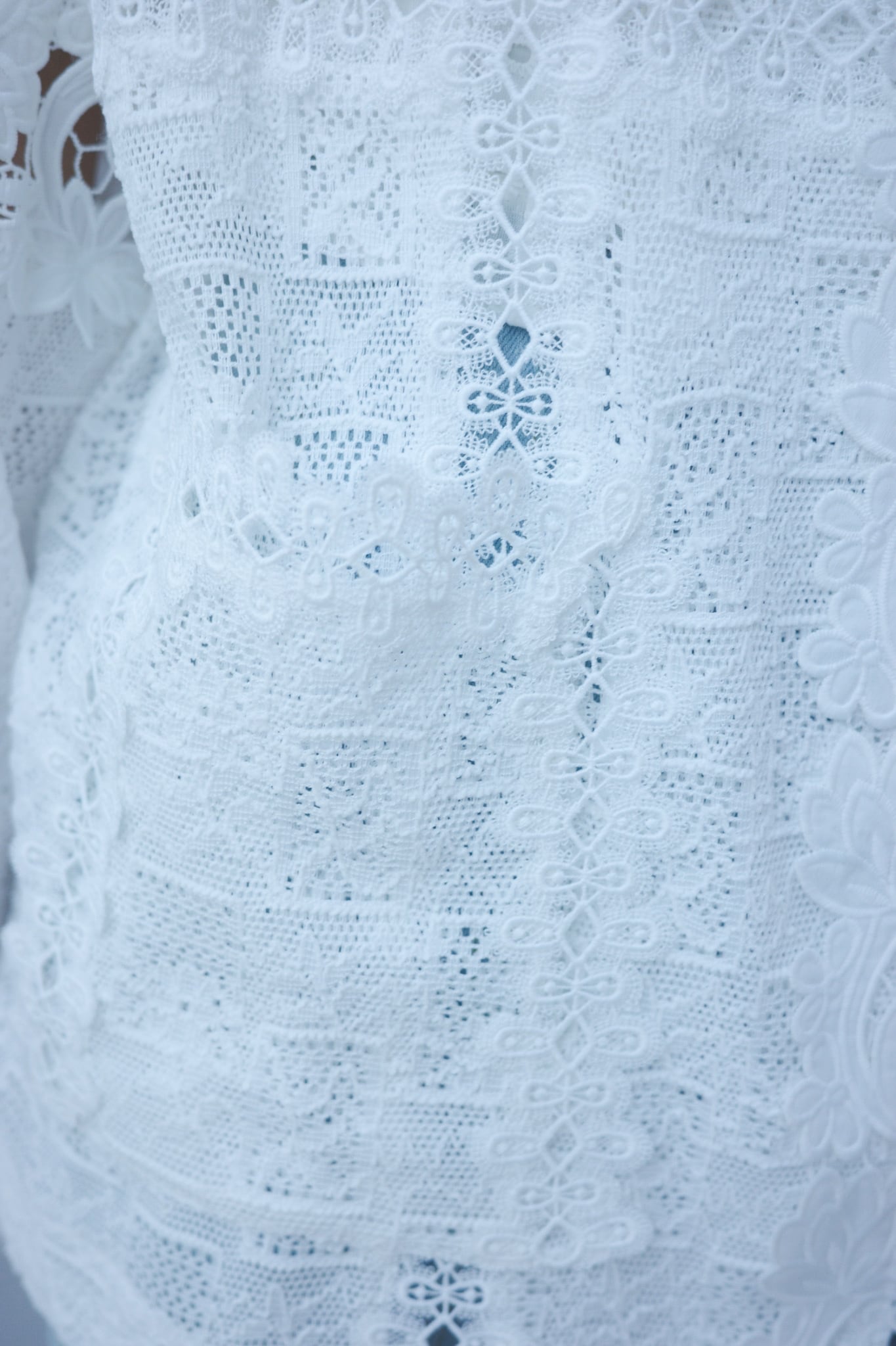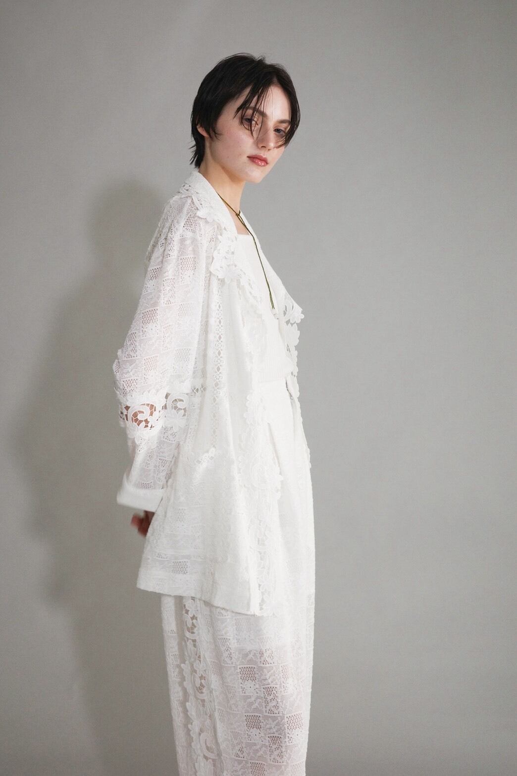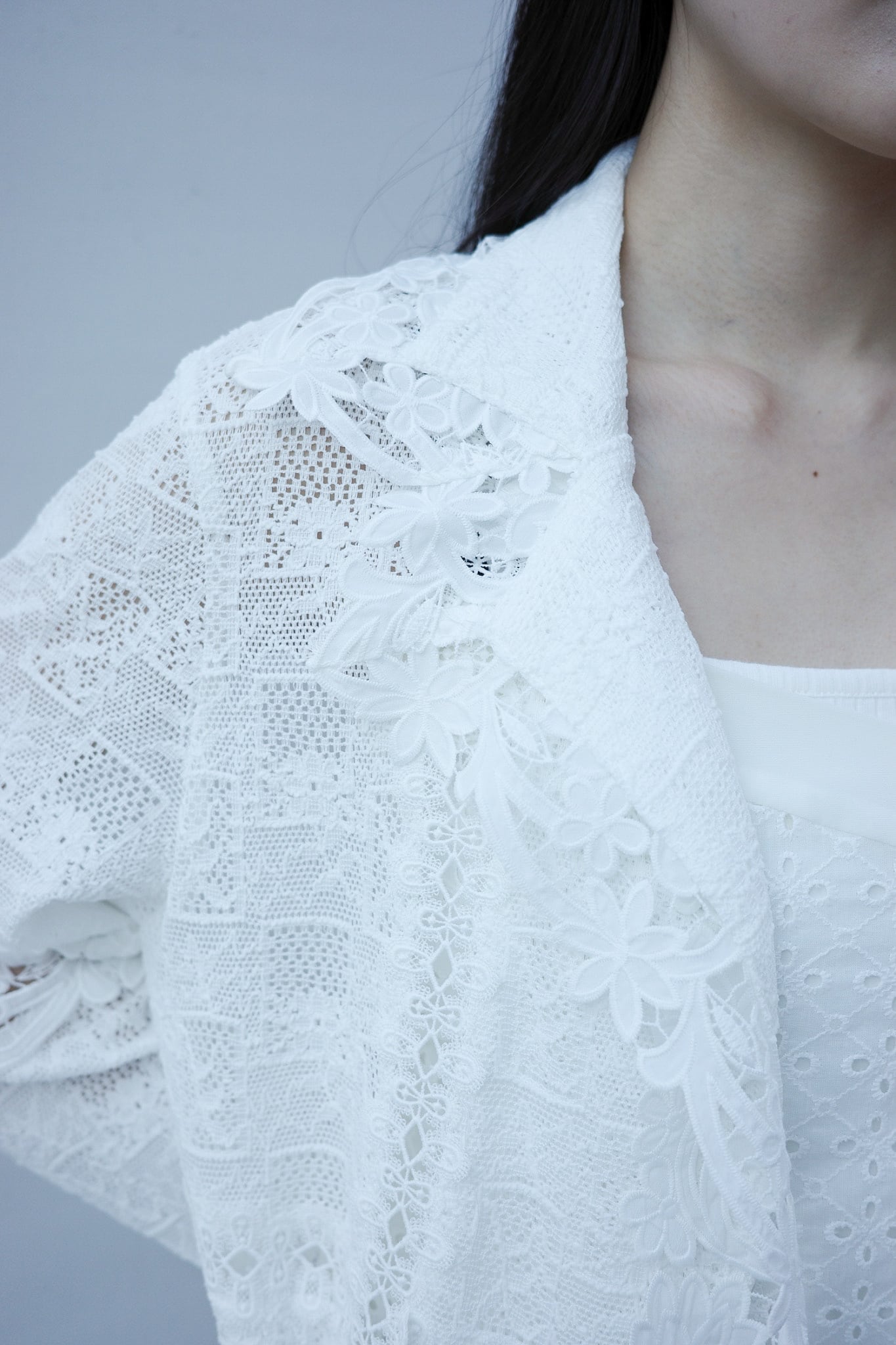 異なるレースを大胆に、そして繊細に重ね合わせ、奥行きのある表情を描いたレースジャケット。