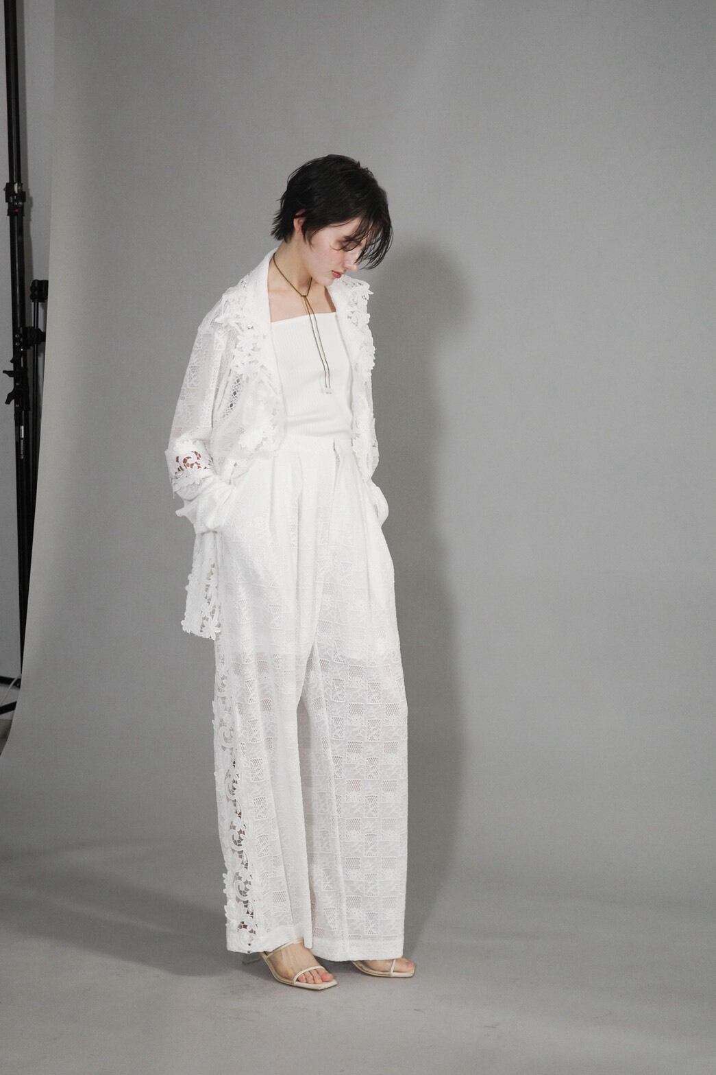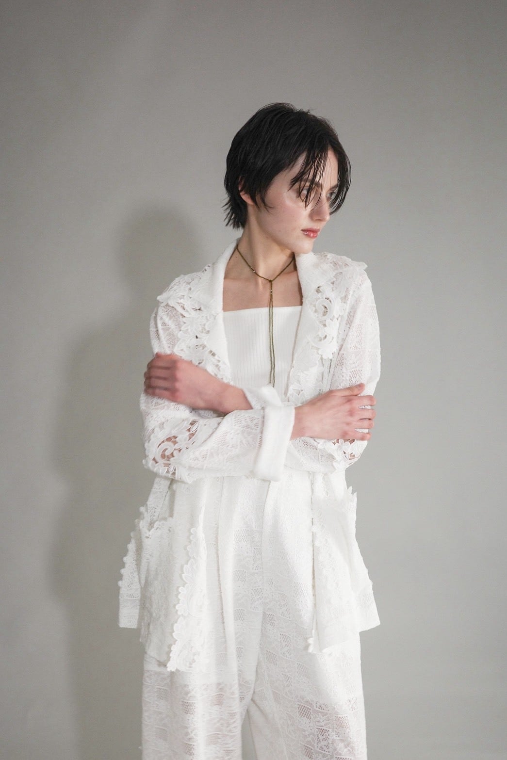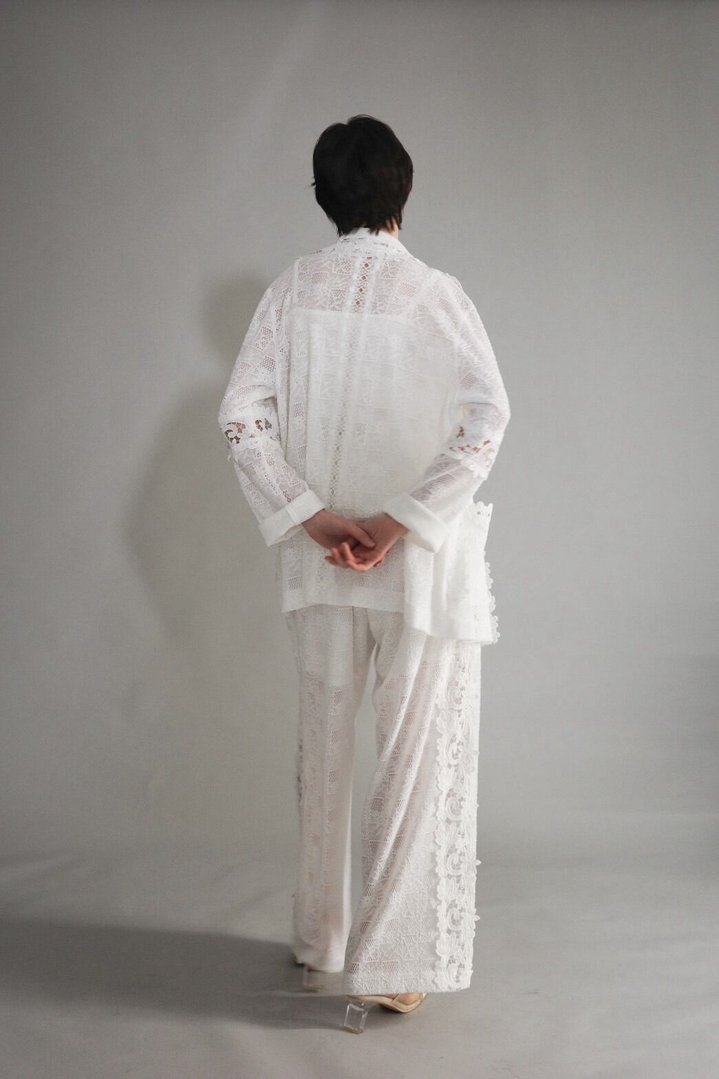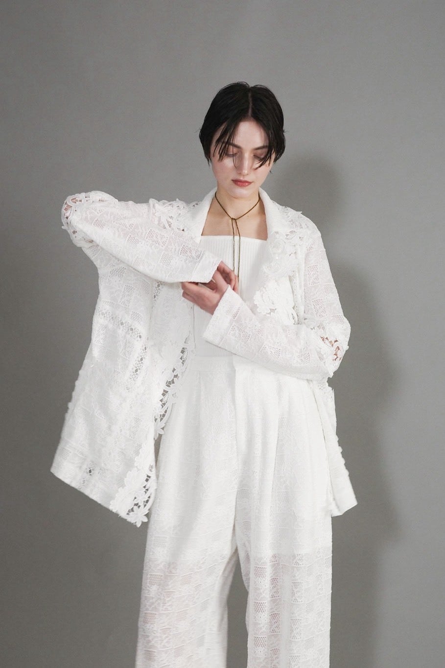 異なるレースを大胆に、そして繊細に重ね合わせ、奥行きのある表情を描いたレースジャケット。