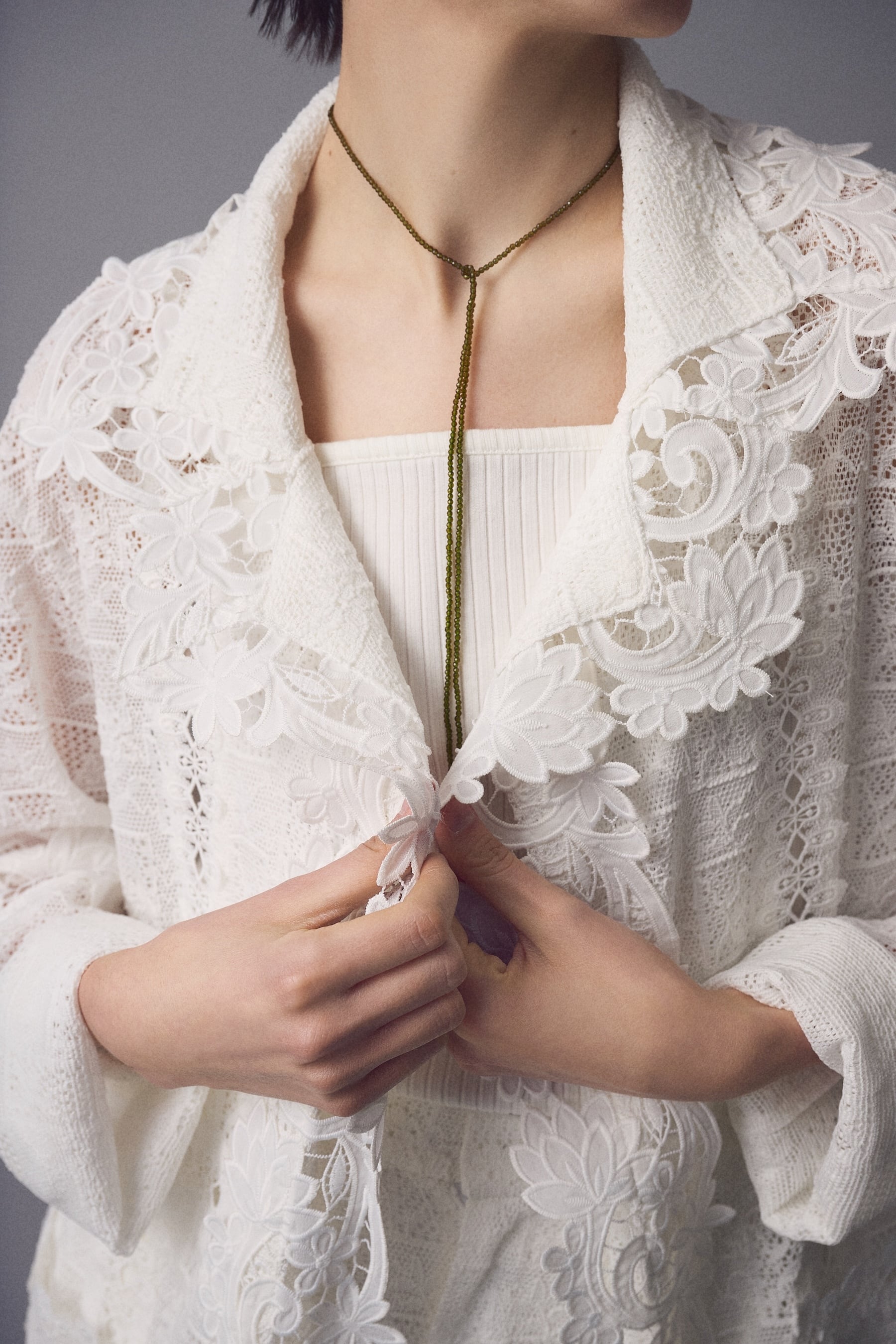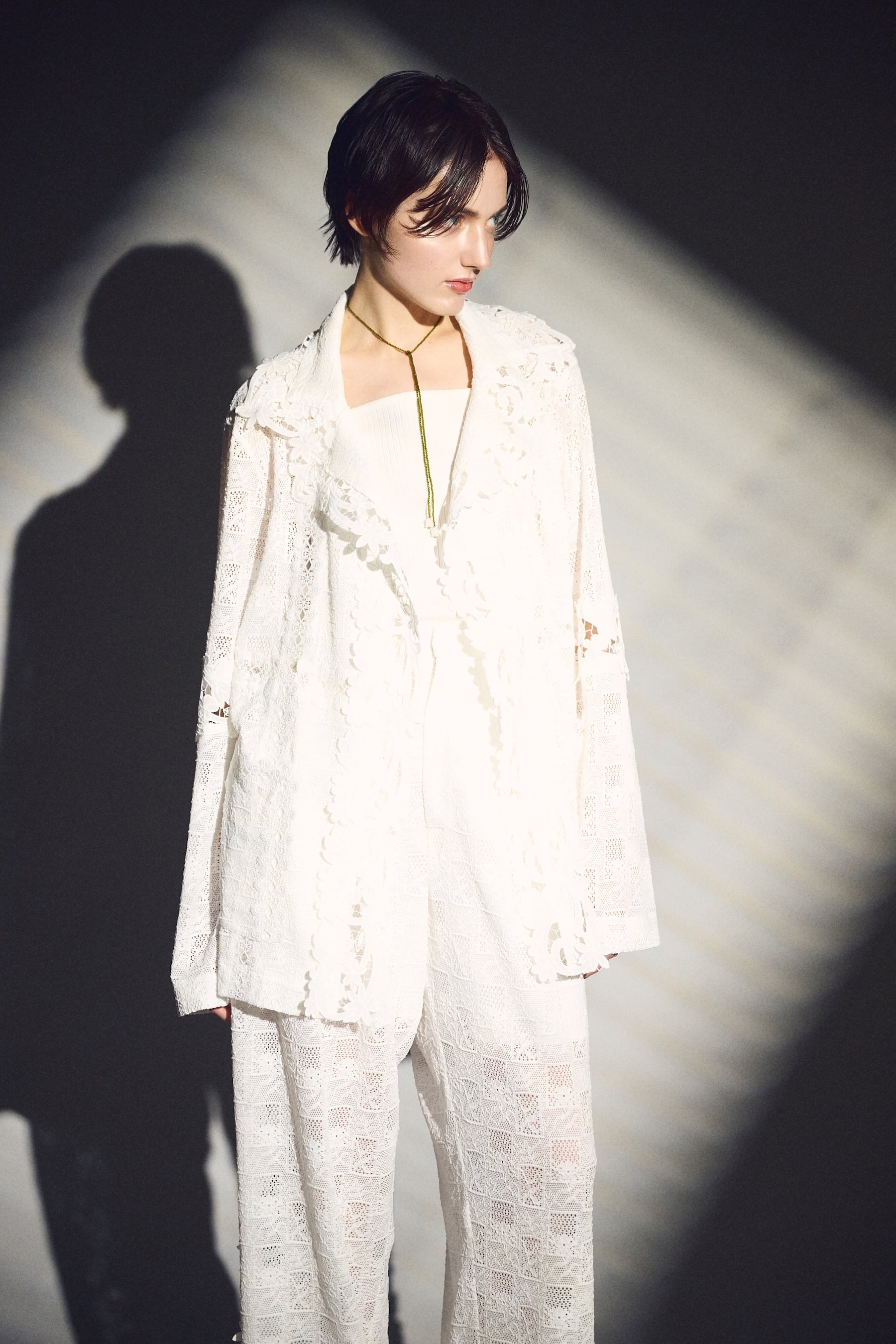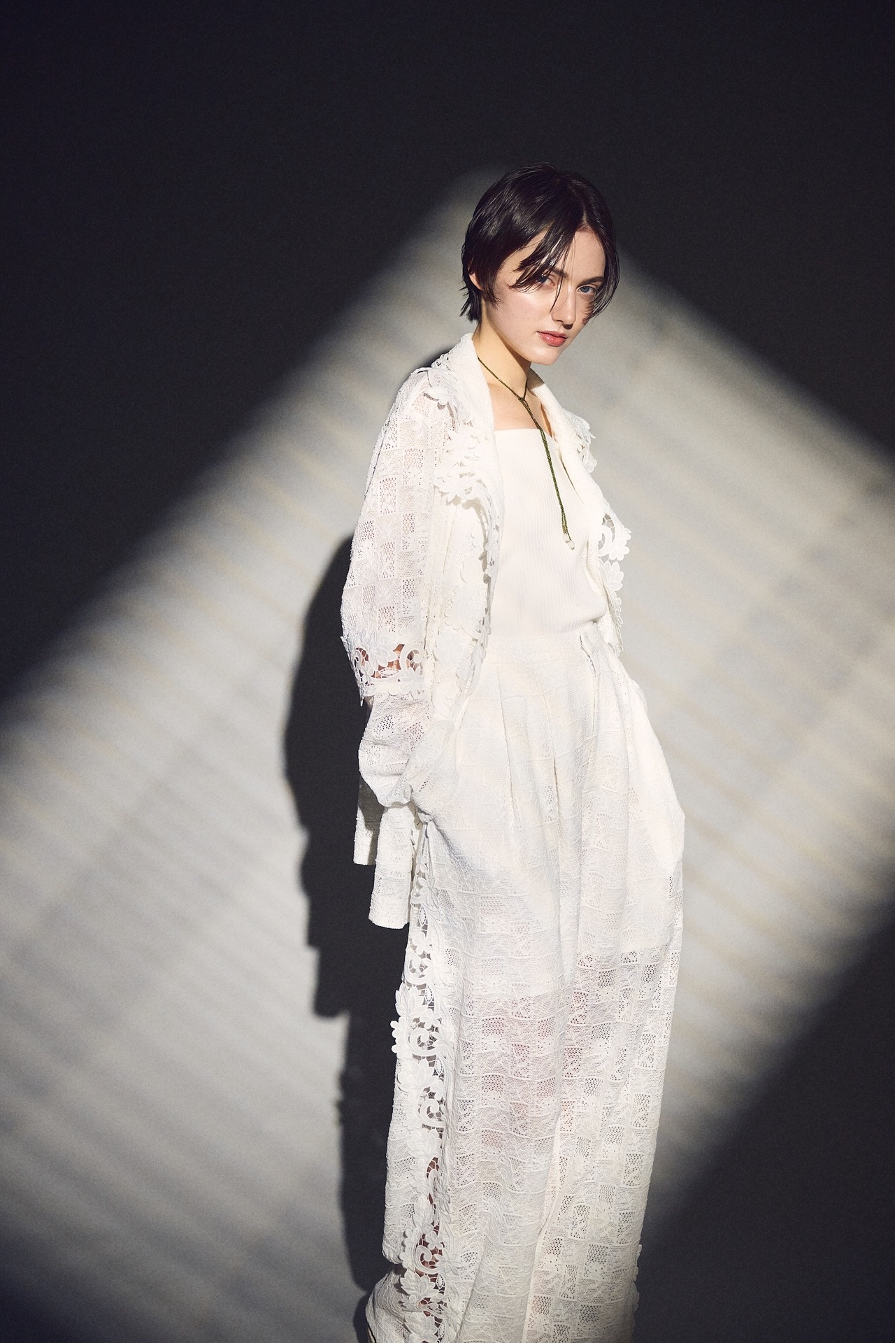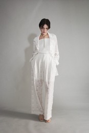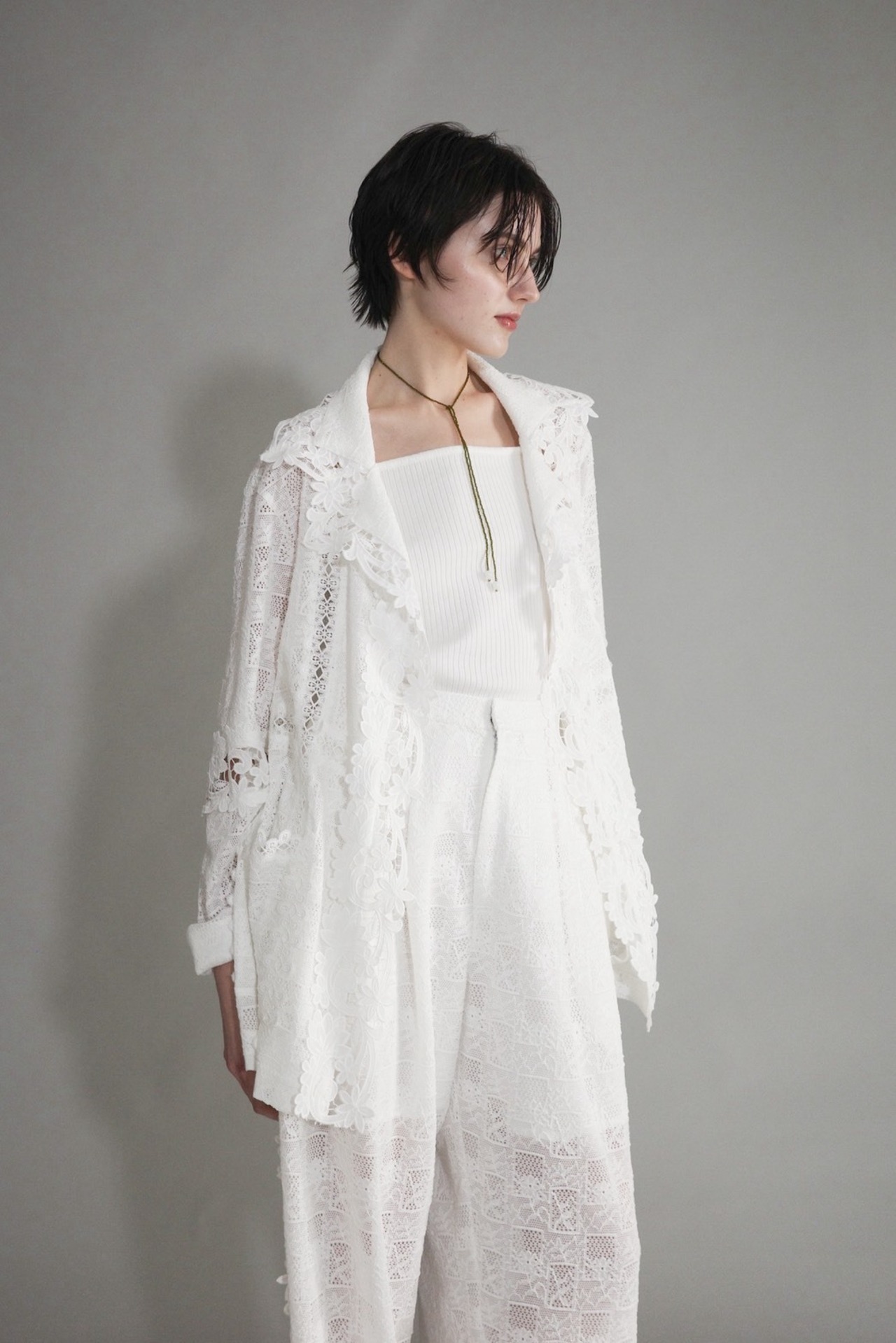 異なるレースを大胆に、そして繊細に重ね合わせ、奥行きのある表情を描いたレースジャケット。