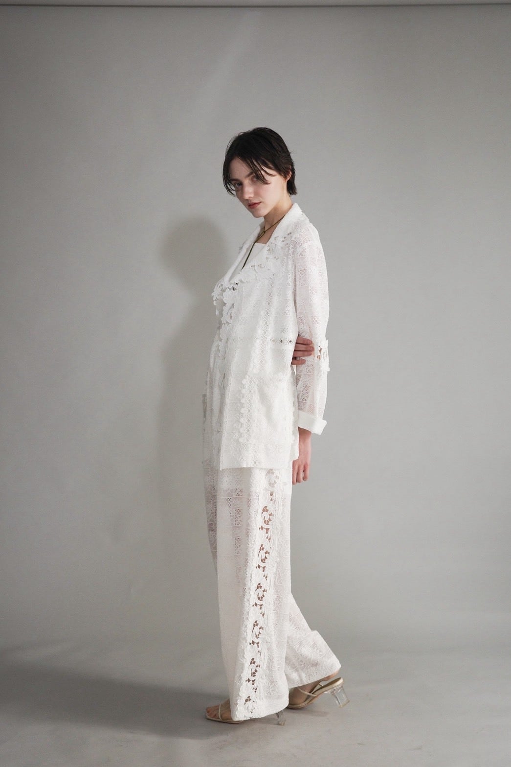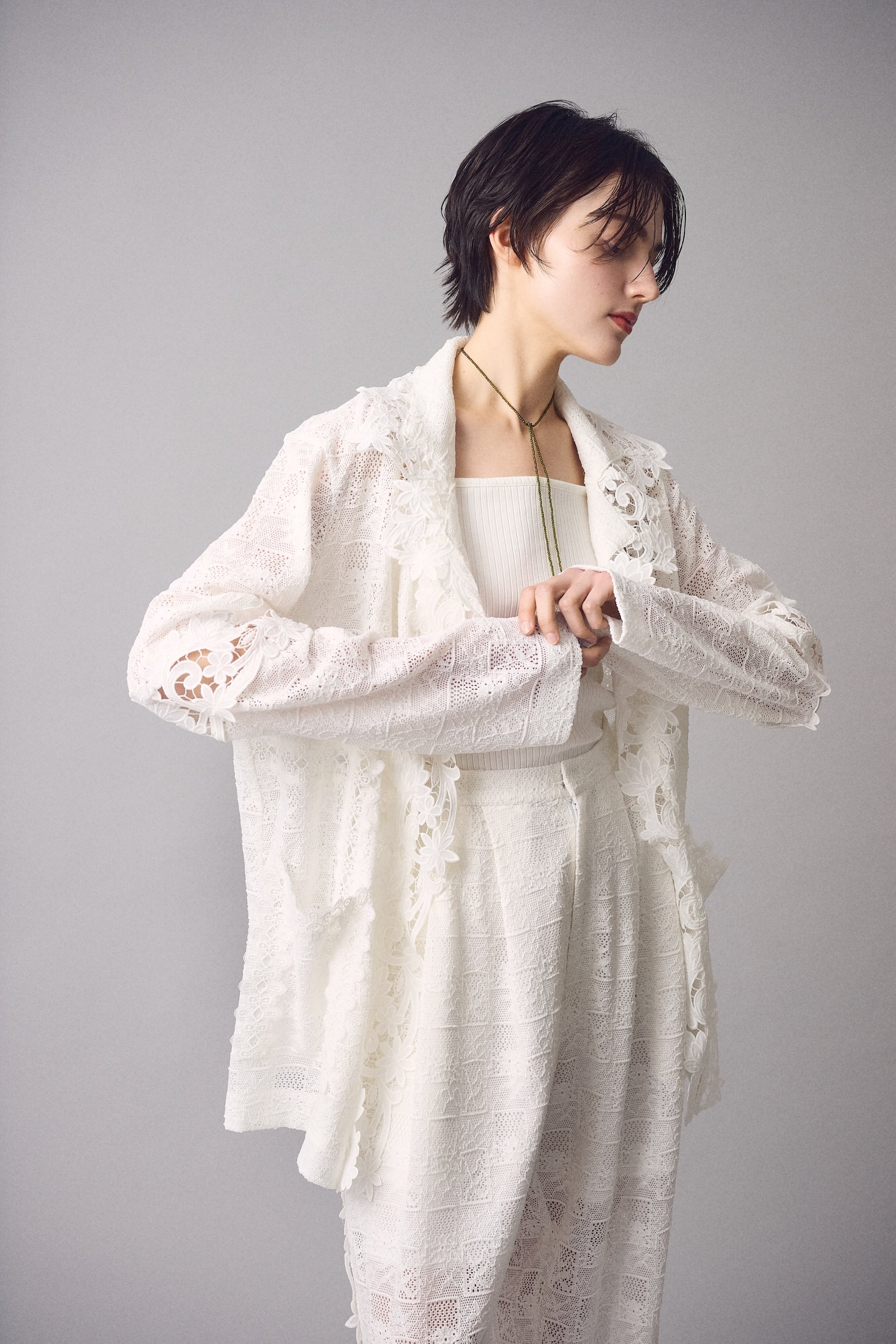 静かに広がるレースの花影が、まとう人の輪郭をやわらかく彩るジャケット。