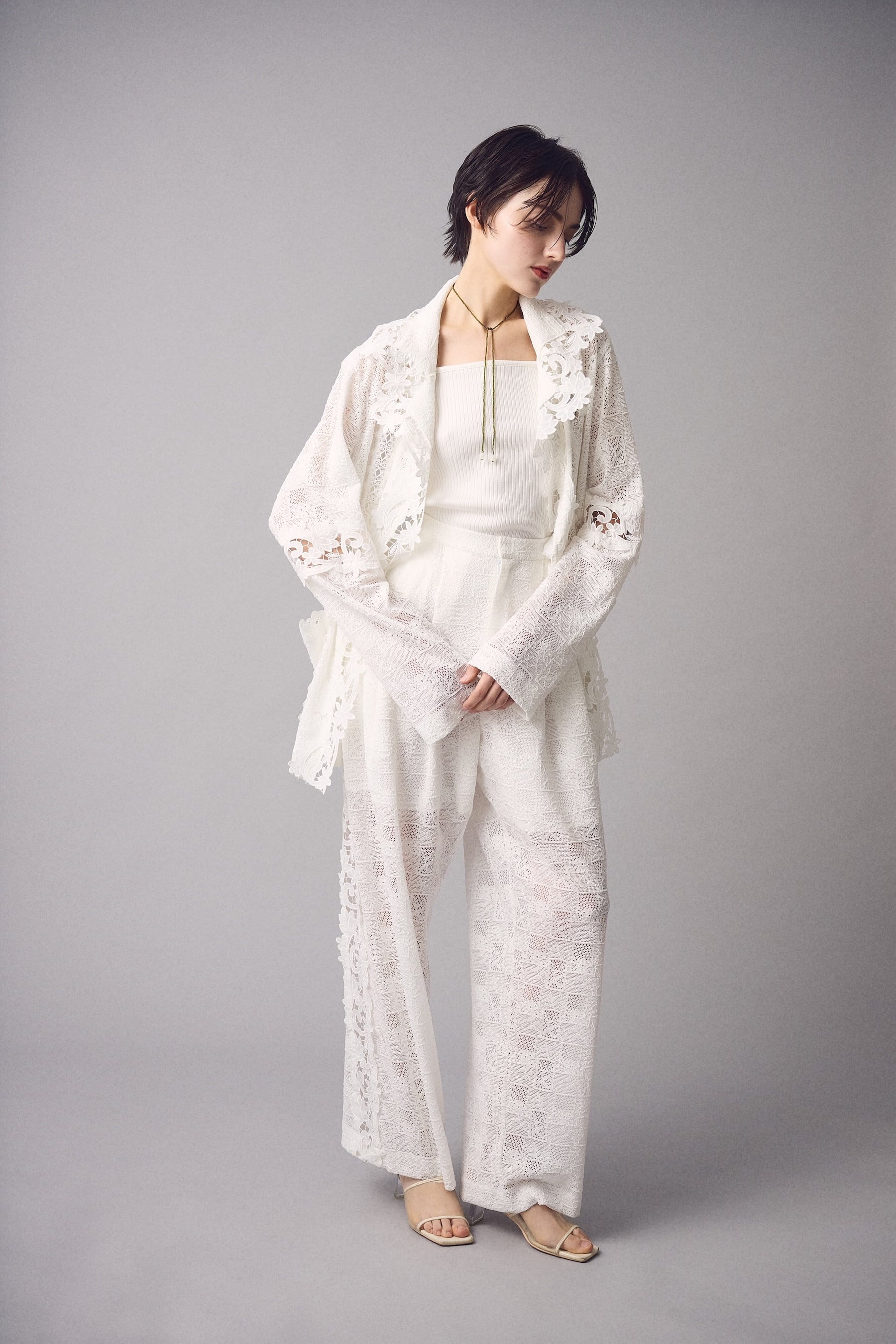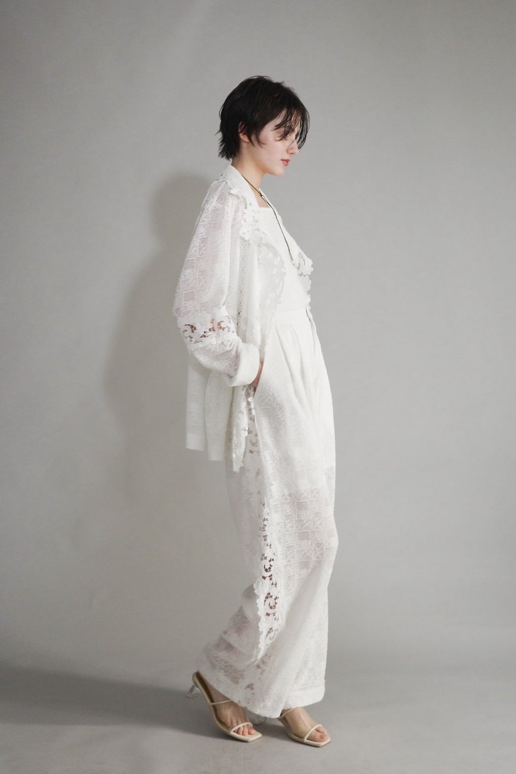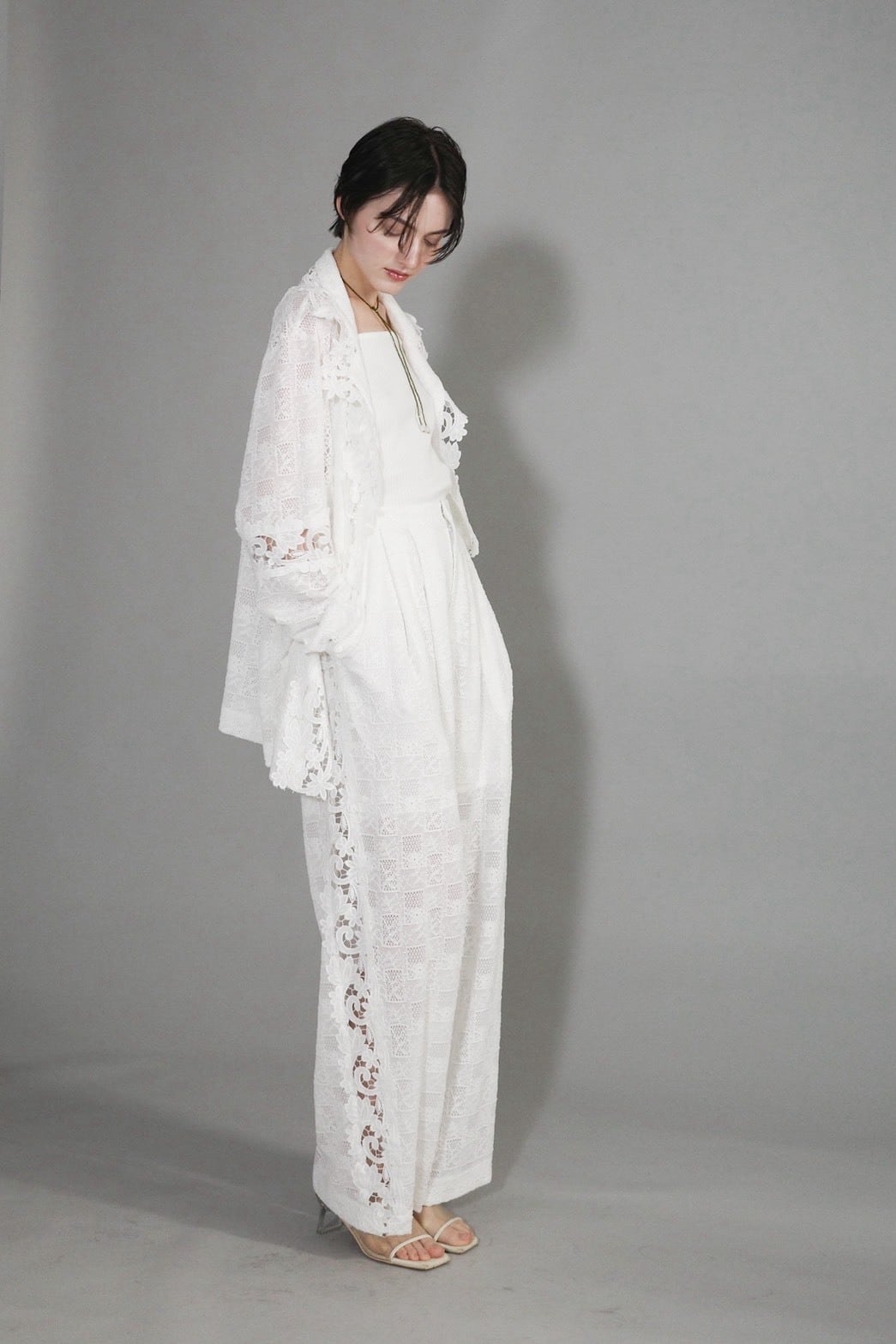 重なるレースの陰影が、歩くたびに静かに揺れるパンツ。