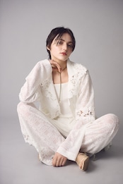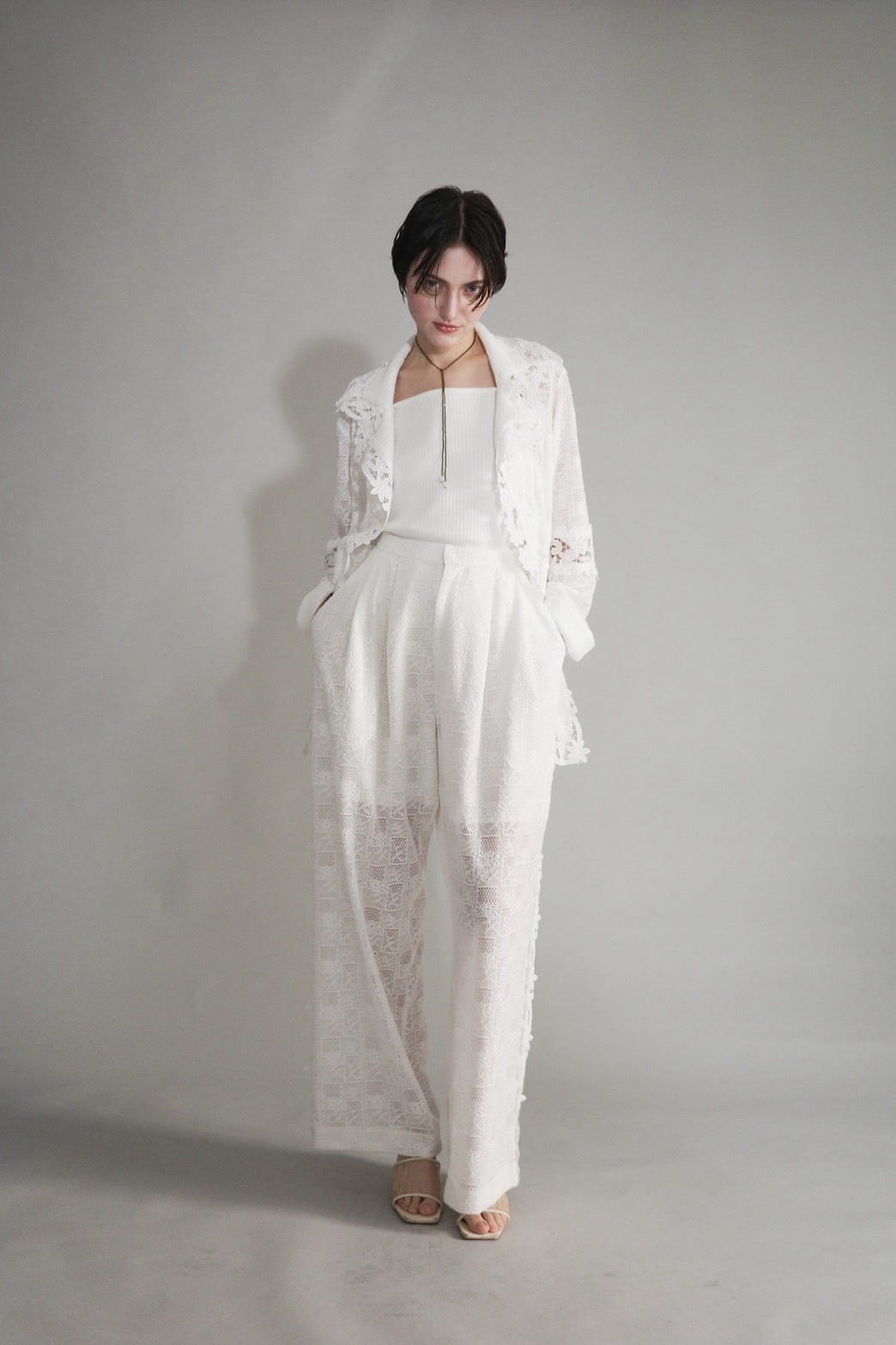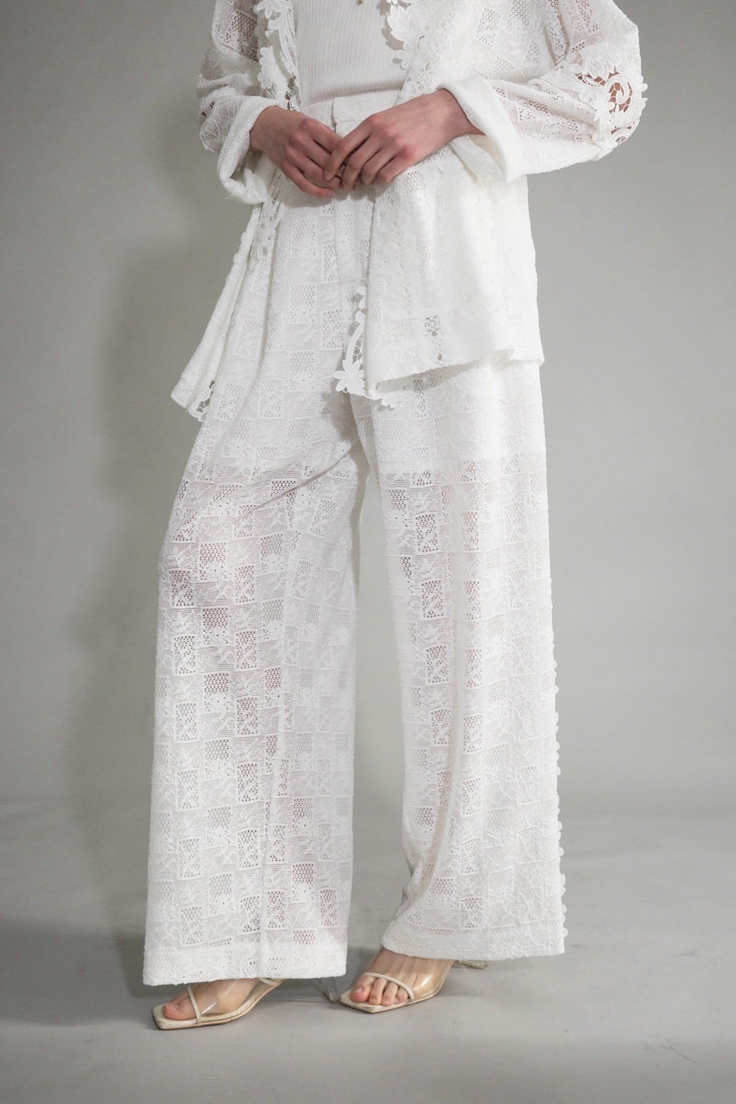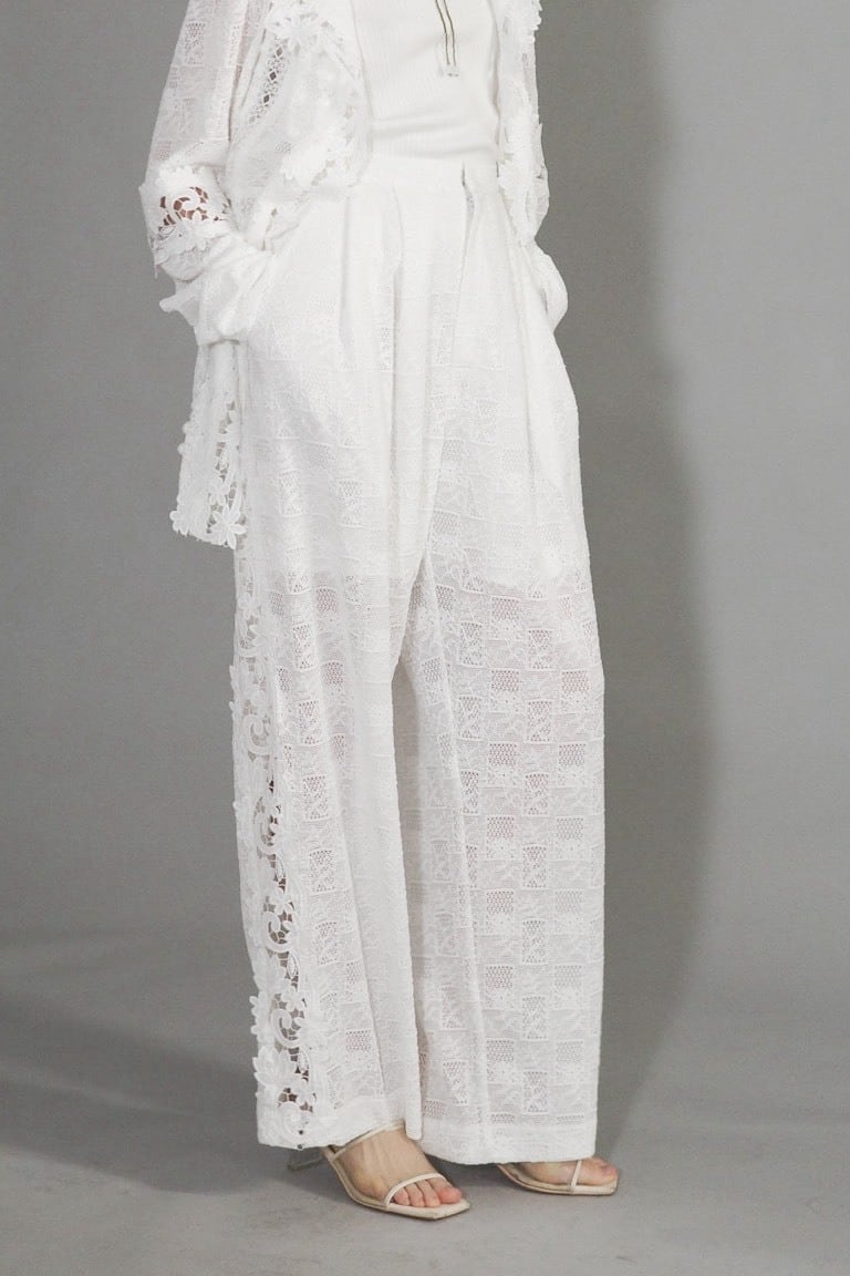異なる素材のレースを丁寧に重ね合わせ、繊細な透け感と奥行きを描いたパンツ。