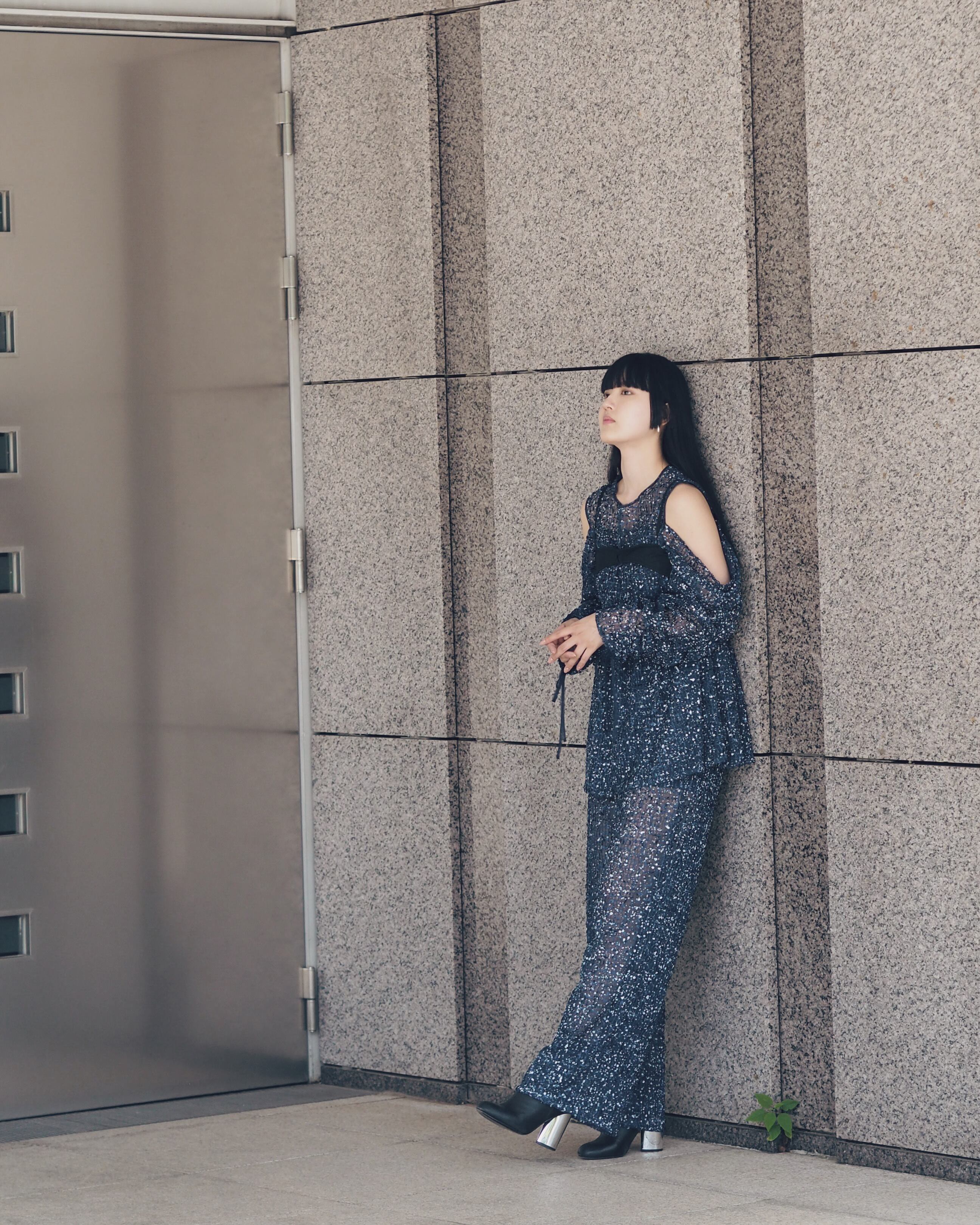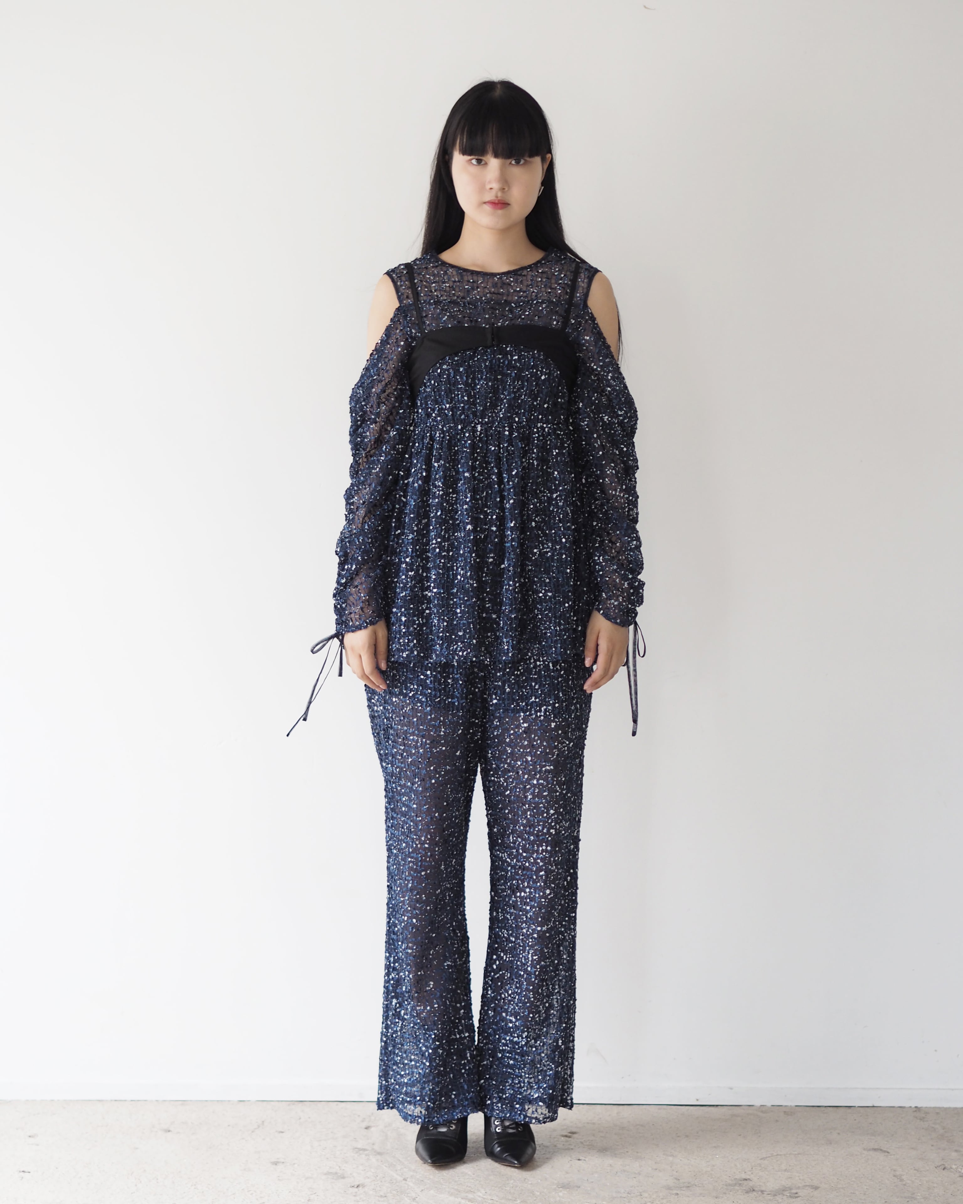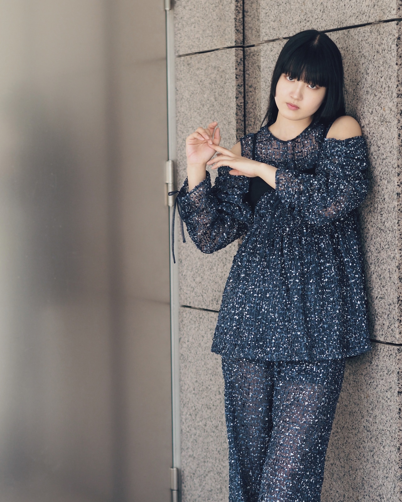 ブラウスは肩が覗くカッティングと、袖口のドローストリングがドラマティックな陰影を生み出し、動きに合わせて光と空気を纏います。