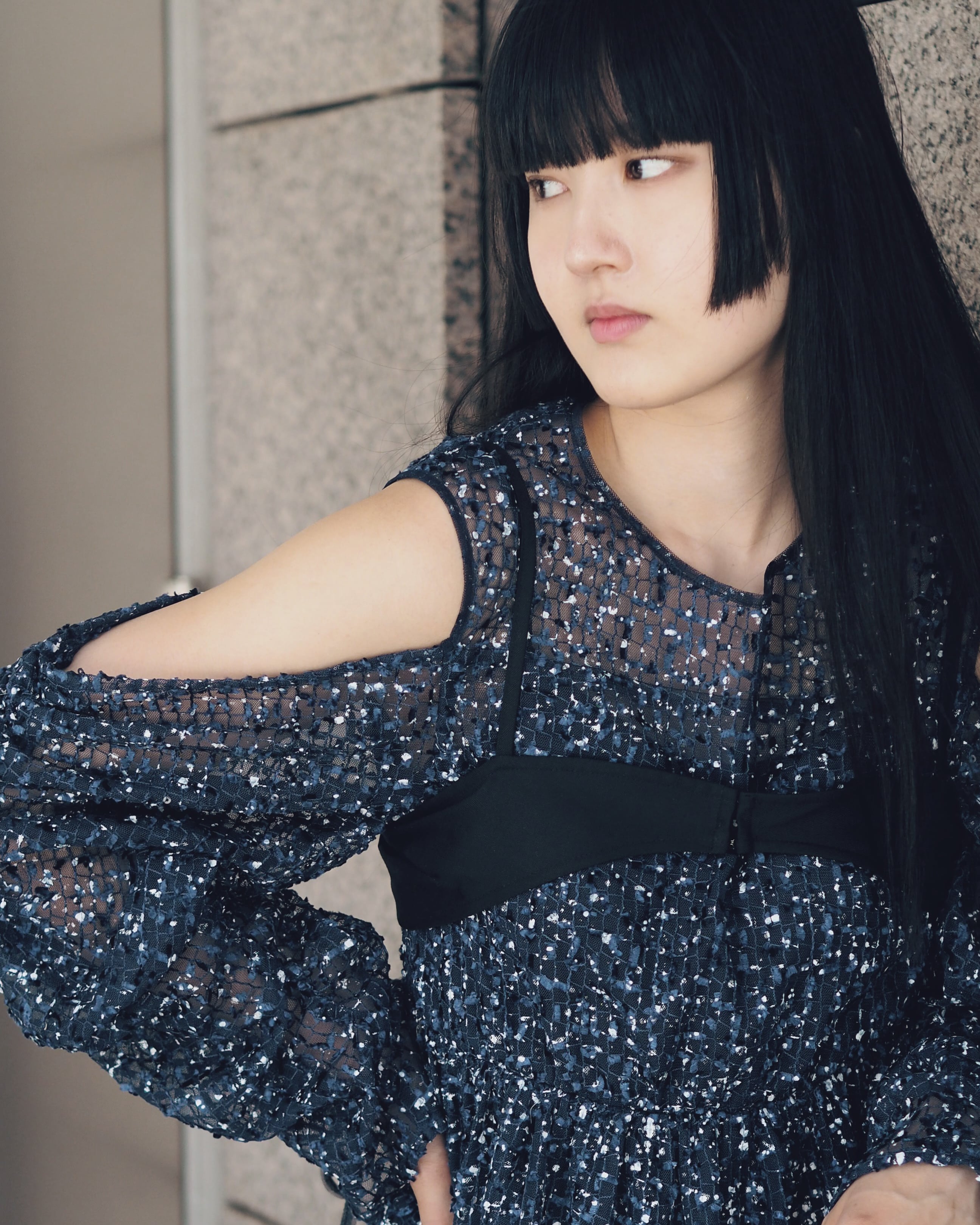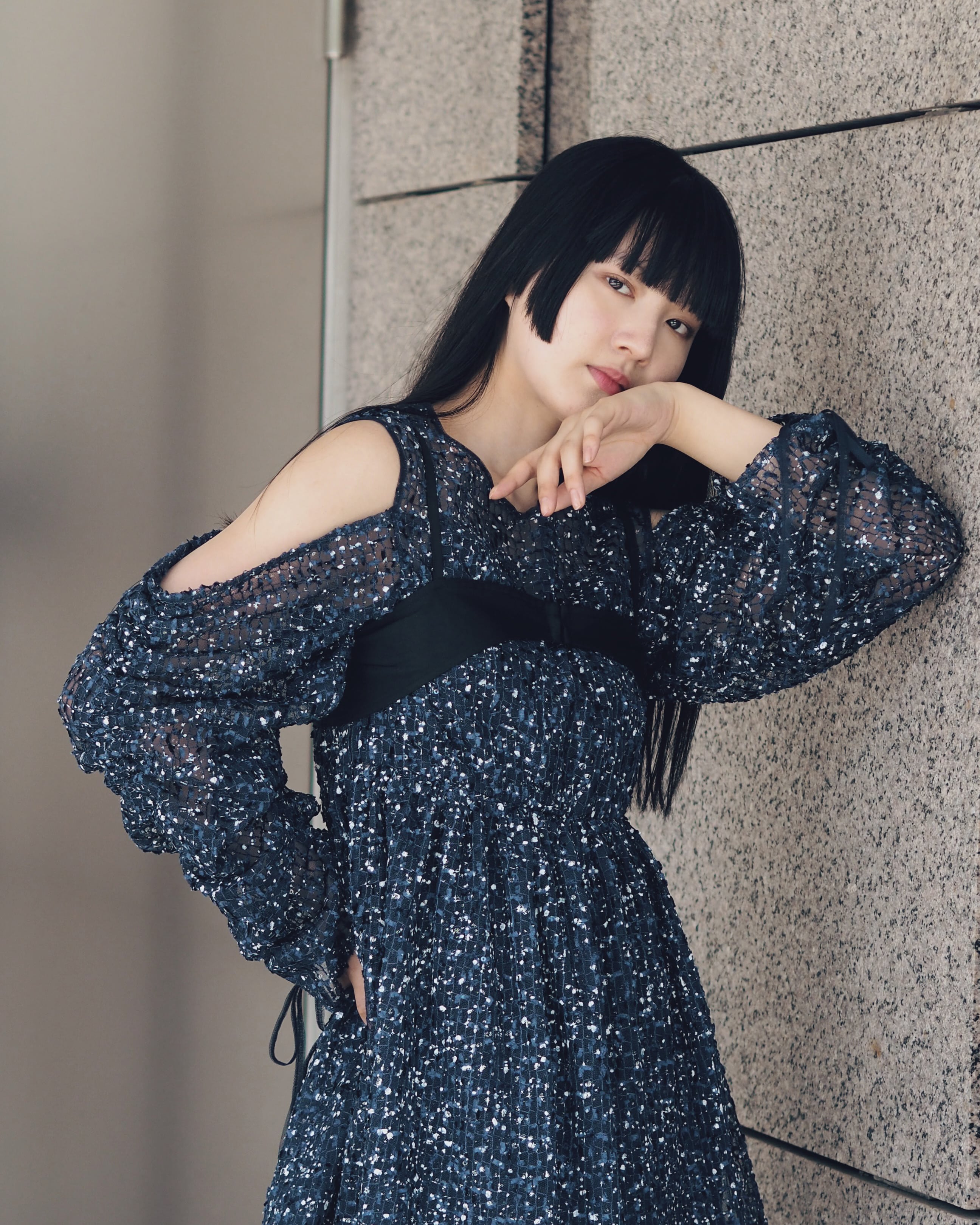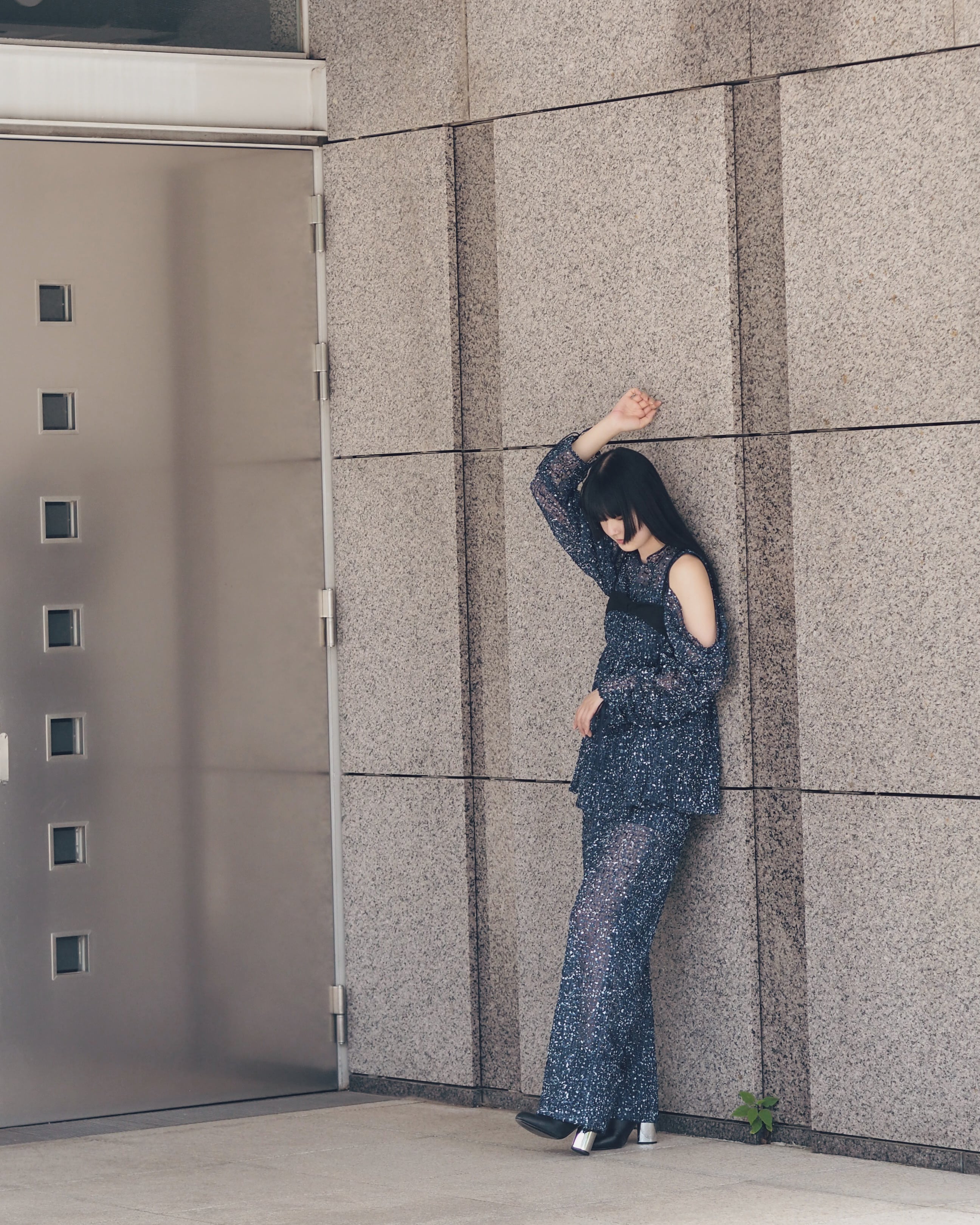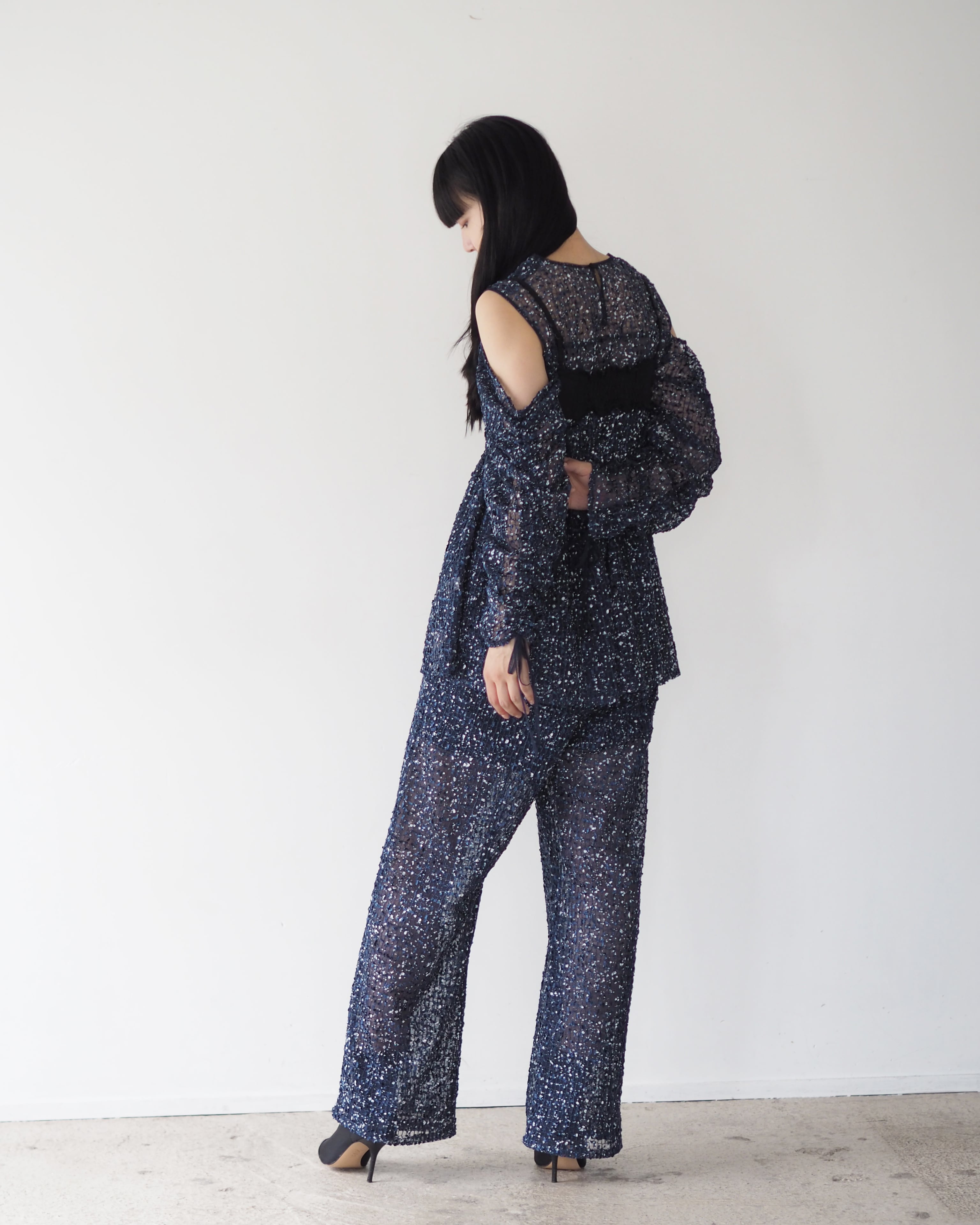 ブラウスは肩が覗くカッティングと、袖口のドローストリングがドラマティックな陰影を生み出し、動きに合わせて光と空気を纏います。