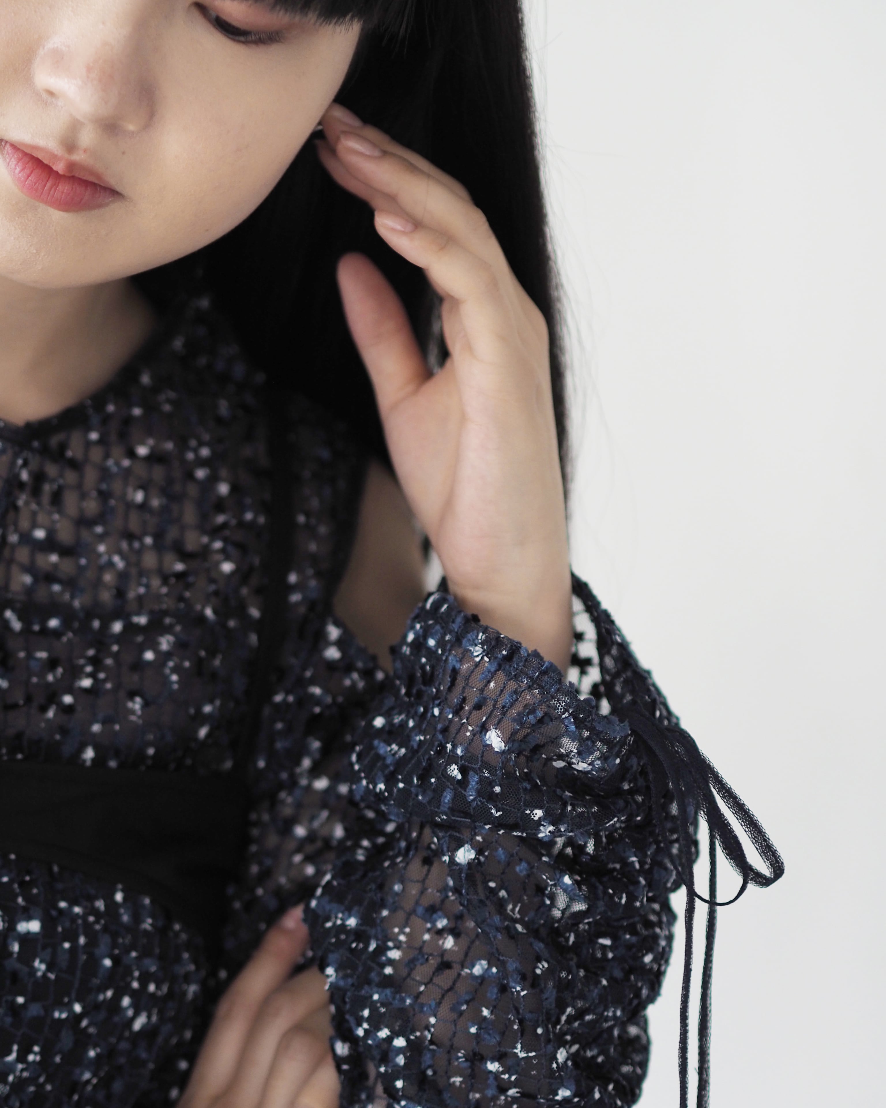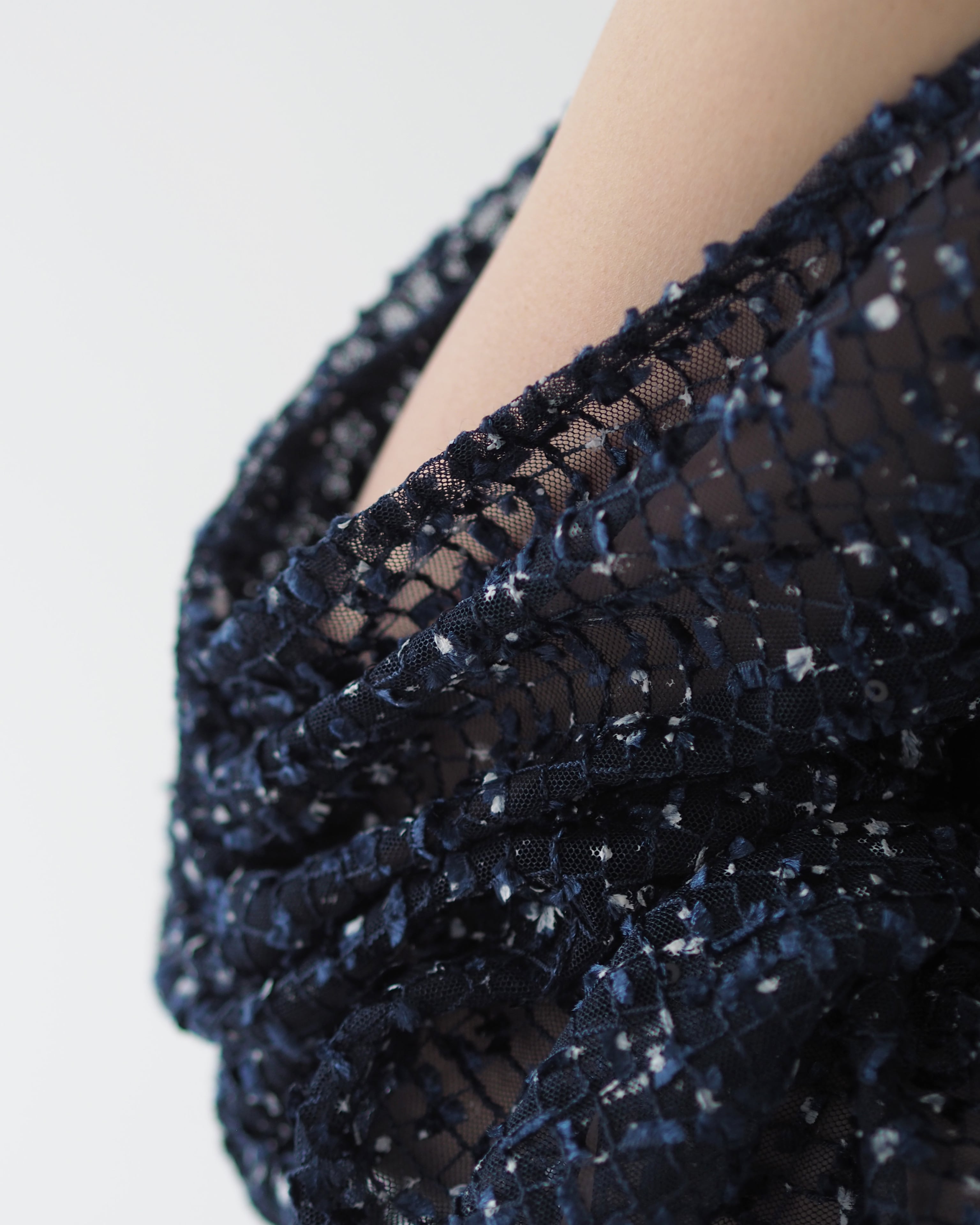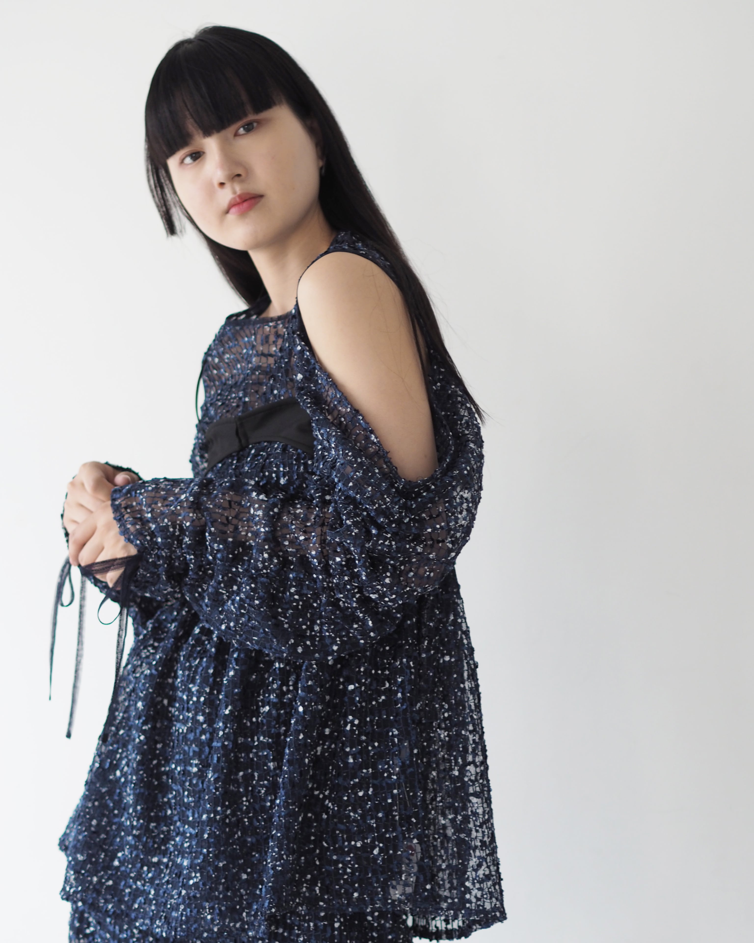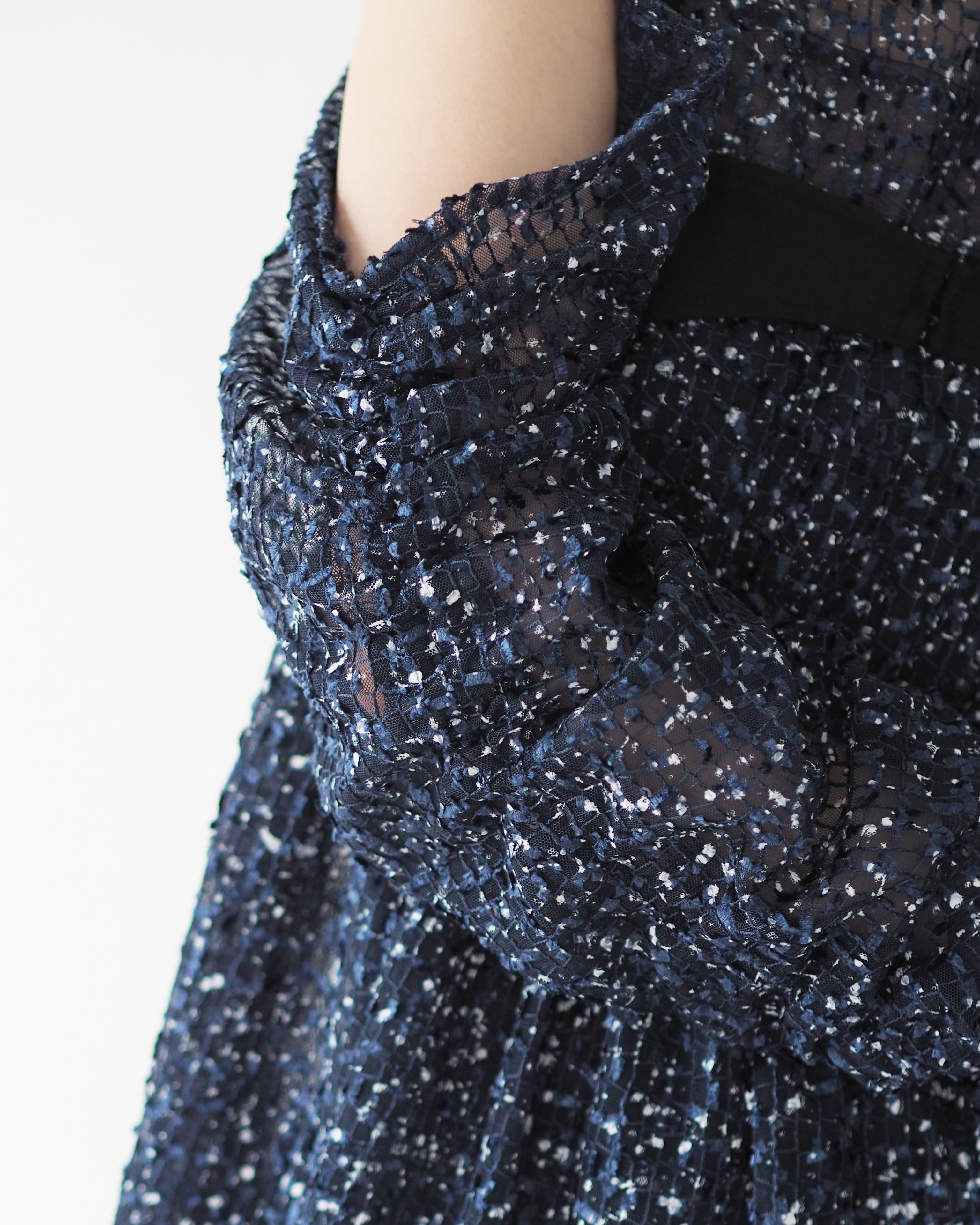 繊細なラメ糸が交差するグリッド状のチュールに、繊細なギャザーをまとったブラウス。
