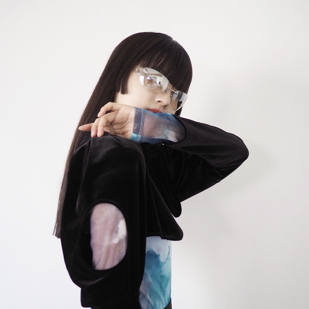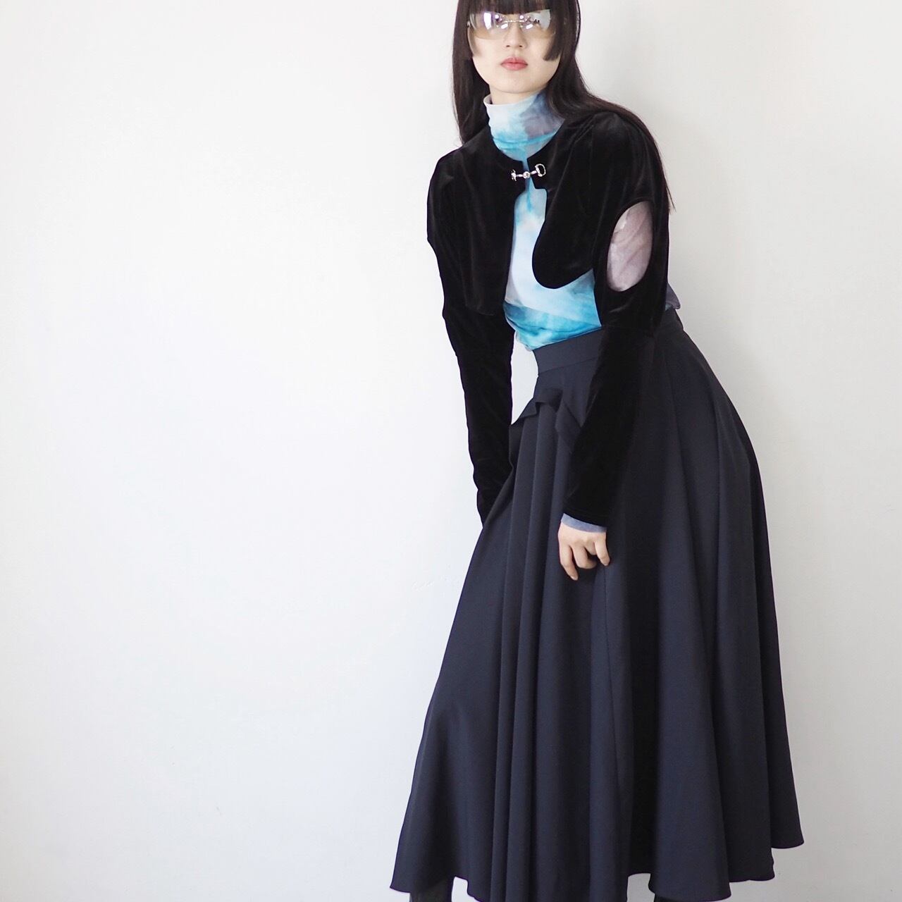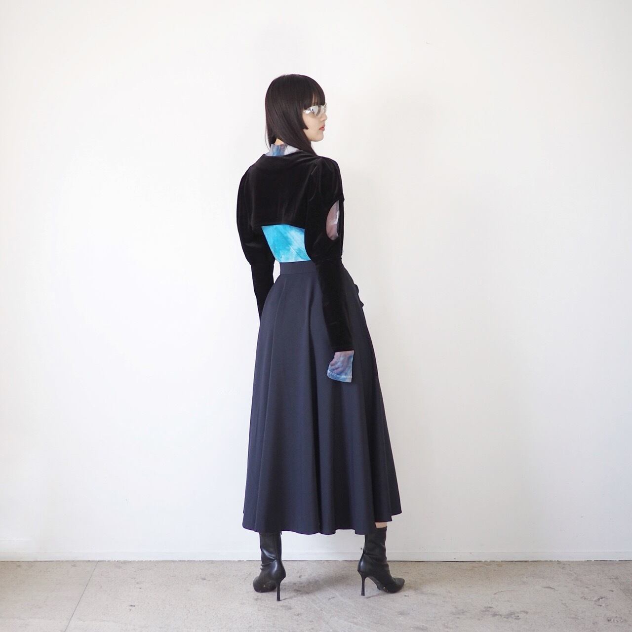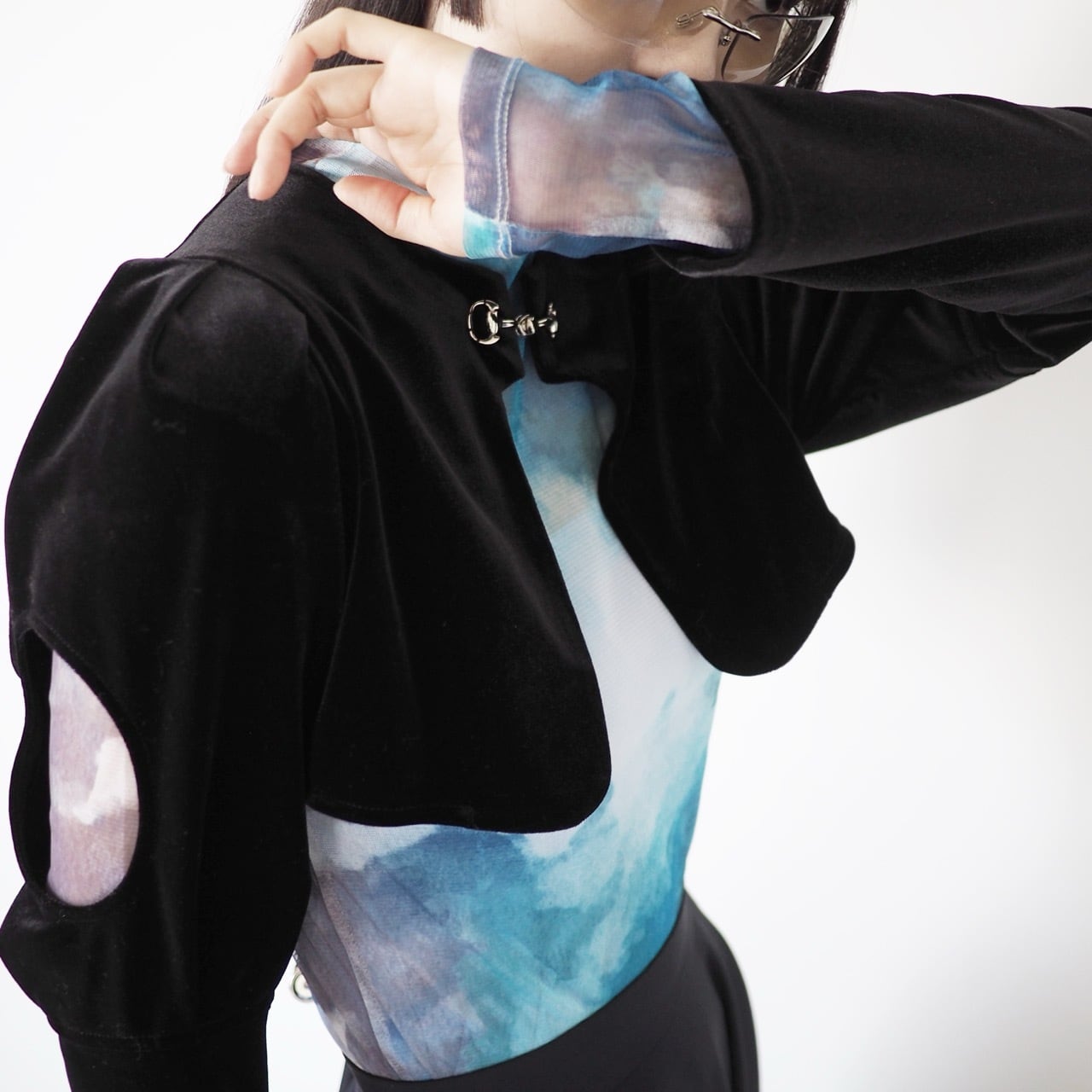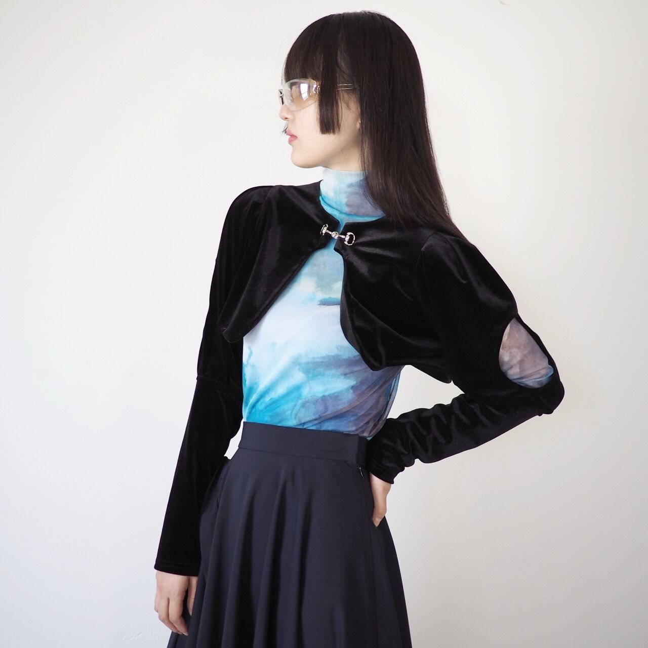 袖部分のカッティング、フロントの二ュアンシーなカーブで魅せるボレロ。